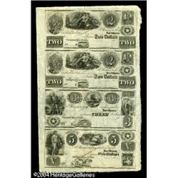 Houston, TX- Treasurer of the Republic of Texas $100 Ju <B>Nacogdoches, TX- Kelsey H. Douglass</B></I> $2-$2-$3-$5 Uncut Sheet 18__ Medlar 2-2-3-4<BR>Here is a rare uncut sheet of scarce Texas notes from a thriving mercantile owner, who was respected enough for his notes to be accepted at par locally. Unfortunately, he died suddenly in 1840, and his wife went bankrupt paying off his liabilities. The sheet has a few minor edge tears, but all four notes are virtually pristine. Each note carries a single "X" pen cancellation. <B>Crisp Uncirculated.</B></I> <BR><BR><B>Important notice:</B> Heritage usually auctions material at the rate of 200-250 lots per hour. On some occasions eBay Live bid software or the Internet may not be able to keep up with the pace of the auction. We recommend placing a realistic absentee bid now as insurance to avoid disappointment. Occasionally the auctioneer may eliminate or reject an eBay Live bid, and the auctioneer may also reopen a lot after the close of the eBay live bidding (usually because we missed an audience bid), and may reject your bid even if it shows you as the winning bidder. By bidding via eBay Live, you agree that Heritage may award the lot to another bidder at its sole discretion under the circumstances described above or any other reasonable circumstances. Since eBay bids are not shown to us until we open the lot on the floor, we treat those bids just like floor bids. In most cases the floor responds before the eBay bid is presented to us, due to Internet lag time, so for consistency we have made it a policy that floor bids are always considered first over tie eBay live bids. Also please note that all Heritage lots purchased through eBay Live carry a 20% Buyer's Premium. Please make sure you read the Terms and Conditions before you bid. This lot is being auctioned in conjunction with a live floor auction by Heritage Galleries & Auctioneers. All final auction and invoice information will be supplied by Heritage Galleries & Auctioneers, and all other information should be considered preliminary. Lot:15960