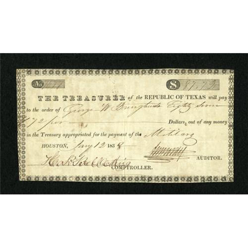 <B>Houston, TX- Treasurer of the Republic of Texas </B></I>$87.72 Jan. 12, 1838 Cr. HW-7 Medlar 16 Olson 348<BR> This example sports nice edges and paper for the grade of <B>Very Fine.</B></I><BR><I>From The William A. "Bill" Bond Collection</B></I><BR><BR><b>Shipping:</b> Coins & Currency (<a target="_blank" href="http://www.heritageauctions.com/common/shipping.php">view shipping information</a>)