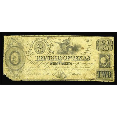 <B>Houston, TX- Treasurer of the Republic of Texas</B></I> $2 183? Cr. H25 Medlar 51<BR> Authorized to supplement the "Star Note" series which were issued in denominations of $5 and higher, this issue of "Change Notes" was issued in $1, $2, and $3 denominations and only in September of 1838. The total issue authorized was only $10,000 and surviving examples are rare in any grade. The typical survivor is usually worn and tattered. Rarely offered, this note is apt to excite the many Texas specialists. <B>Very Good,</B></I> CC with missing lower left-hand corner and pinholes.<BR><BR><b>Shipping:</b> Coins & Currency (<a target="_blank" href="http://www.heritageauctions.com/common/shipping.php">view shipping information</a>)