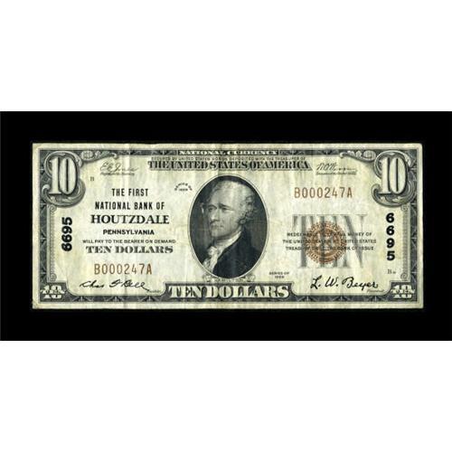 <B>Houtzdale, PA</B></I> - $10 1929 Ty. 1 <B>The First NB</B></I> Ch. # 6695<BR> An exceptionally rare Clearfield County bank with just one large and three small notes recorded in the census to date. The Gengerke data shows the last public offering of any kind from this one bank community coming on a 1989 fixed price list. <B>Very Fine, </B></I>with a couple of miniscule splits that affect nothing. <BR><BR><b>Shipping:</b> Coins & Currency (<a target="_blank" href="http://www.heritageauctions.com/common/shipping.php">view shipping information</a>)