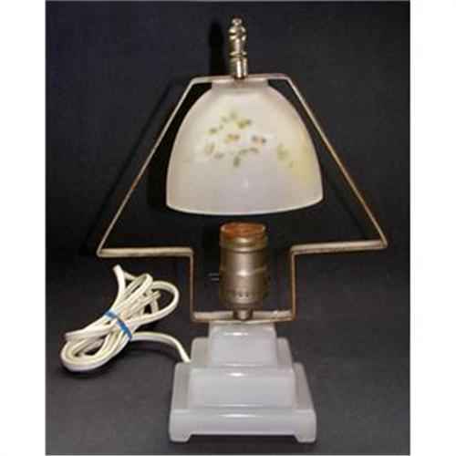 Produced by the Houzex Convex Glass Co., circa 1930s, this outstanding Art deco bedside lamp features a white satin glass shade with revese painted flowers, a stepped milk glass base and its original Art Deco hardware [wiring is modern]. Shown and described on pgs 194-195 of Whitmeyer's - Bedroom & Bathroom Glassware of the Depression Years. Both shape and base are in excellent condition excepting for a few tiny nicks on the rim of the shade.