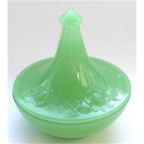 Produced by the L.J. Houzex Convex Glass Co., during the early 1930s, from Jadite green onxglas [their process]. The lid features a tall spear like finial and is embossed with a surround of roses below the spear. The base is footed. A large and rare jar, especially in this brilliant Jadite green color, that measures about 6 x 6 inches and, with the exception of a little rim roughness, is in excellent condition