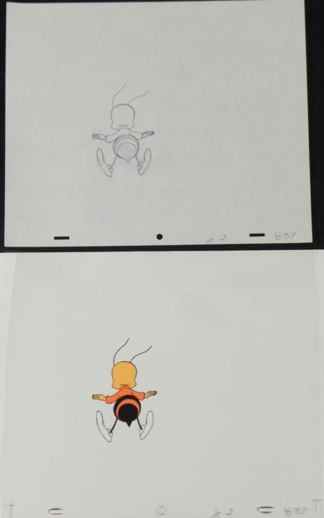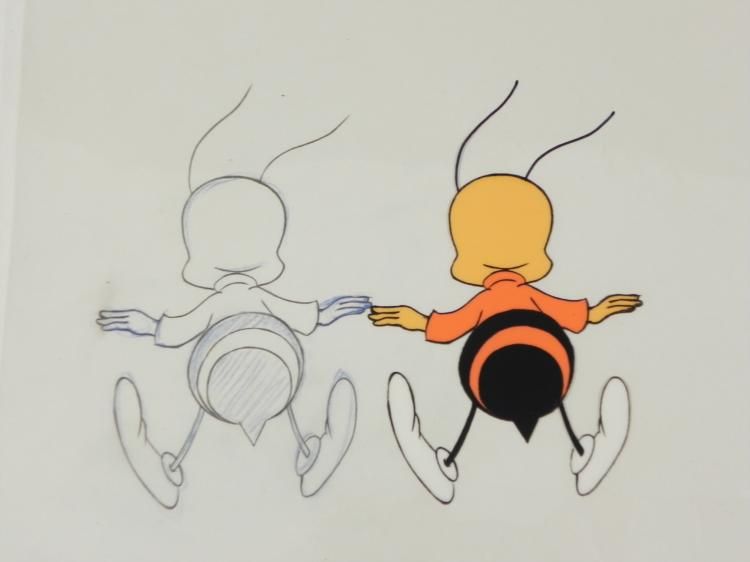Hovering bee! Original Animation Cel & DrawingMedium: Hand painted acetate celDetails: Animation notations and peg holes Original "rough" animation drawing, in non-photo blue and black pencil Size of cel: 10 1/2 x 12 1/2 inchesSize of drawing: 10 1/2 x 12 1/2 inches Condition: Very good This is an original hand-painted cel set-up used in the production of the "Cheerios commercial." Each one-of-a-kind set-up represents a slight change in position of the characters. When individually photographed and projected in rapid succession, the images appear to move. To created production cels, the original animator's drawing is transferred onto an acetate cel (by hand-inking and/or photo copying). The cel is then hand-painted on the reverse side.The cel received may be ever so slightly different then the one shown in the auction photo. Traditional animation is a multi-step process which includes various types of art techniques. Drawings are a key part of the process, in which the animator creates the design and movement of the characters. Drawings are then transferred onto acetate cels (by hand-inking and/or photo copying) to create a production cel, which is then hand painted on the back side, using paint colors chosen and approved by the creator of the series.