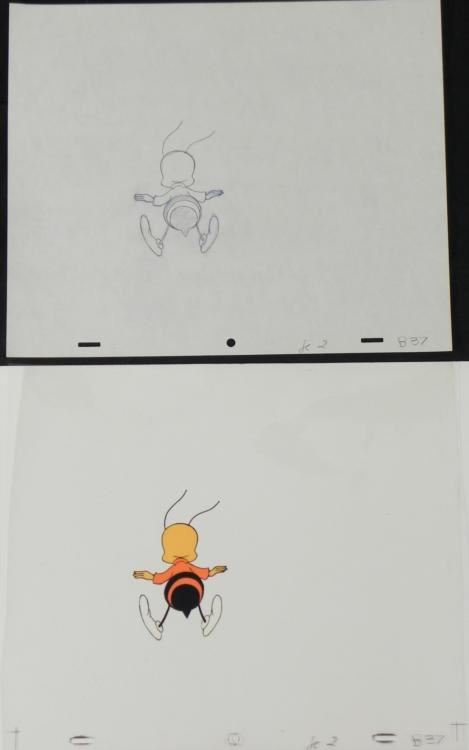 Hovering bee! Original Animation Cel & DrawingMedium: Hand painted acetate celDetails: Animation notations and peg holes Original "rough" animation drawing, in non-photo blue and black pencil Size of cel: 10 1/2 x 12 1/2 inchesSize of drawing: 10 1/2 x 12 1/2 inches Condition: Very good This is an original hand-painted cel set-up used in the production of the "Cheerios commercial." Each one-of-a-kind set-up represents a slight change in position of the characters. When individually photographed and projected in rapid succession, the images appear to move. To created production cels, the original animator's drawing is transferred onto an acetate cel (by hand-inking and/or photo copying). The cel is then hand-painted on the reverse side.The cel received may be ever so slightly different then the one shown in the auction photo. Traditional animation is a multi-step process which includes various types of art techniques. Drawings are a key part of the process, in which the animator creates the design and movement of the characters. Drawings are then transferred onto acetate cels (by hand-inking and/or photo copying) to create a production cel, which is then hand painted on the back side, using paint colors chosen and approved by the creator of the series.