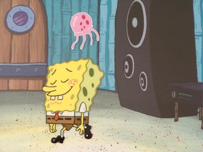 This animation cel and reproduction background are from the Nickelodeon TV show SpongeBob Squarepants. The story takes place under the deep blue sea in Bikini Bottom, where SpongeBob resides. SpongeBob, who is a yellow, porous sponge, is your typical happy-go-lucky character, as he is always cheerful and enjoys making people laugh. Patrick Star, SpongeBob's neighbor who is a starfish, is your average children's show idiot, as he boasts knowing nothing and is often getting himself into ridiculous situations. Between the homes of these two lies the home of the miserable Squidward, a squid, who is known for being grouchy and playing tricks on SpongeBob and Patrick. Both SpongeBob and Squidward work at the Krusty Krab, a fast food business run by the greedy money-loving Mr. Krabs, a crab, the arch rival of the evil, possibly misunderstood, Plankton. Another neighbor, Sandy Cheeks, an athletic squirrel who normally wears an astronaut's space suit, was introduced in "Tea at the Treedome." She spends most of her time inventing and experimenting. Why is the jellyfish hovering over SpongeBob?Original Printed Background and Animated Cel Overall Size of Background: 11" x 17" Overall Size of the Cel: 10 1/2" x 12 1/2" Very good condition This is an original hand-painted cel set-up used in the production of an episode of "SpongeBob SquarePants." Each one-of-a-kind set-up represents a slight change in position of the characters. When individually photographed and projected in rapid succession, the images appear to move.