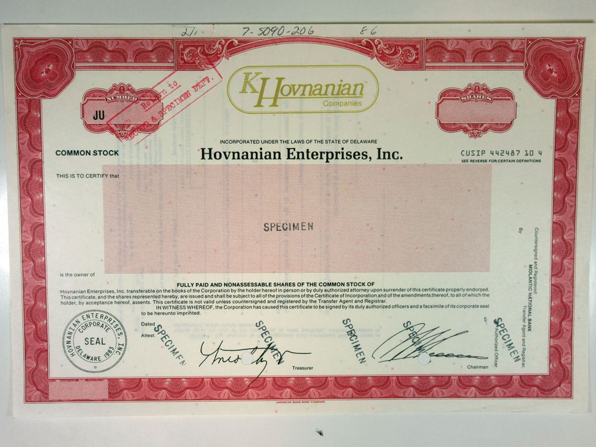 "Return to Record & Specimen Dept." stamp at top. Hovnanian Enterprises, Inc. is a United States real estate company which is involved in every aspect of marketing homes, including design, construction and sales. The company works with individual detached housing as well as higher-occupancy dwellings, including townhouses, condominiums and retirement homes.