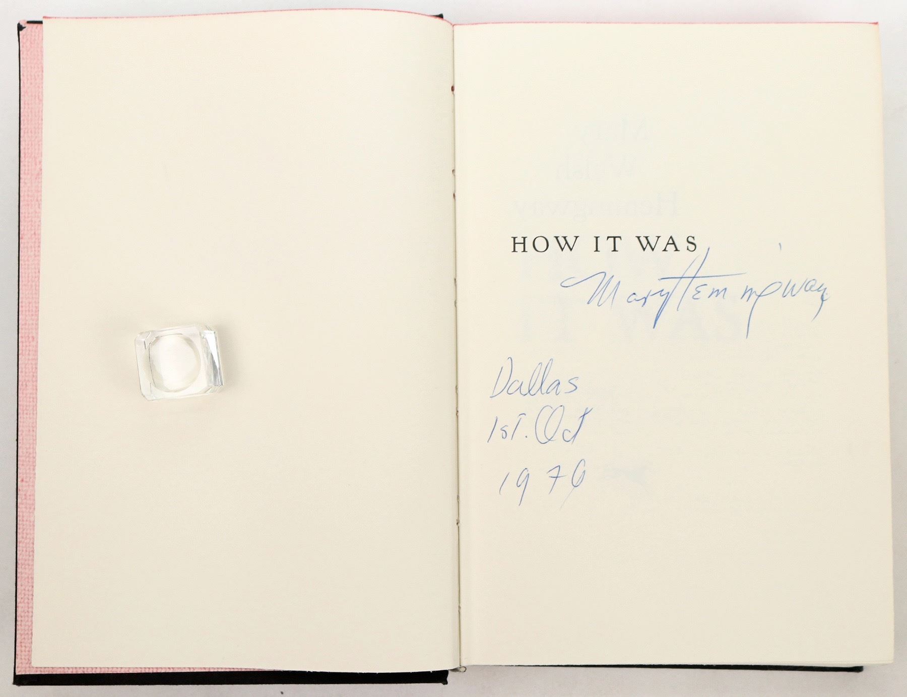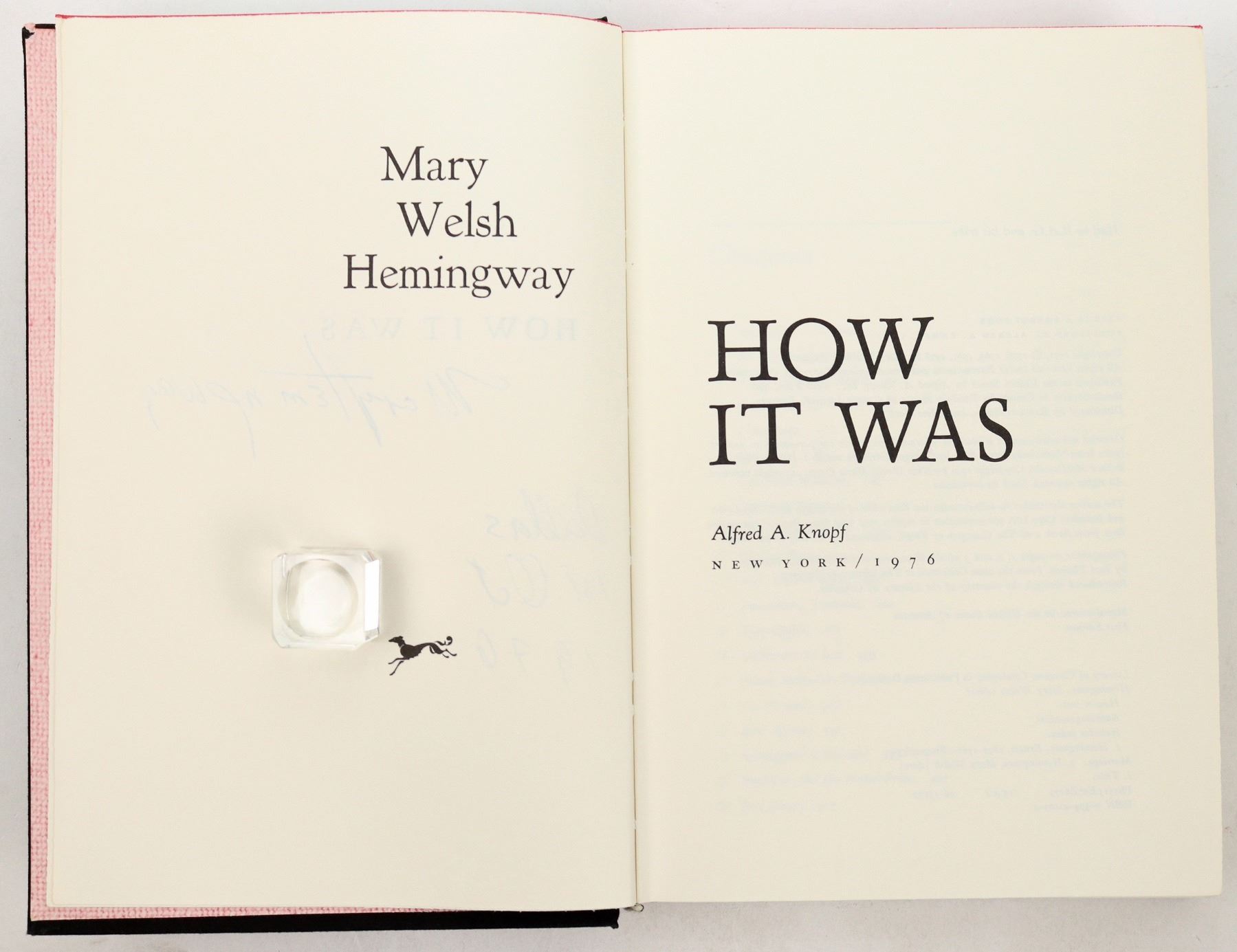 This book "How it Was" by author Mary Hemingway is an autographed first edition 1976. Mary would be Ernest Hemingway's fourth wife and widow. In like new condition without a dust cover, tipped corners. pp. 537, black canvas cover. The photography is spectacular. A memoir written from the spouse of a troubled man.