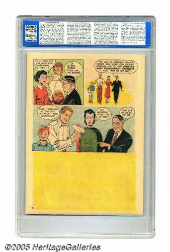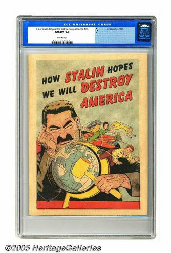 <B>How Stalin Hopes We Will Destroy America #nn (Joe Lowe Co., 1951) CGC NM/MT 9.8 Off-white pages.</B></I> This great Cold War period piece is a 16-page giveaway comic that doesn't turn up very often -- it's a Gerber "7." And look at the grade -- we can't remember ever seeing a book with a paper cover certified 9.8 before. This is the highest-graded of the mere four copies that CGC has certified to date. Overstreet 2005 NM- 9.2 value = $600. CGC census 6/05: 1 in 9.8, none higher.
