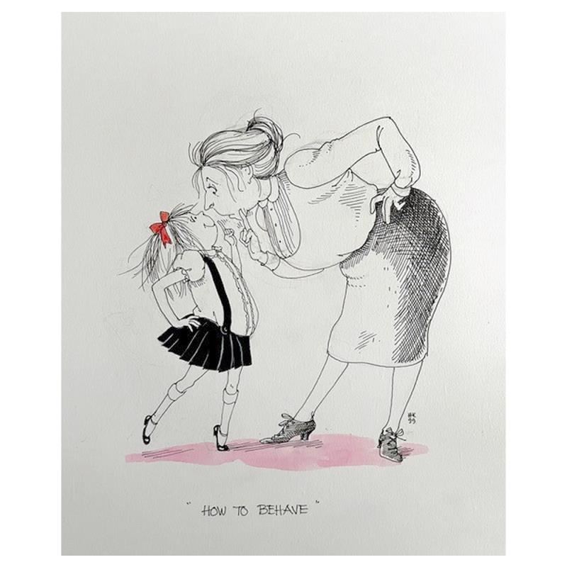 "How to Behave" is an original drawing on art board by Hilary Knight featuring the title character from the classic children's book series, Eloise. This piece was utlized in the 2000 book, Eloise's Guide to Life. The piece is hand signed by the artist and comes with a letter of authenticity. Measures approximately 14.5" x 12".