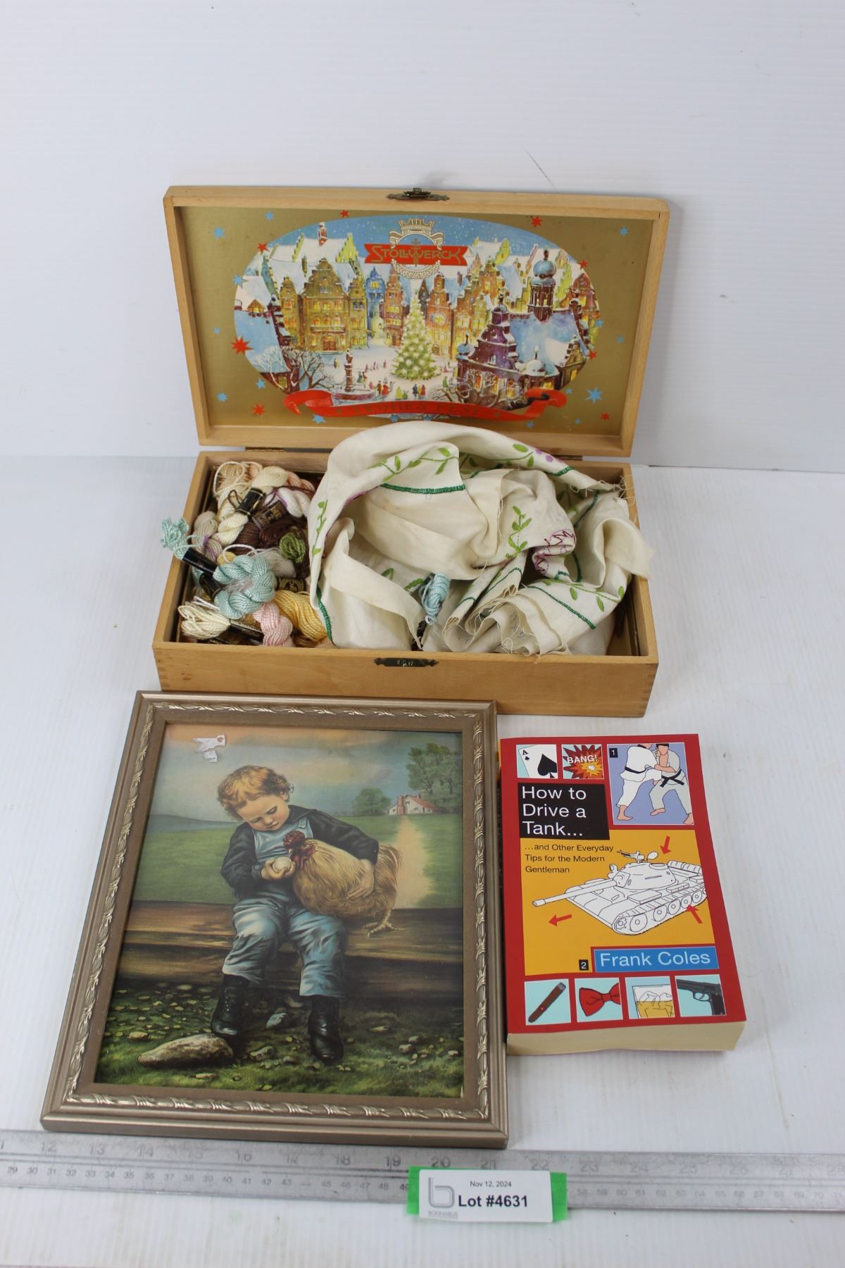 How To Drive A Tank Book, Wooden Stilwerck Box w/ Sewing Contents- 13'' x 8'' x 3'' , Misc.