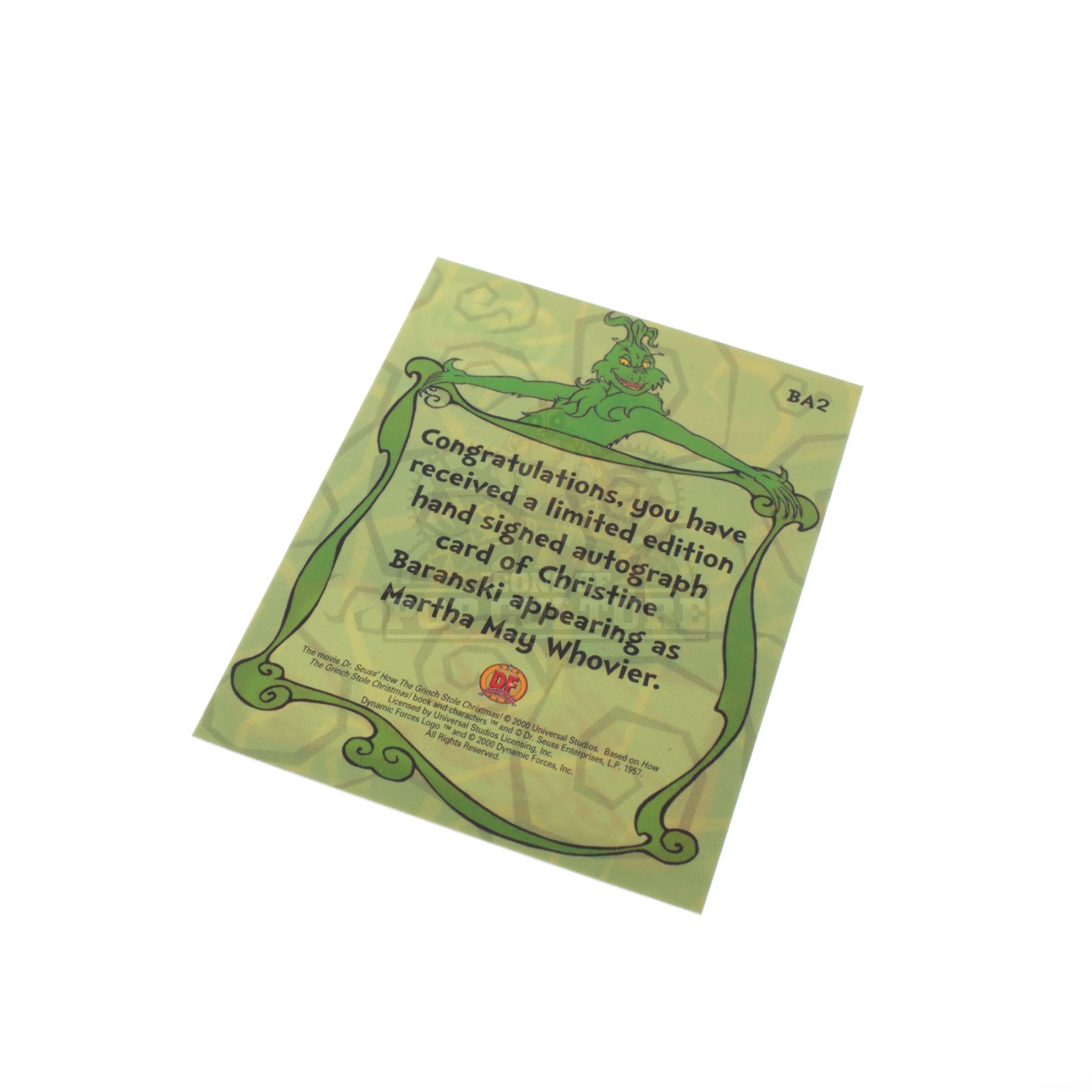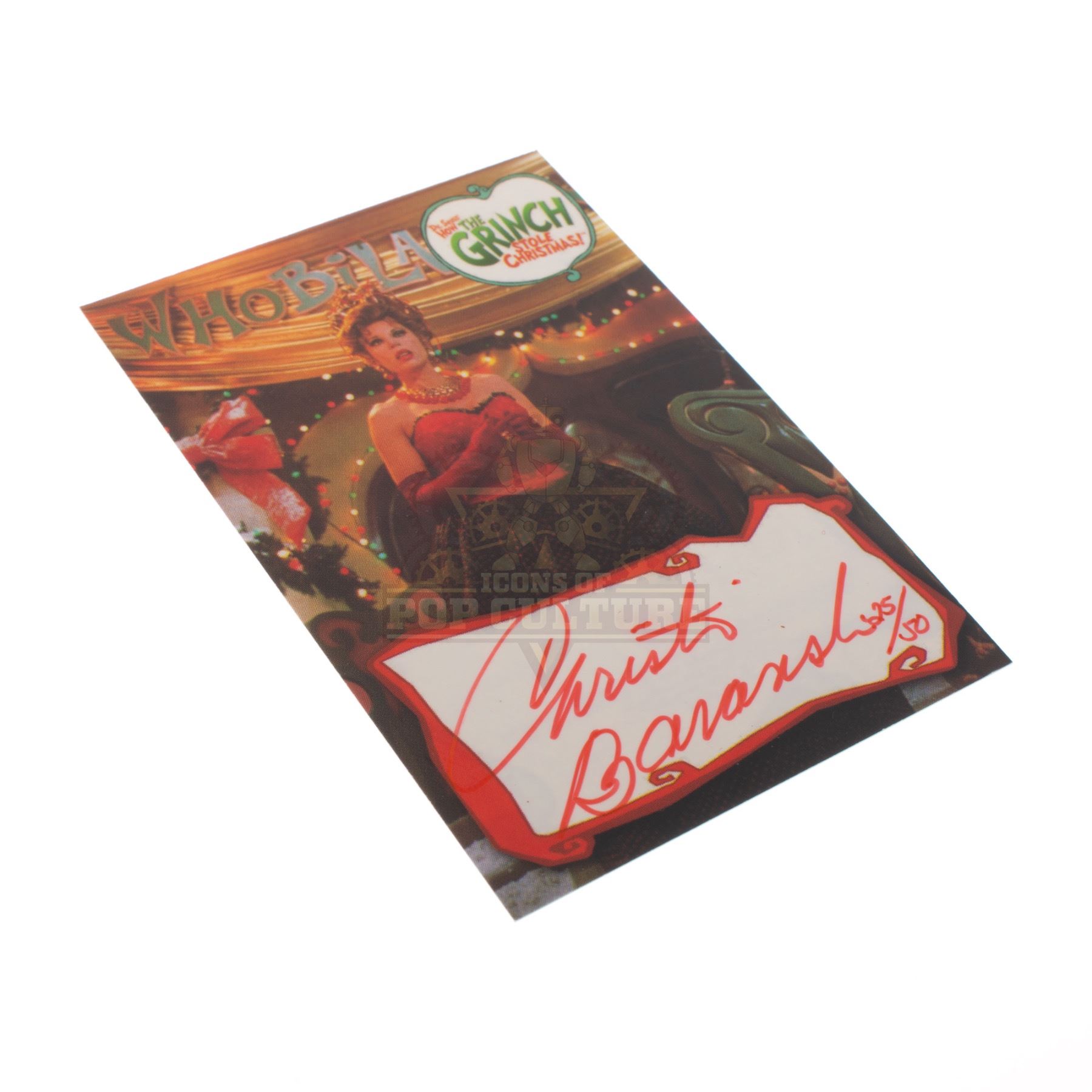 A rare original autographed trading card for the “How The Grinch Stole Christmas” trading card series. Christine Baranski only autographed 50 of these special cards that were randomly inserted in the trading card packs. This card is hand signed by Christine Baranski in red ink and numbered “25 of 50”.