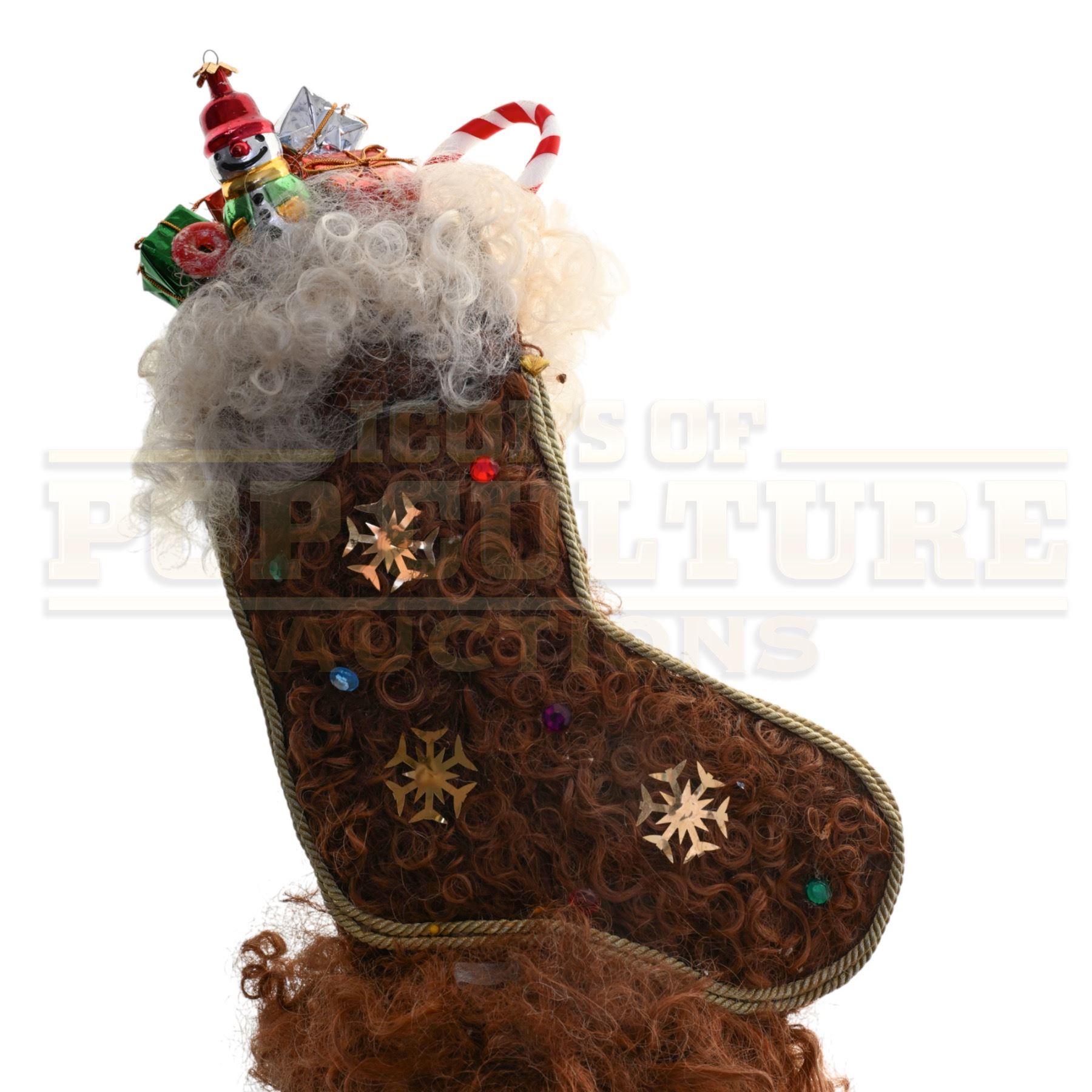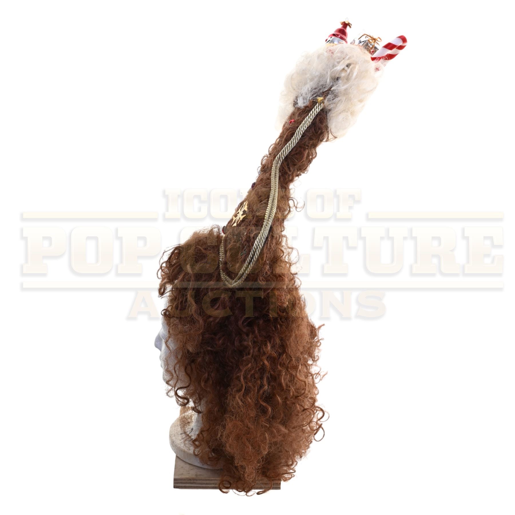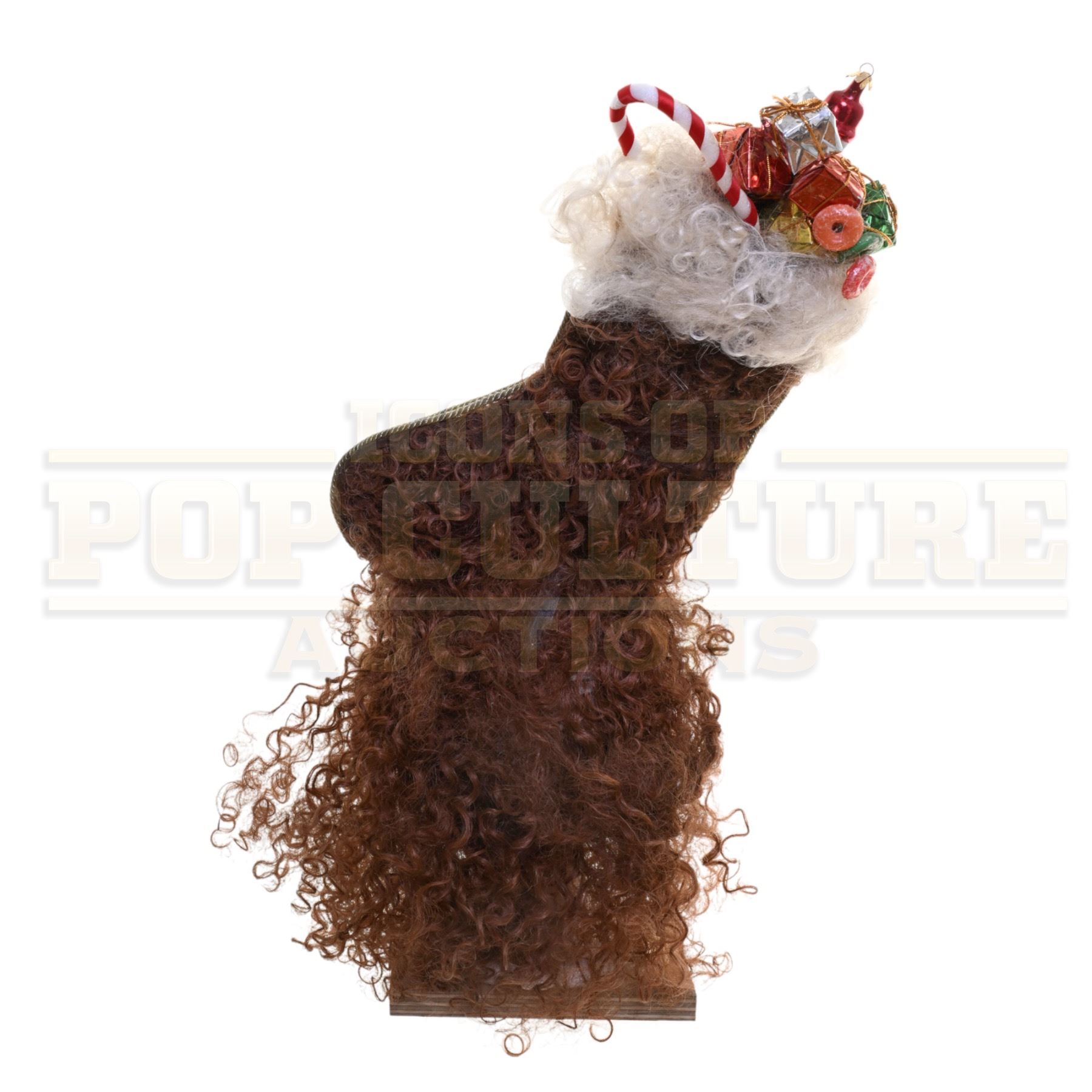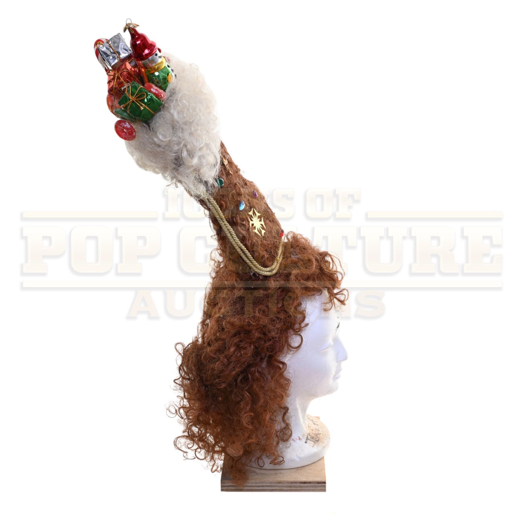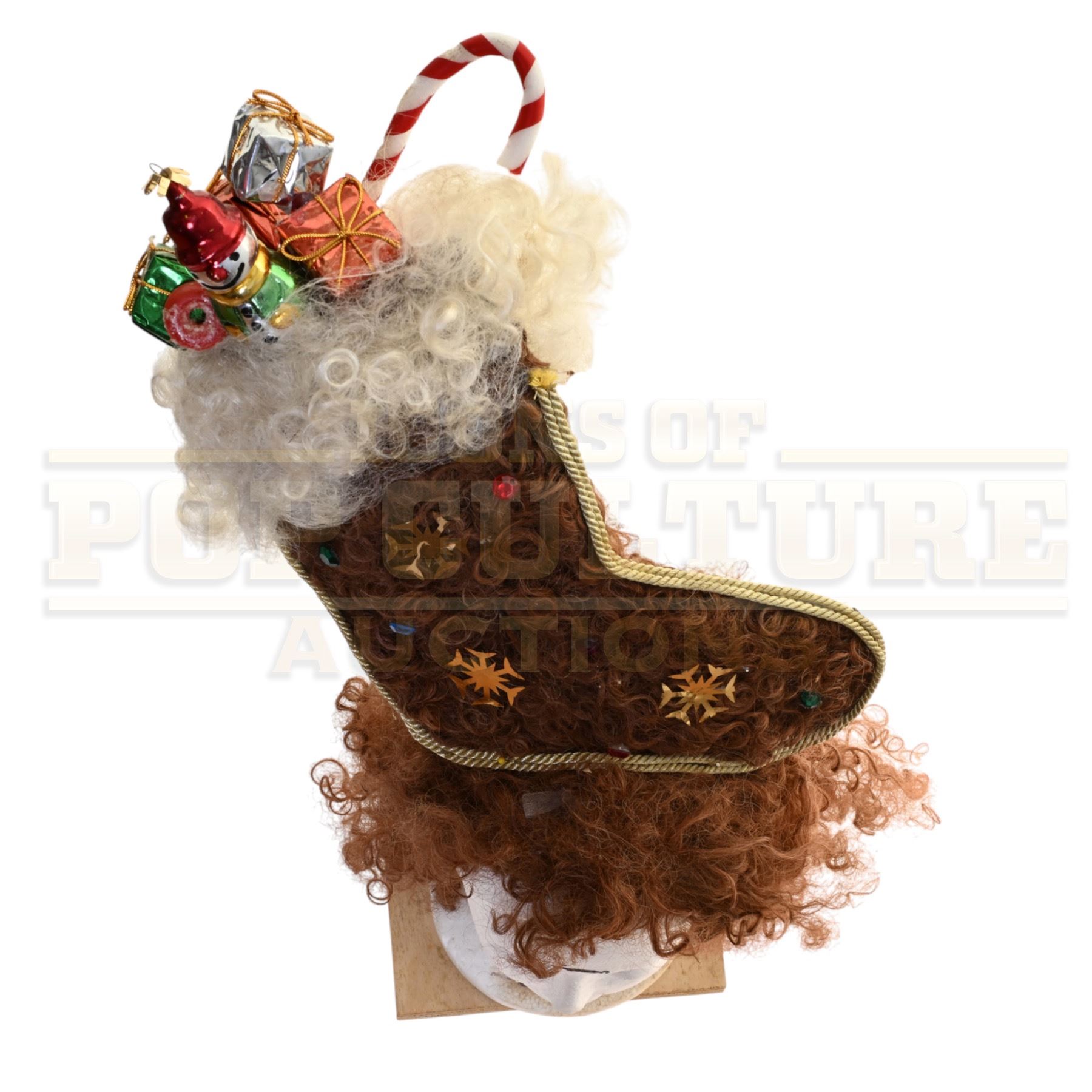 A wonderfully over-the-top Whoville hairpiece created and used in Ron Howard’s beloved holiday classic How the Grinch Stole Christmas (2000). This exuberant screen-used headpiece perfectly embodies the whimsical spirit and exaggerated styling of the Whos, featuring a towering Christmas stocking bursting with festive detail.