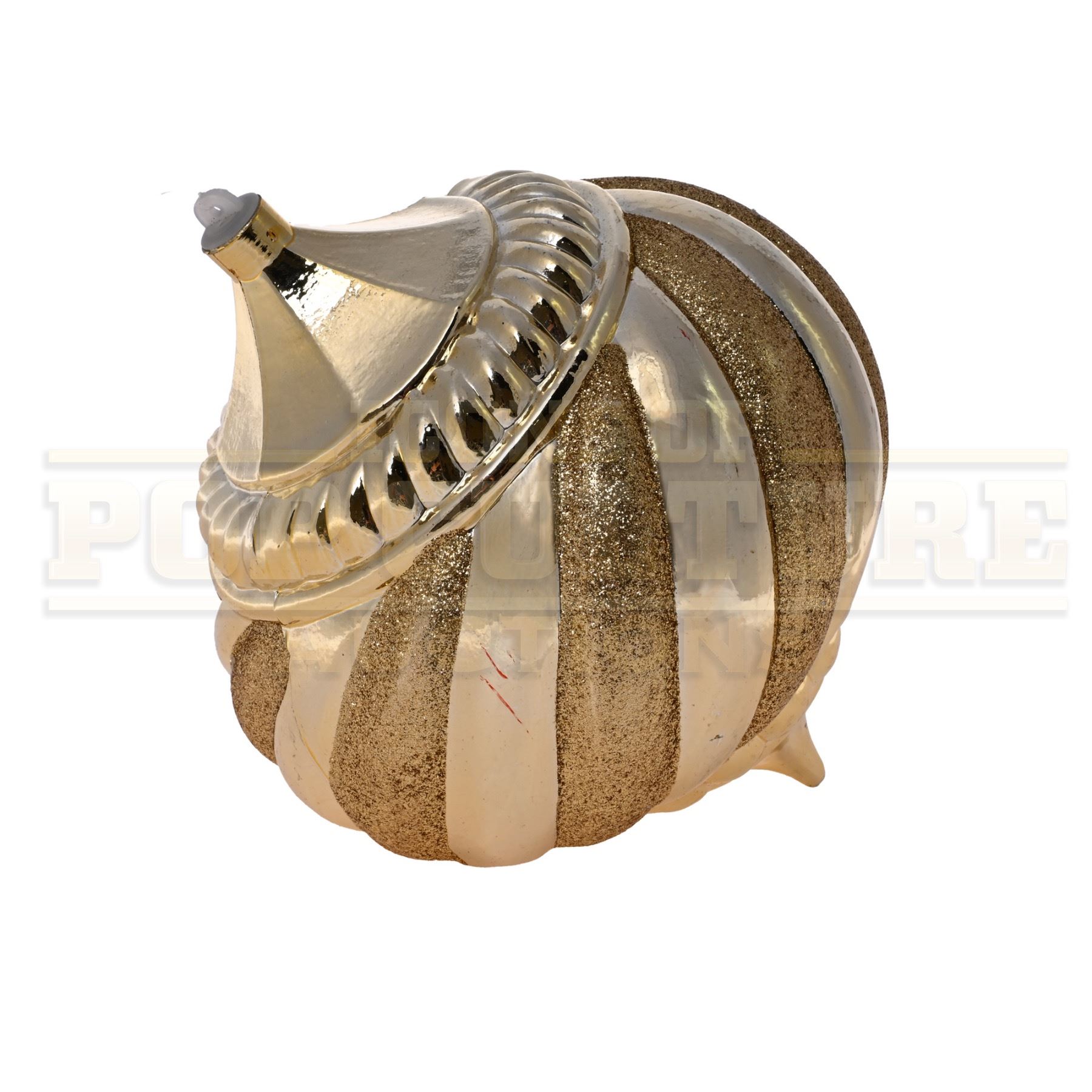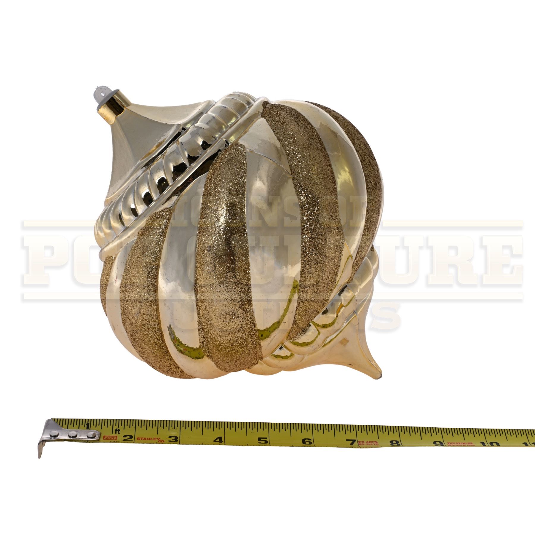 This prop ornament was custom-made by the production for use as set dressing. The large plastic ornament measures 10” x 7” in diameter, with a gold color finish. This style ornament Can be seen is several scenes of the film including the decorating of the Whoville Christmas Tree in the opening of the film.