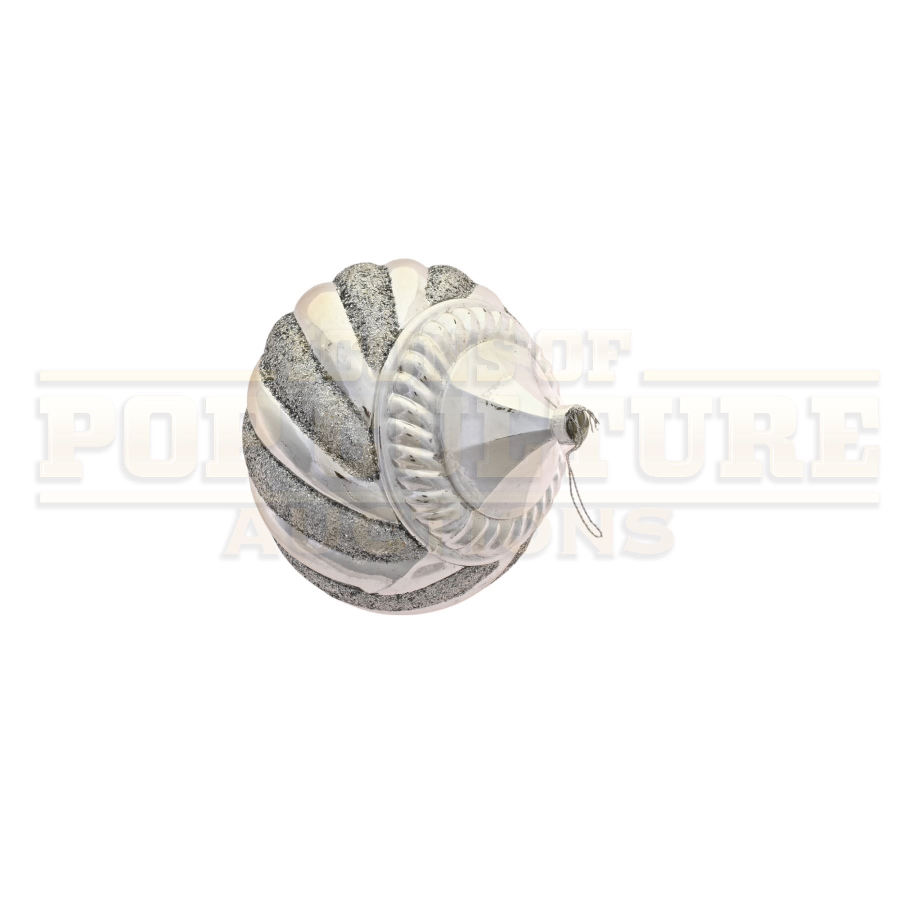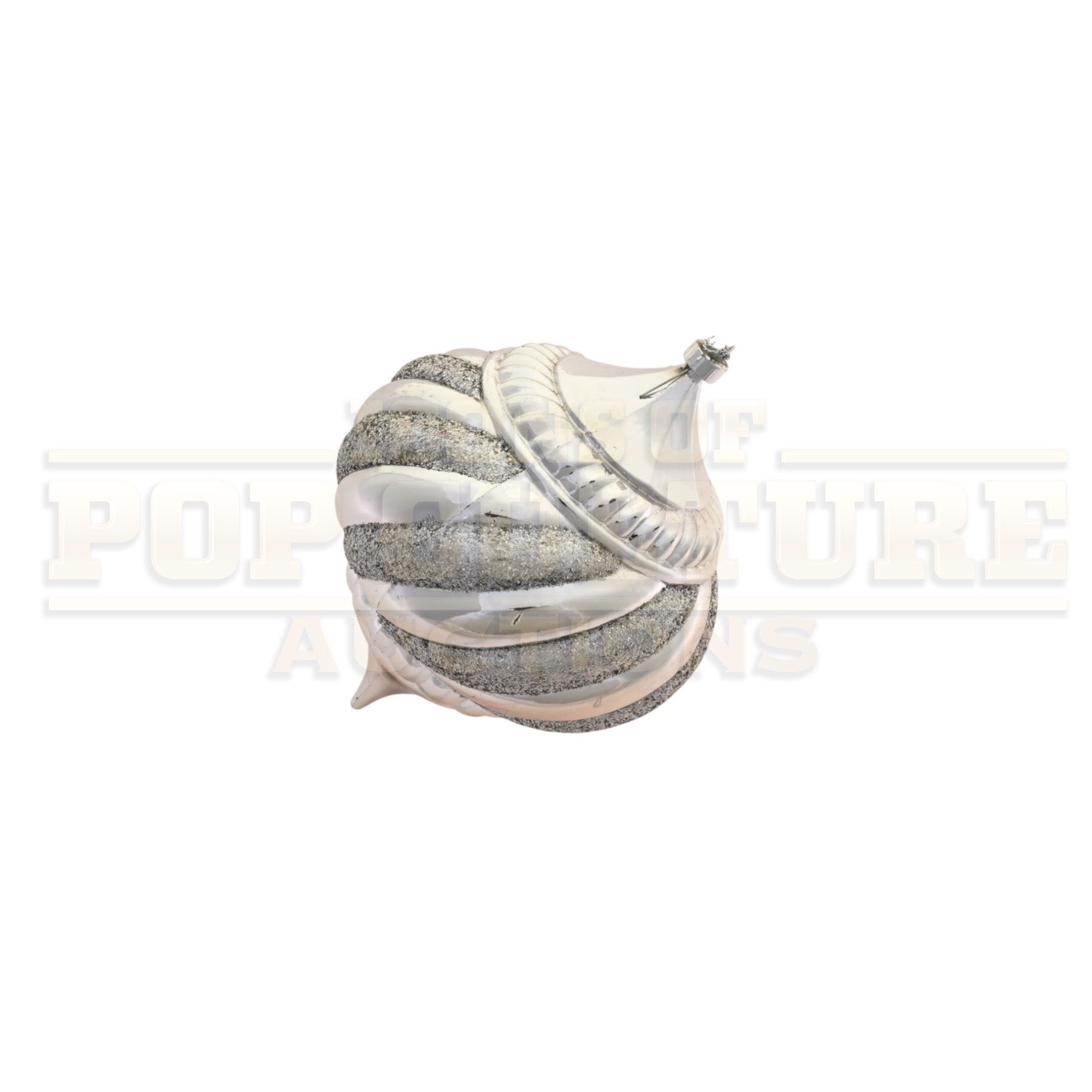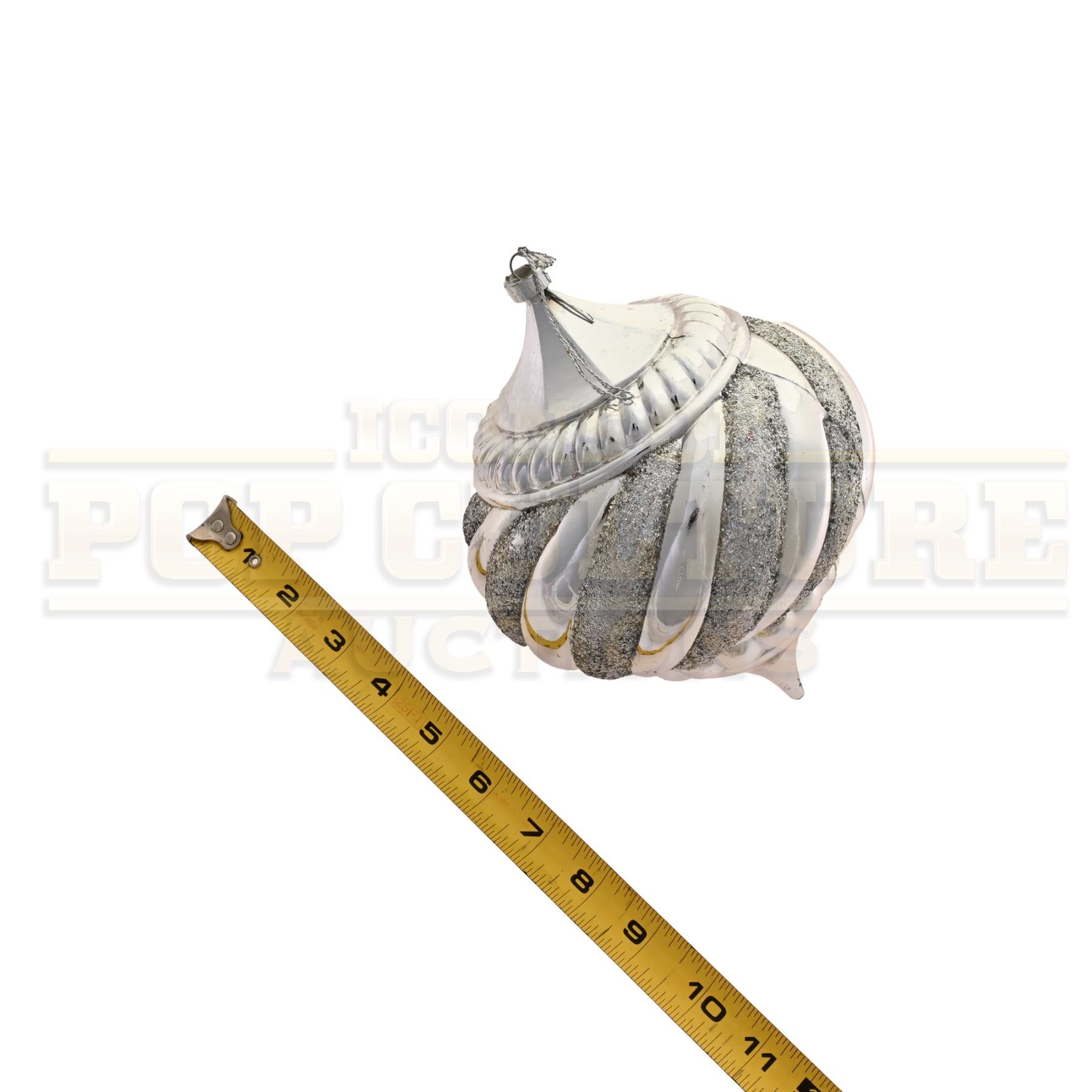This prop ornament was custom-made by the production for use as set dressing. The large plastic ornament measures 7.5” x 5.5” in diameter, with a silver color finish. This style ornament Can be seen is several scenes of the film including the decorating of the Whoville Christmas Tree in the opening of the film.