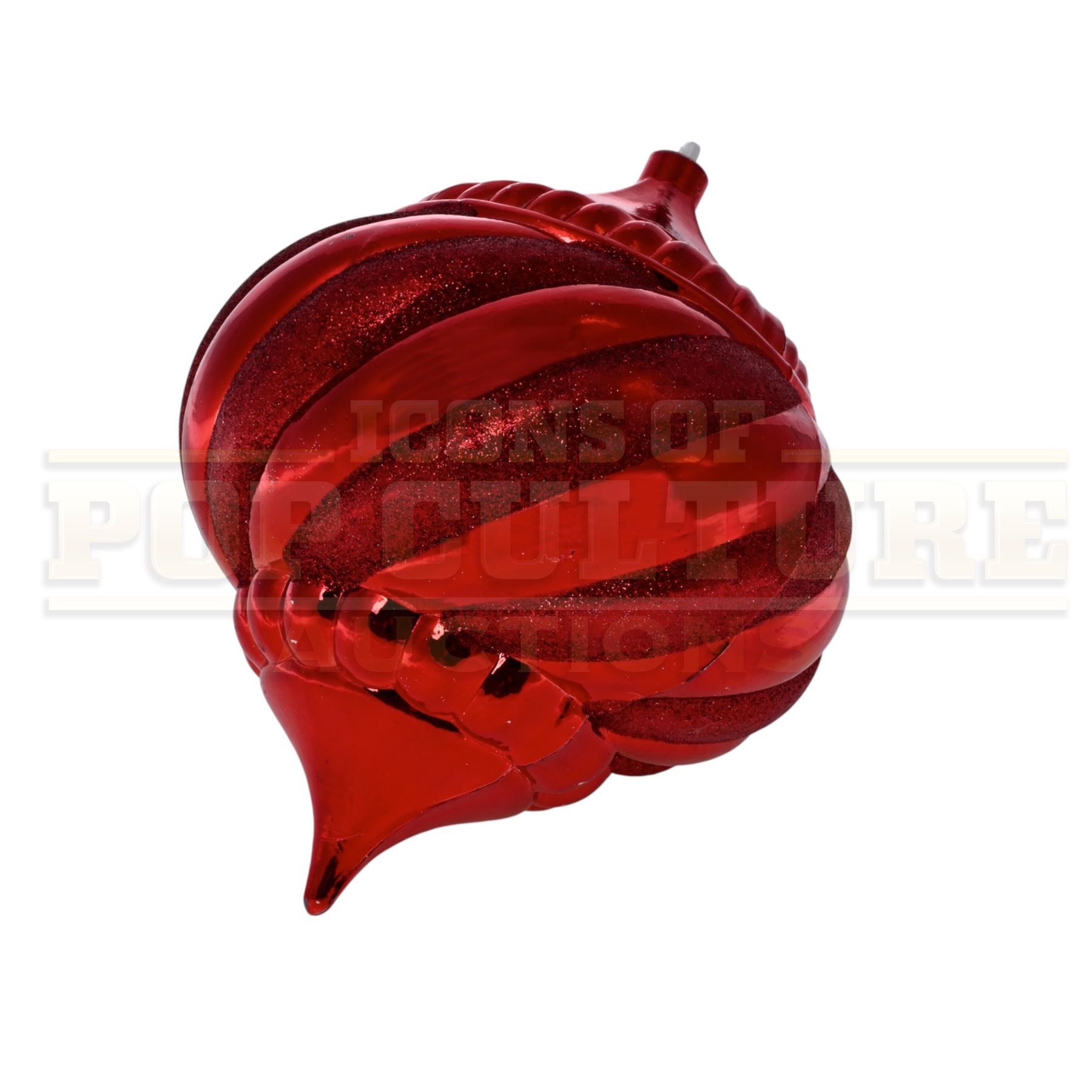 This prop ornament was custom-made by the production for use as set dressing. The large plastic ornament measures 10” x 7” in diameter, with a red color finish. This style ornament Can be seen is several scenes of the film including the decorating of the Whoville Christmas Tree in the opening of the film.
