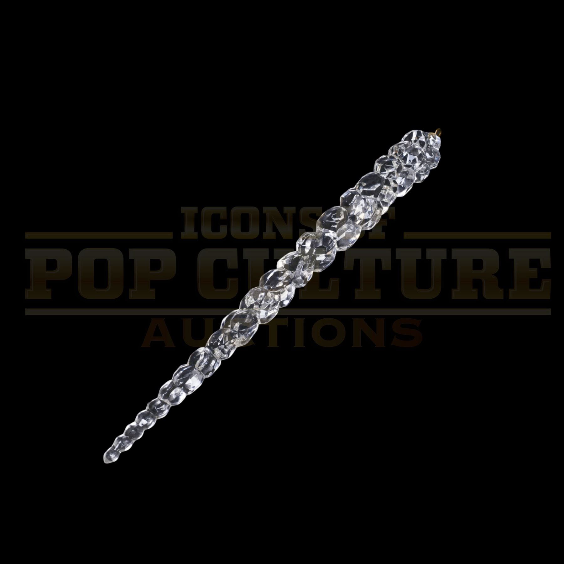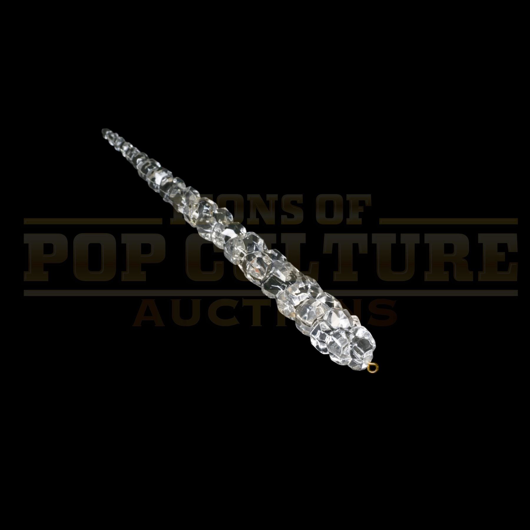 The ornament, measuring approximately 7” tall and .75” in diameter, is crafted from clear molded plastic in a twisting icicle design with a faceted surface that sparkles under light, perfectly capturing the magical aesthetic of Whoville’s festive decor. A small gold loop at the top allows for hanging, completing its screen-seen authenticity.