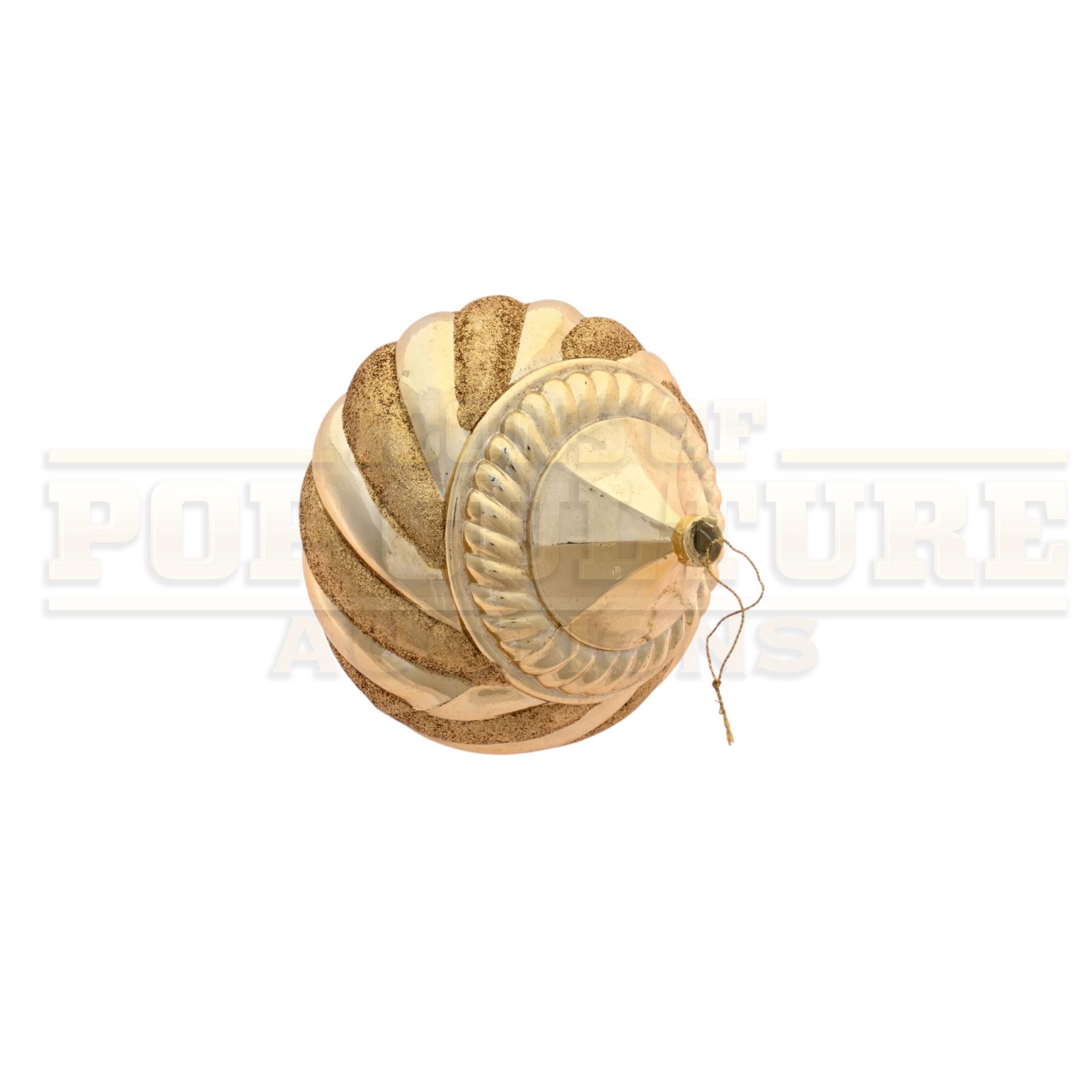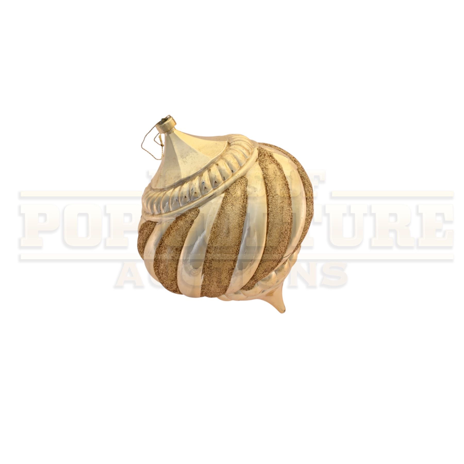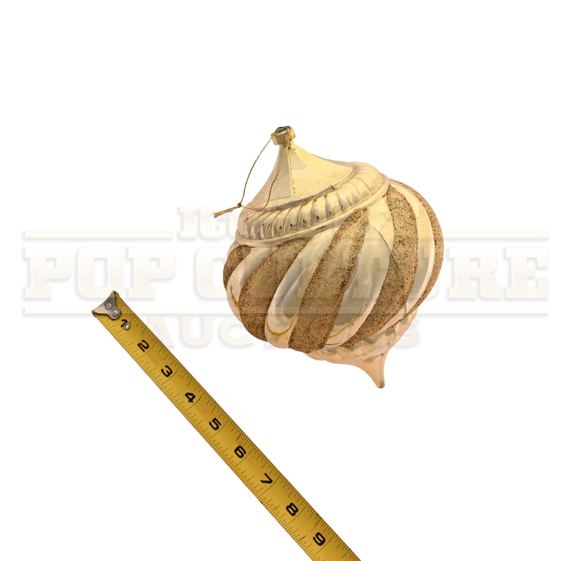 This prop ornament was custom-made by the production for use as set dressing. The large plastic ornament measures 7.5” x 5.5” in diameter, with a gold color finish. This style ornament Can be seen is several scenes of the film including the decorating of the Whoville Christmas Tree in the opening of the film.