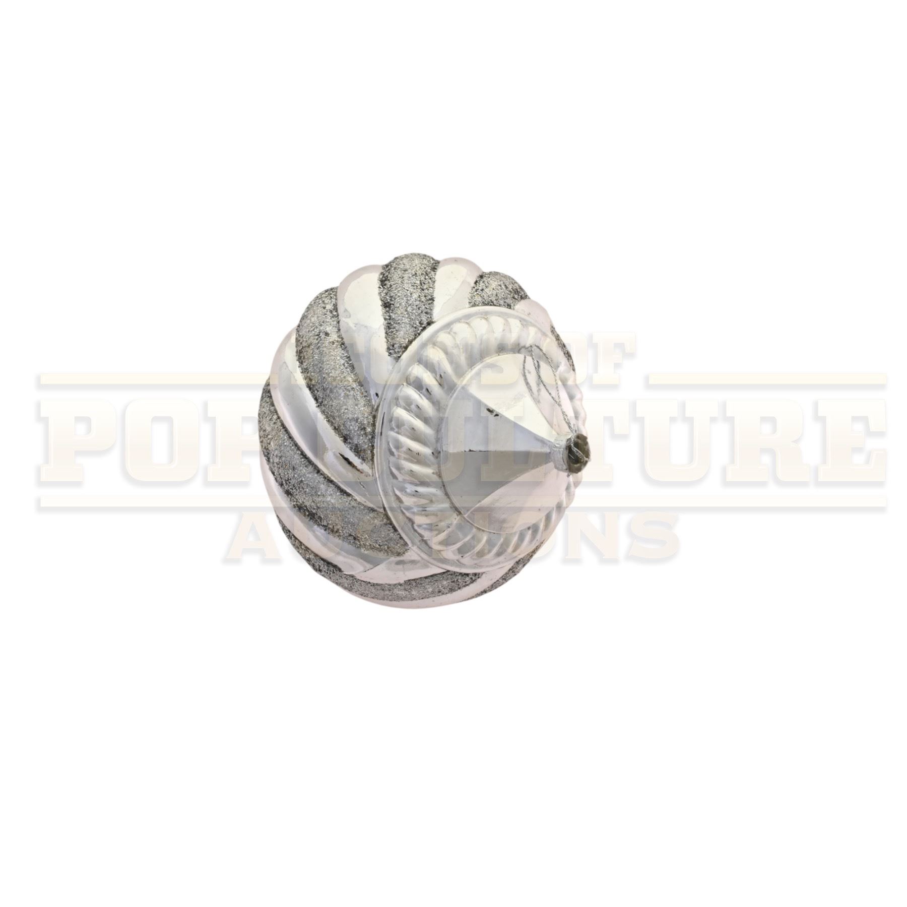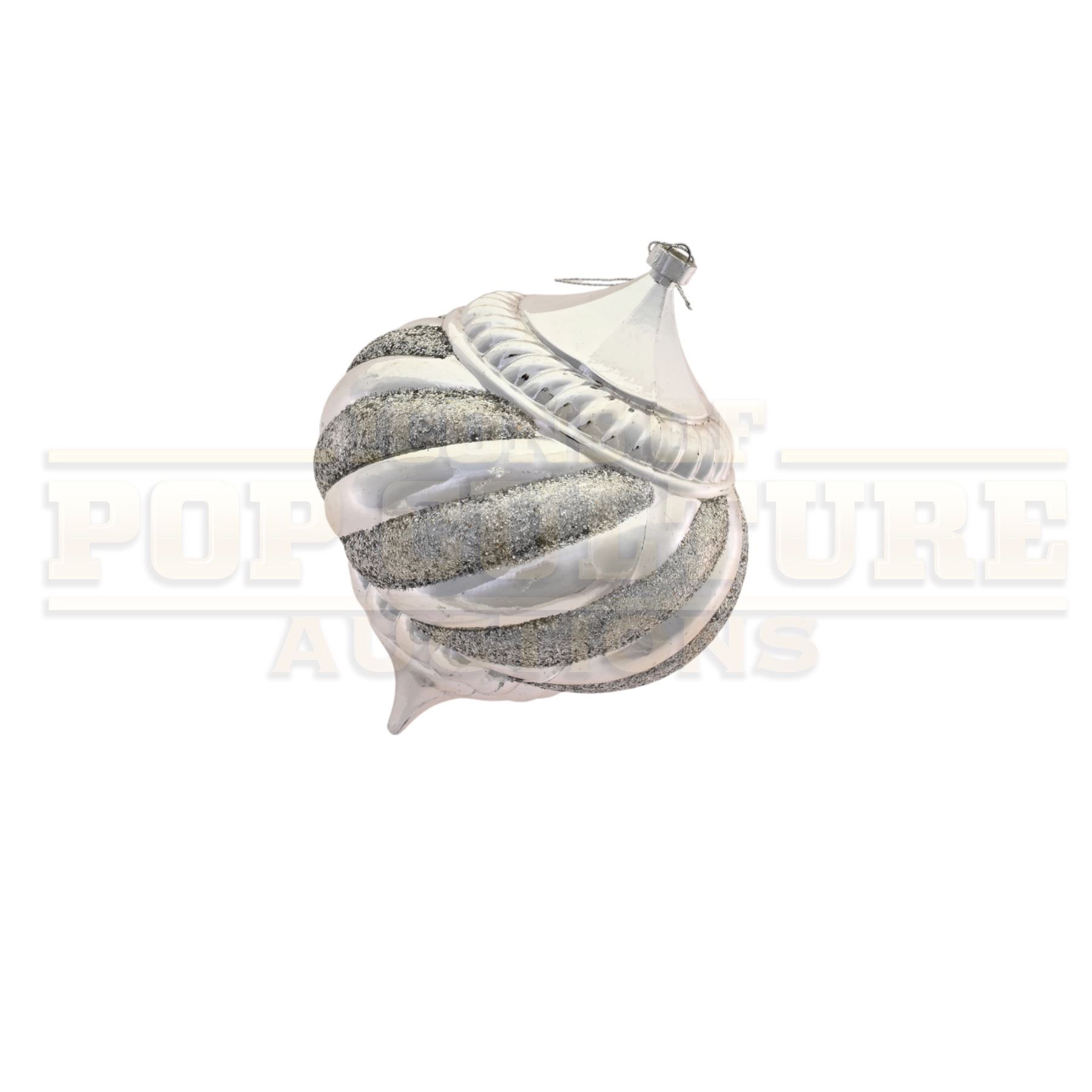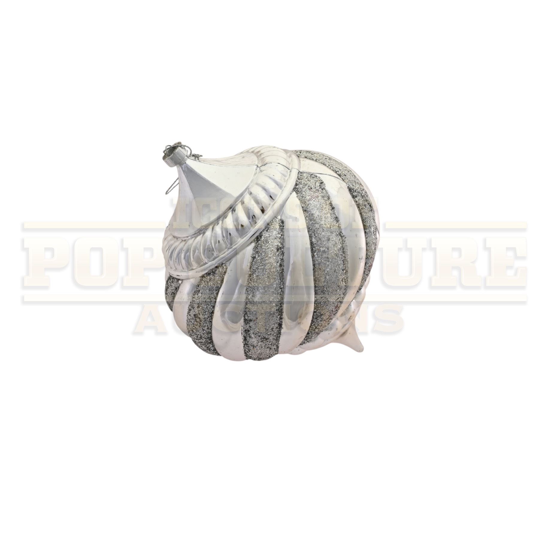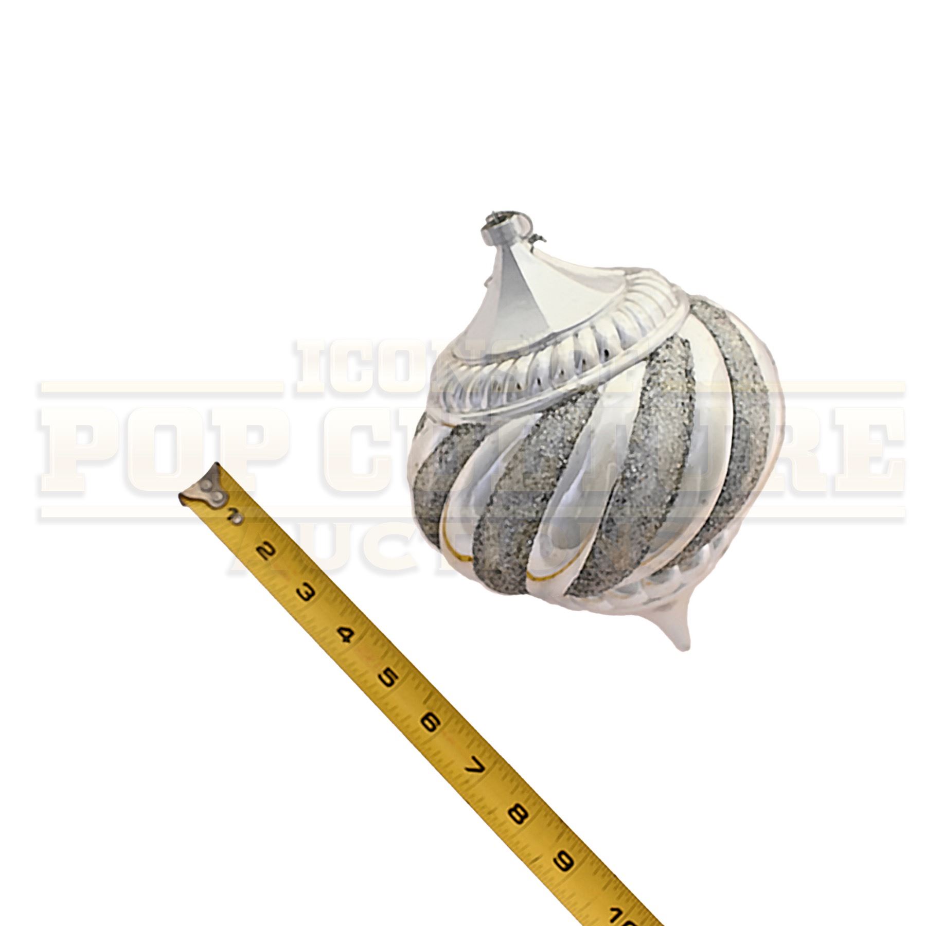 This prop ornament was custom-made by the production for use as set dressing. The large plastic ornament measures 7.5” x 5.5” in diameter, with a silver color finish. This style ornament Can be seen is several scenes of the film including the decorating of the Whoville Christmas Tree in the opening of the film.