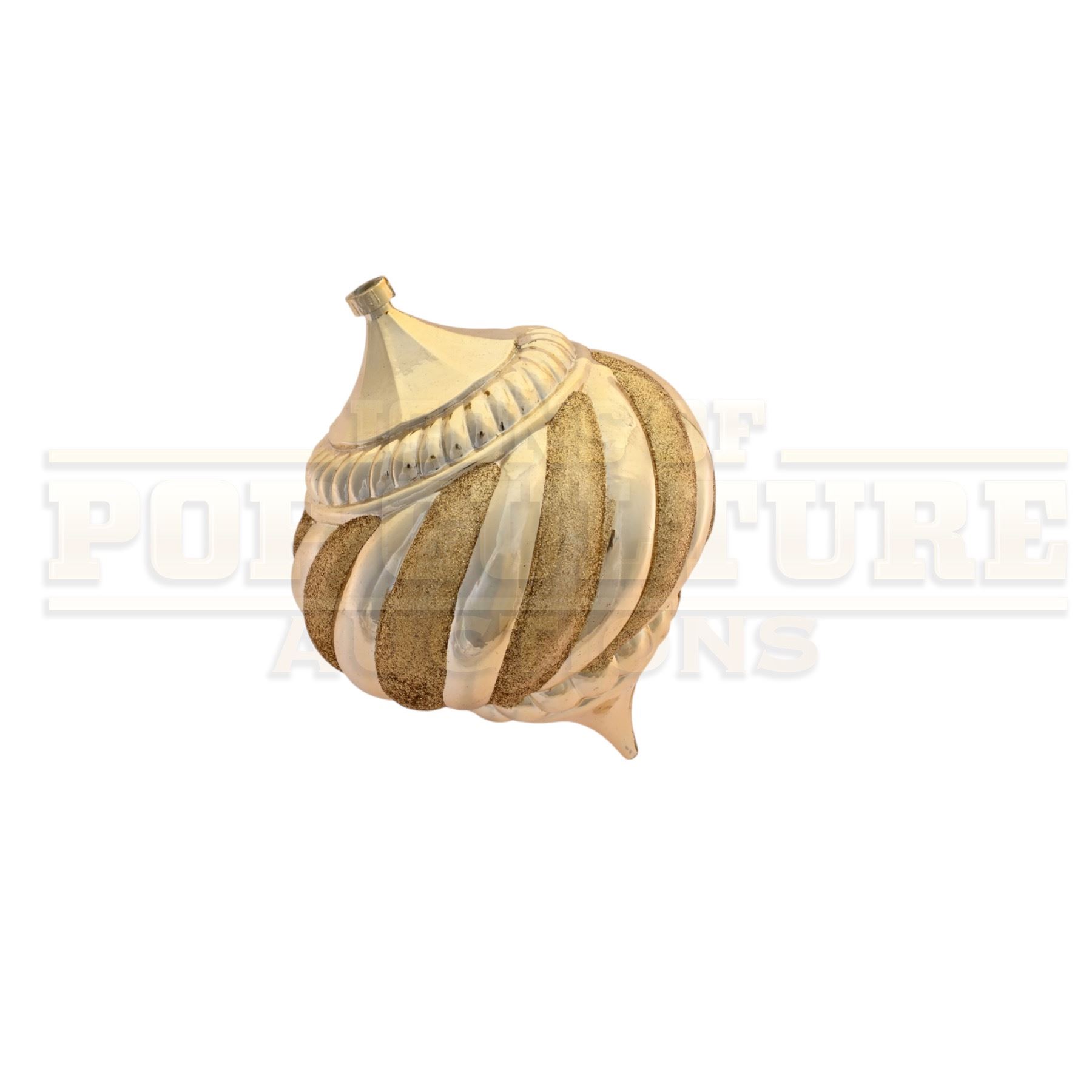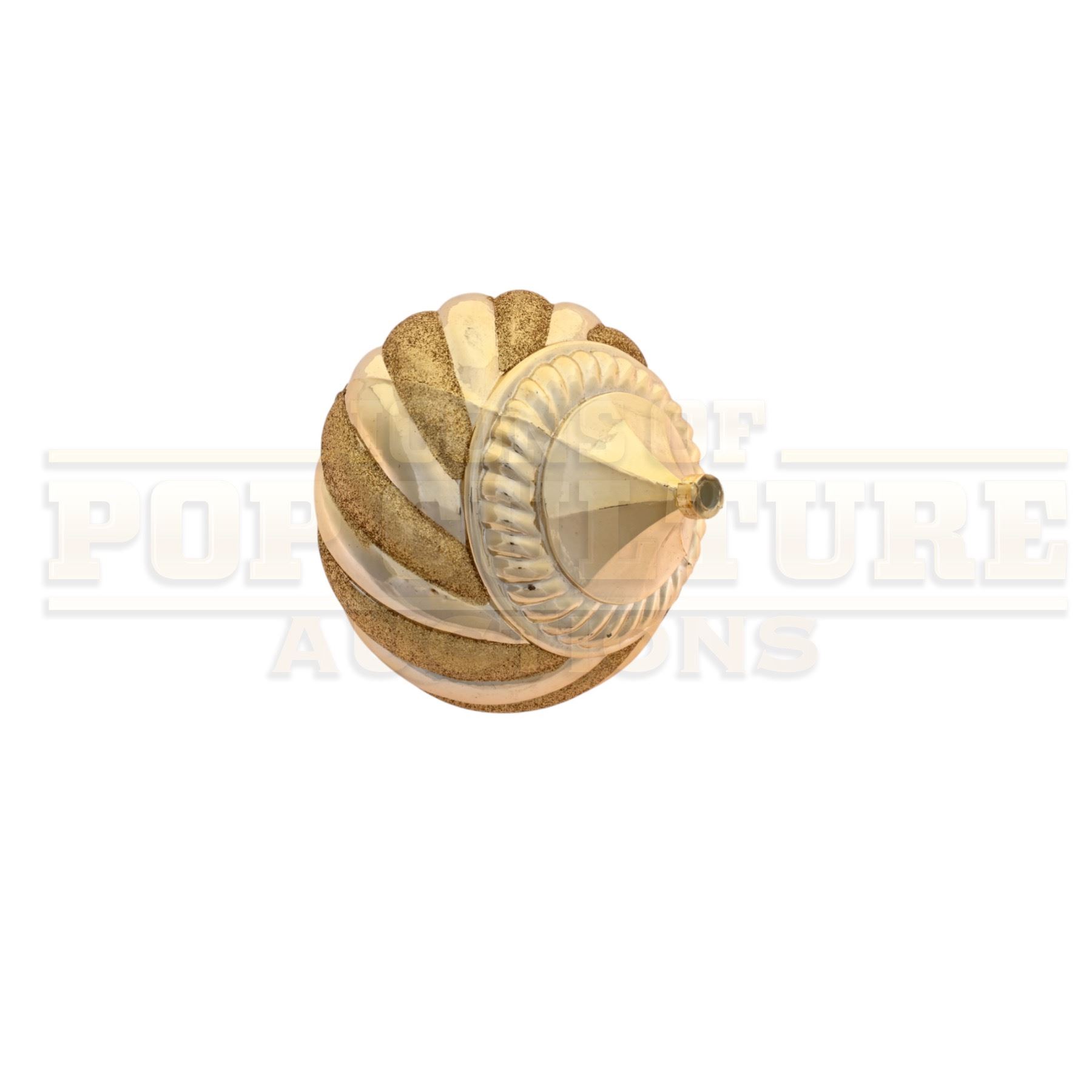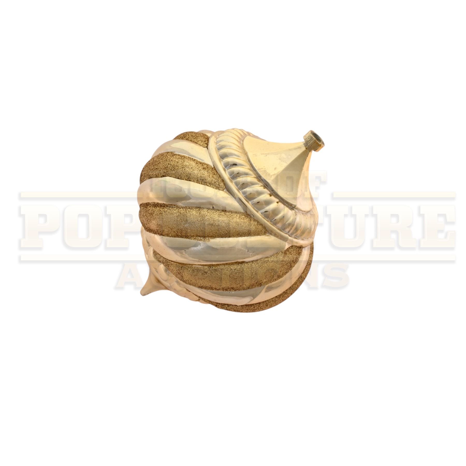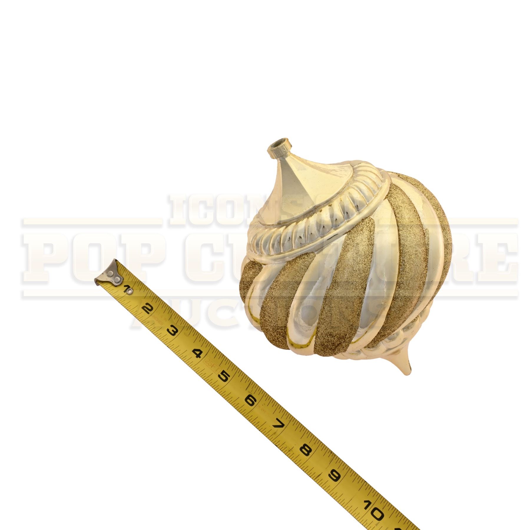 This prop ornament was custom-made by the production for use as set dressing. The large plastic ornament measures 7.5” x 5.5” in diameter, with a gold color finish. This style ornament Can be seen is several scenes of the film including the decorating of the Whoville Christmas Tree in the opening of the film.