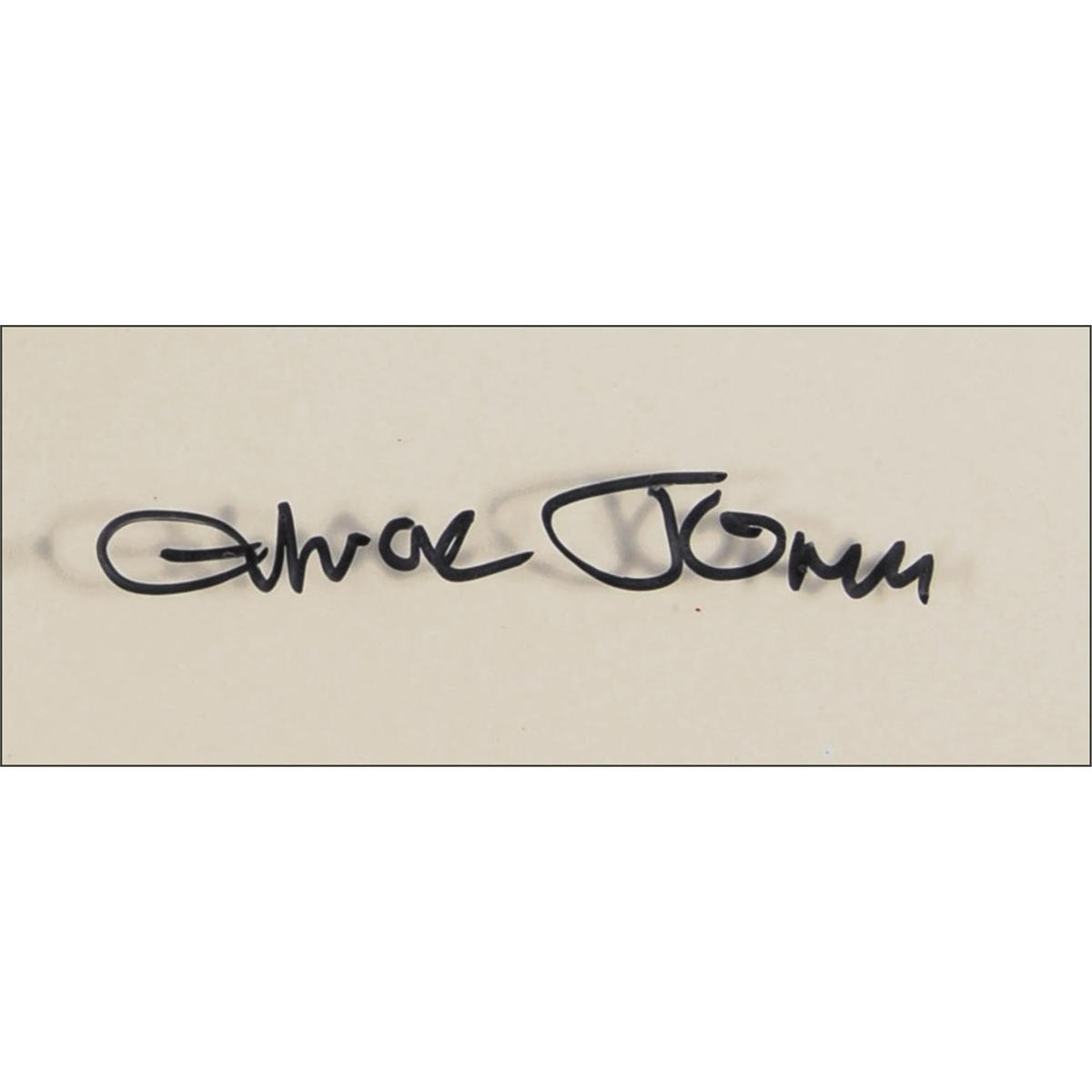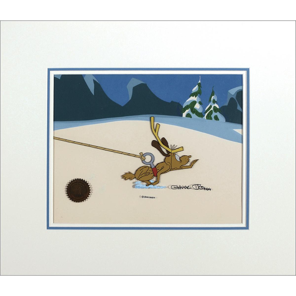 Original hand-painted xerographic line drawn animation cel from the 1966 classic How the Grinch Stole Christmas, showing Max with an antler tied to his head straining under the weight of the Grinch’s sled, 15.25 x 10.5, with visible portion measuring 11.75 x 9.25, and set against its original key master pan color background, painted in gauche. Signed on the cel in black felt tip, “Chuck Jones,” with a copyright mark and “1966” under signature. Cel also bears a Linda Jones Enterprises hologram. Double matted to an overall size of 18.5 x 16. In fine condition. Accompanied by a certificate of authenticity from Linda Jones Enterprises.
