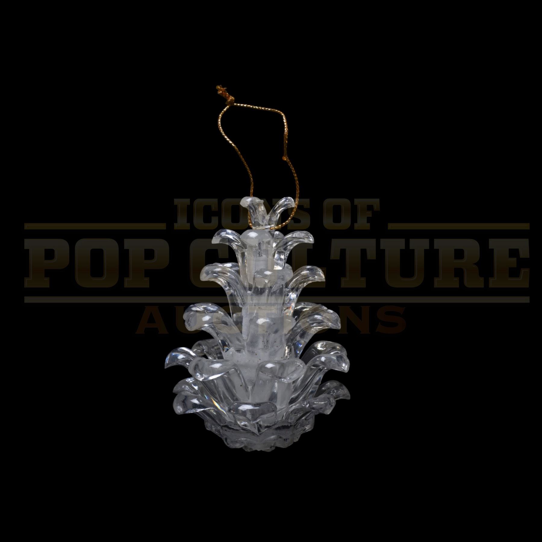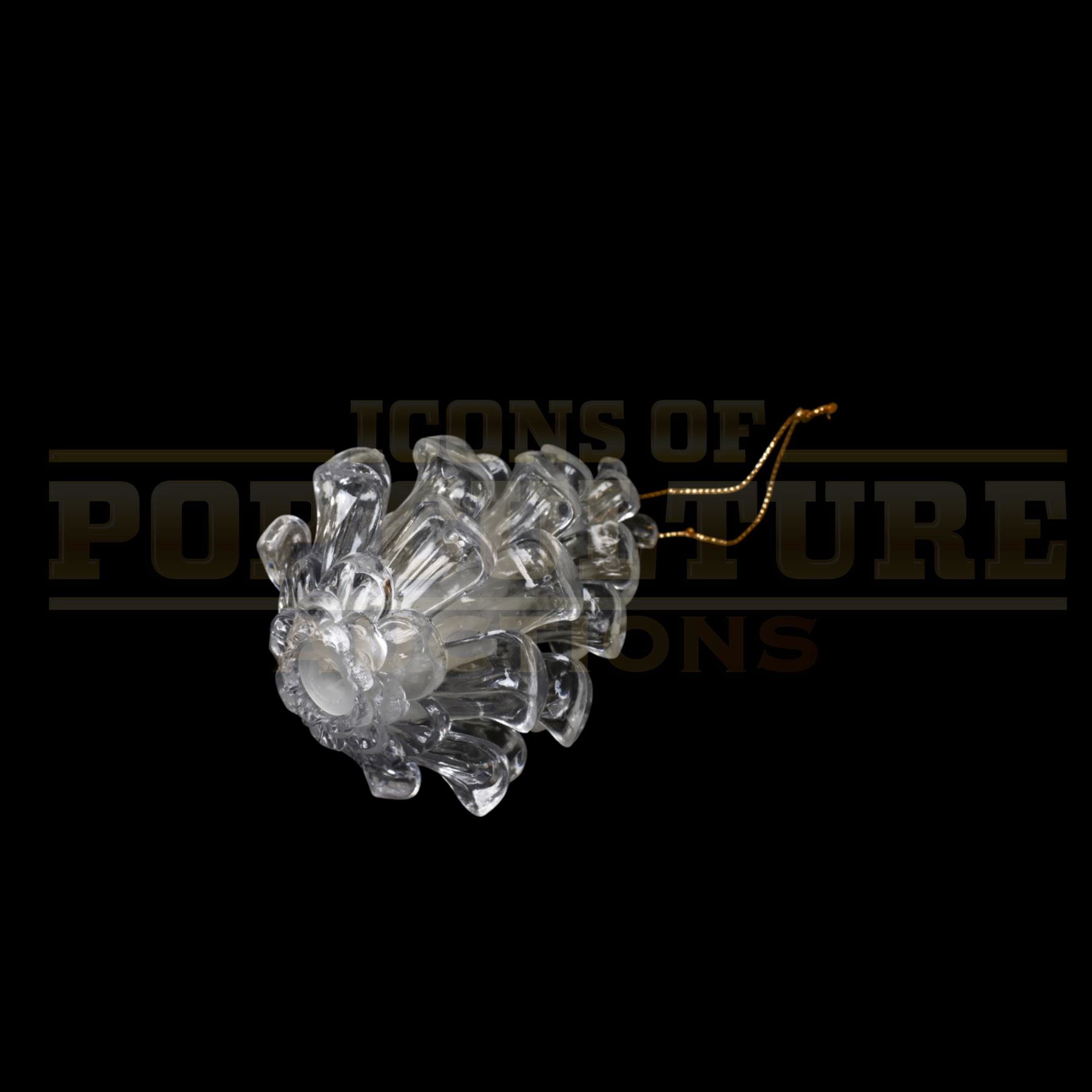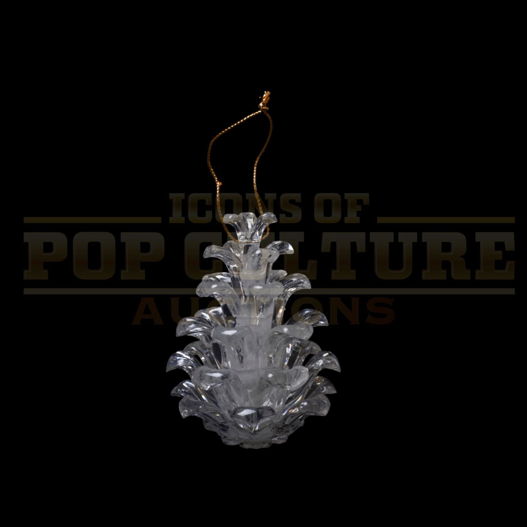 Measuring approximately 3.75" tall x 2.5" in diameter, the ornament is crafted from molded clear plastic in a stylized pinecone shape with a gold hanging string, reflecting the Seussian flair of the production’s holiday aesthetic. Its intricate layered design and shimmering finish made it a perfect fit for the bright, over-the-top Whoville sets, where nearly every prop was designed to look larger-than-life and joyfully eccentric.
