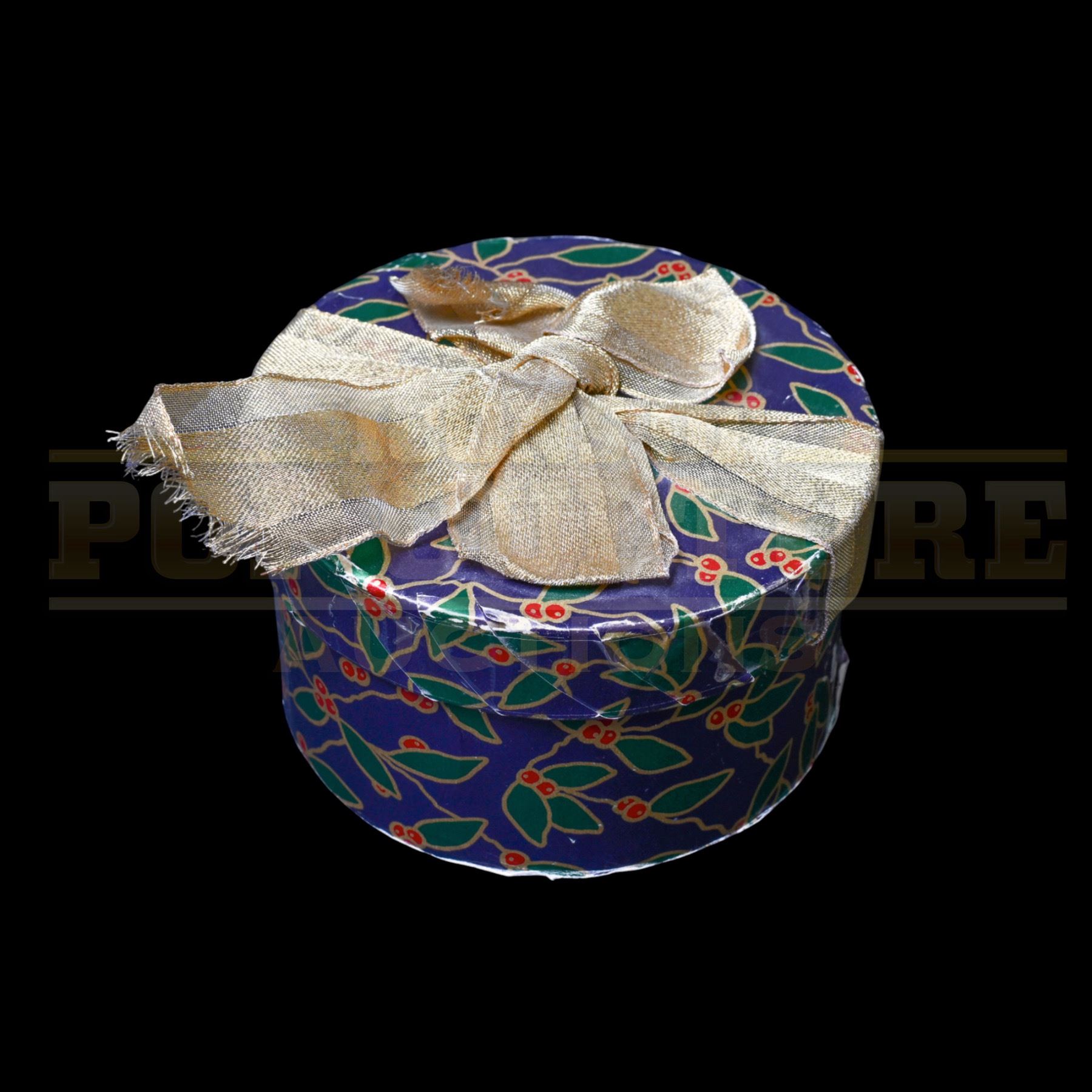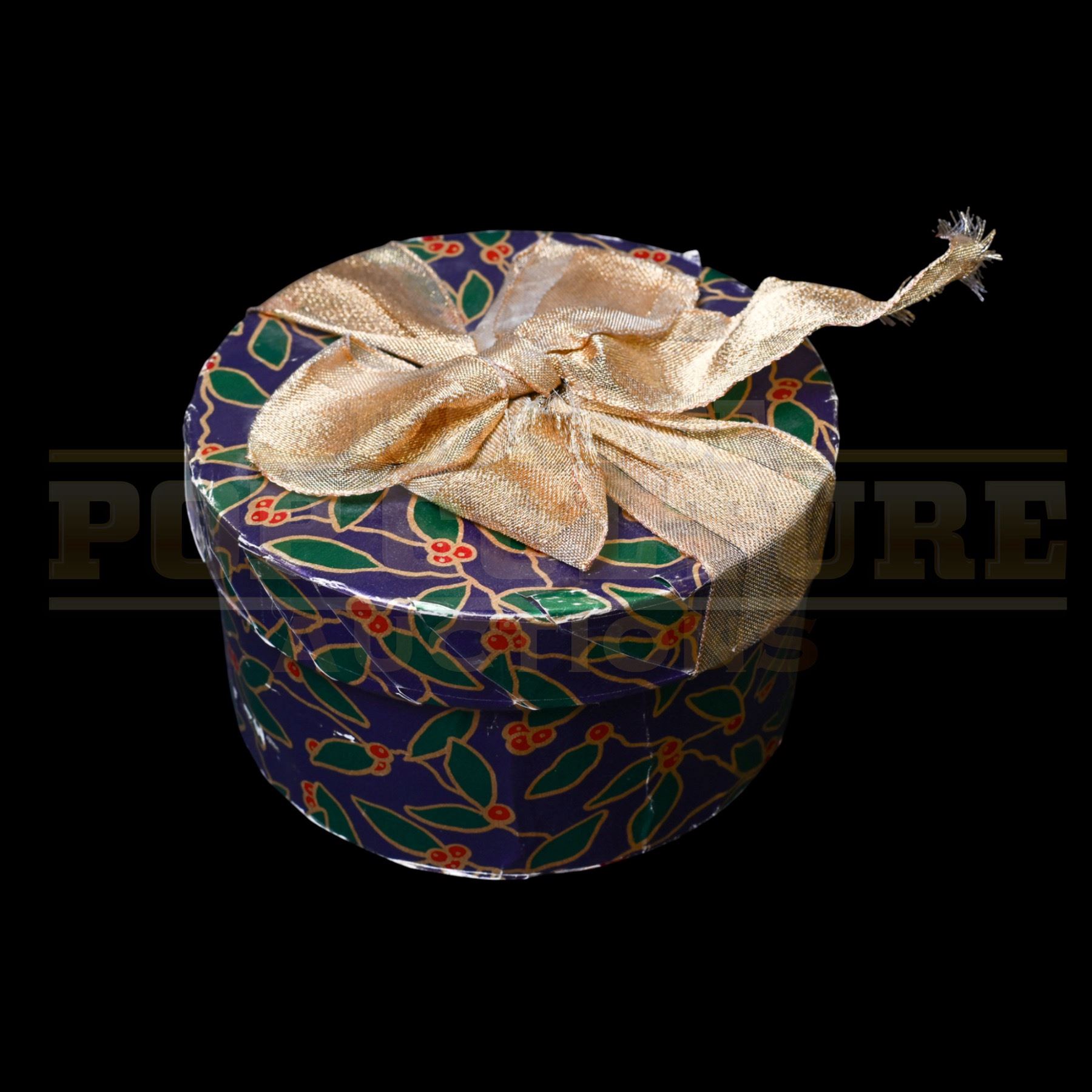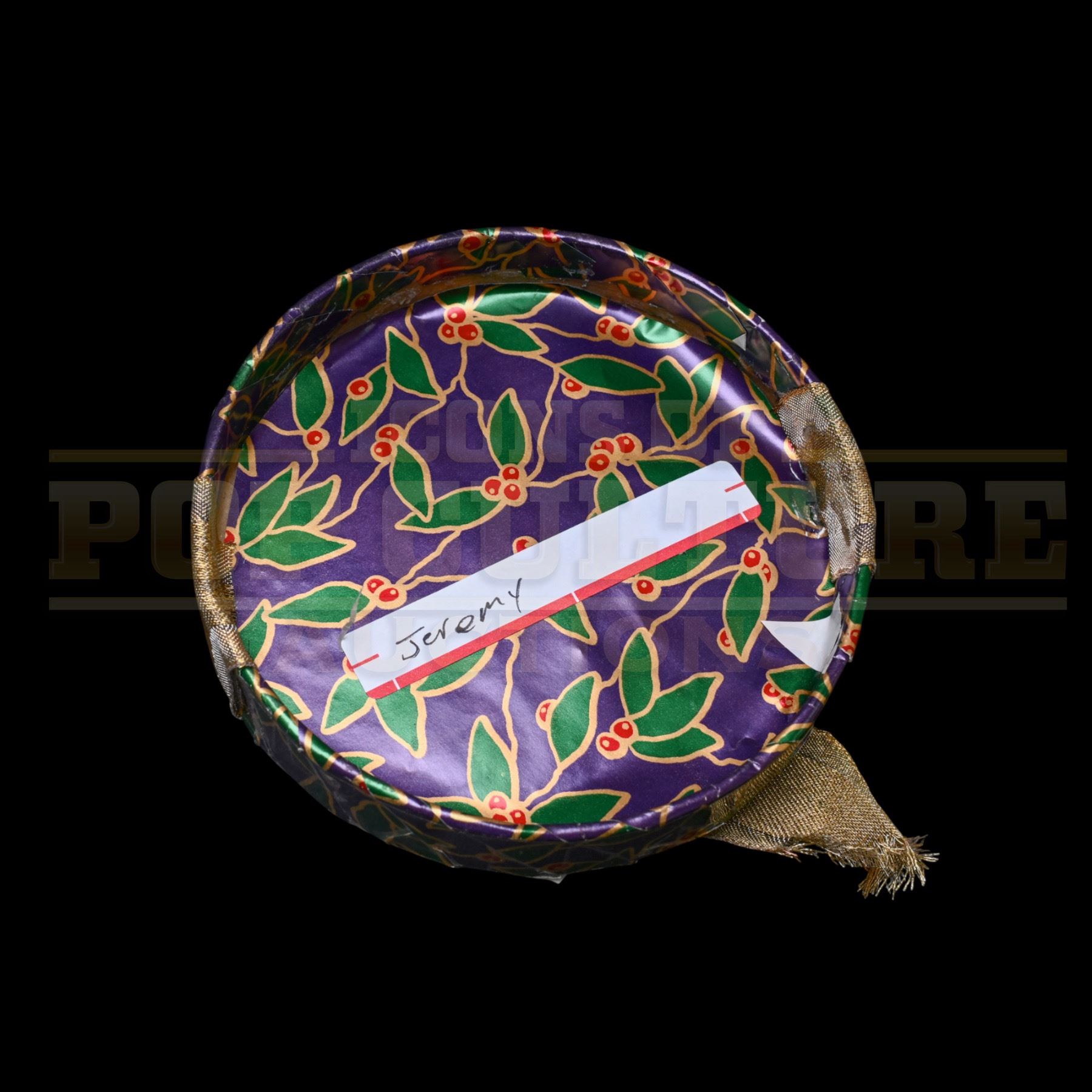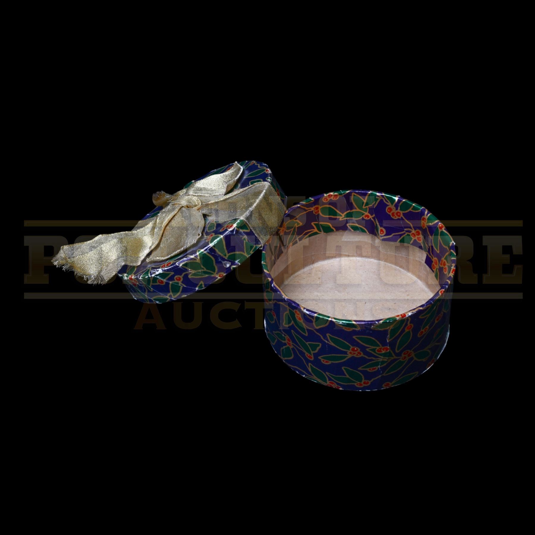 The round box, measuring 2.75" tall and 5" in diameter, is wrapped in vibrant holly-patterned paper and topped with a gold fabric bow. Inside the lid, a handwritten label marked “Jeremy” identifies its use by actor Jeremy Howard during filming. The prop remains in excellent production-used condition, exhibiting minor wear from handling during production.