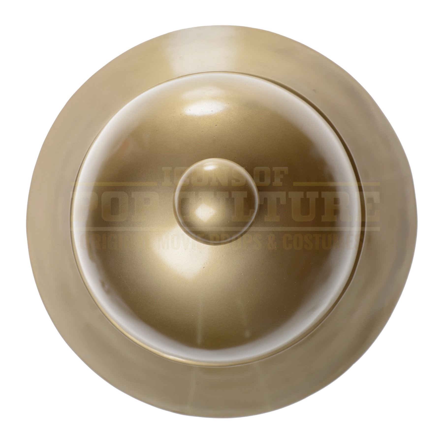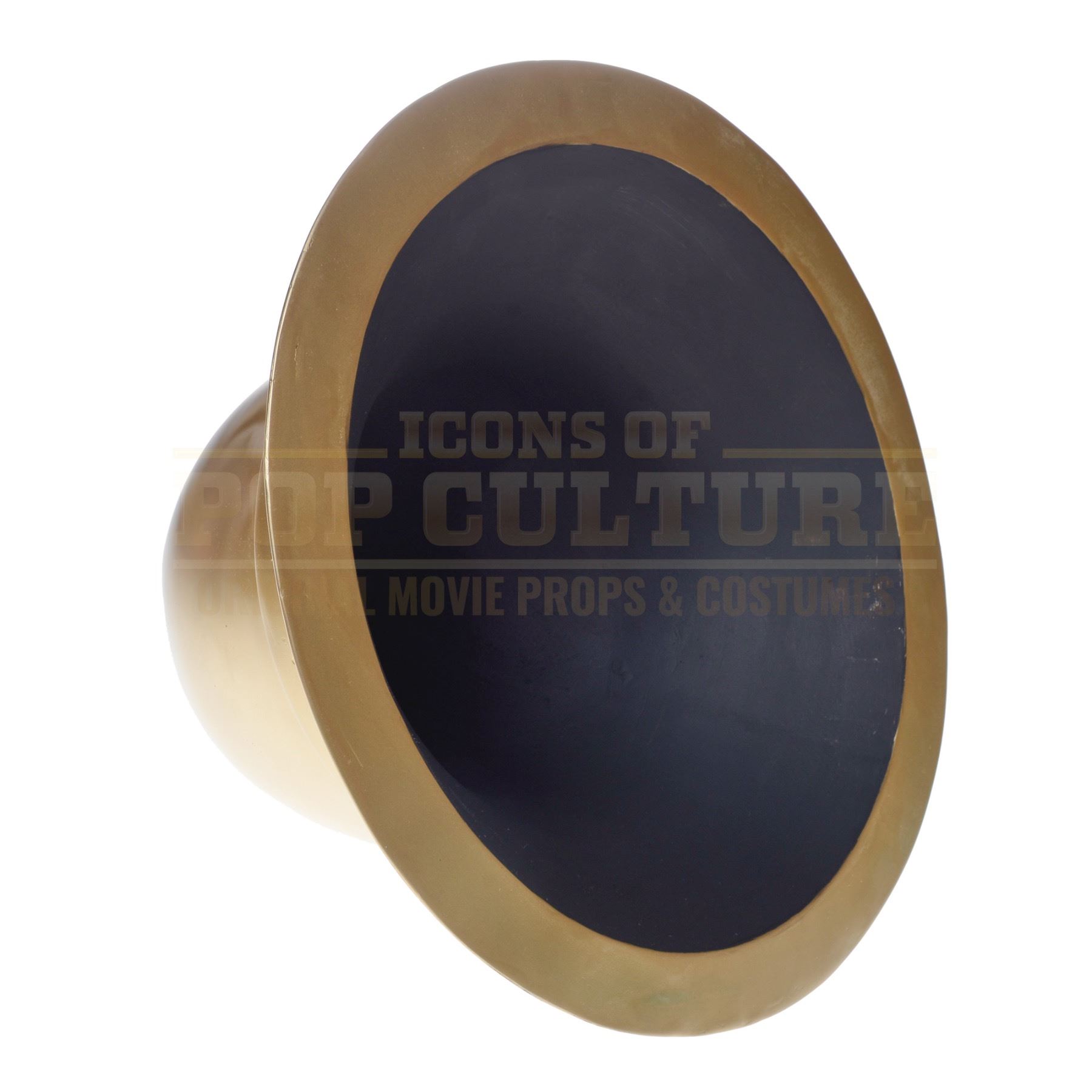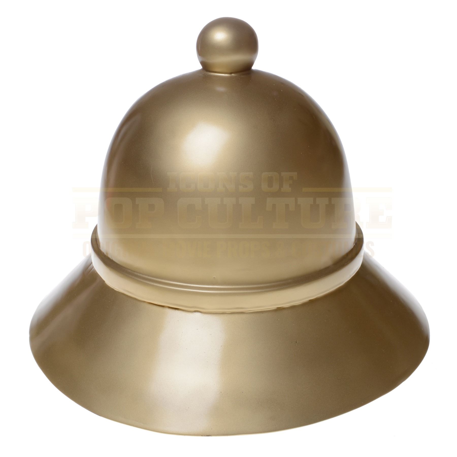 This bell helmet was custom-made by the production for use by a Rance Howard as the “Elderly Timekeeper” and as set dressing in the Grinch’s cave. The gold color helmet is one of a few made for the film and is one of the set dressing versions, as it does not the same finishing details as the helmet worn by the “Elderly Timekeeper”. Measures 12.5” tall x 16.5” in diameter.