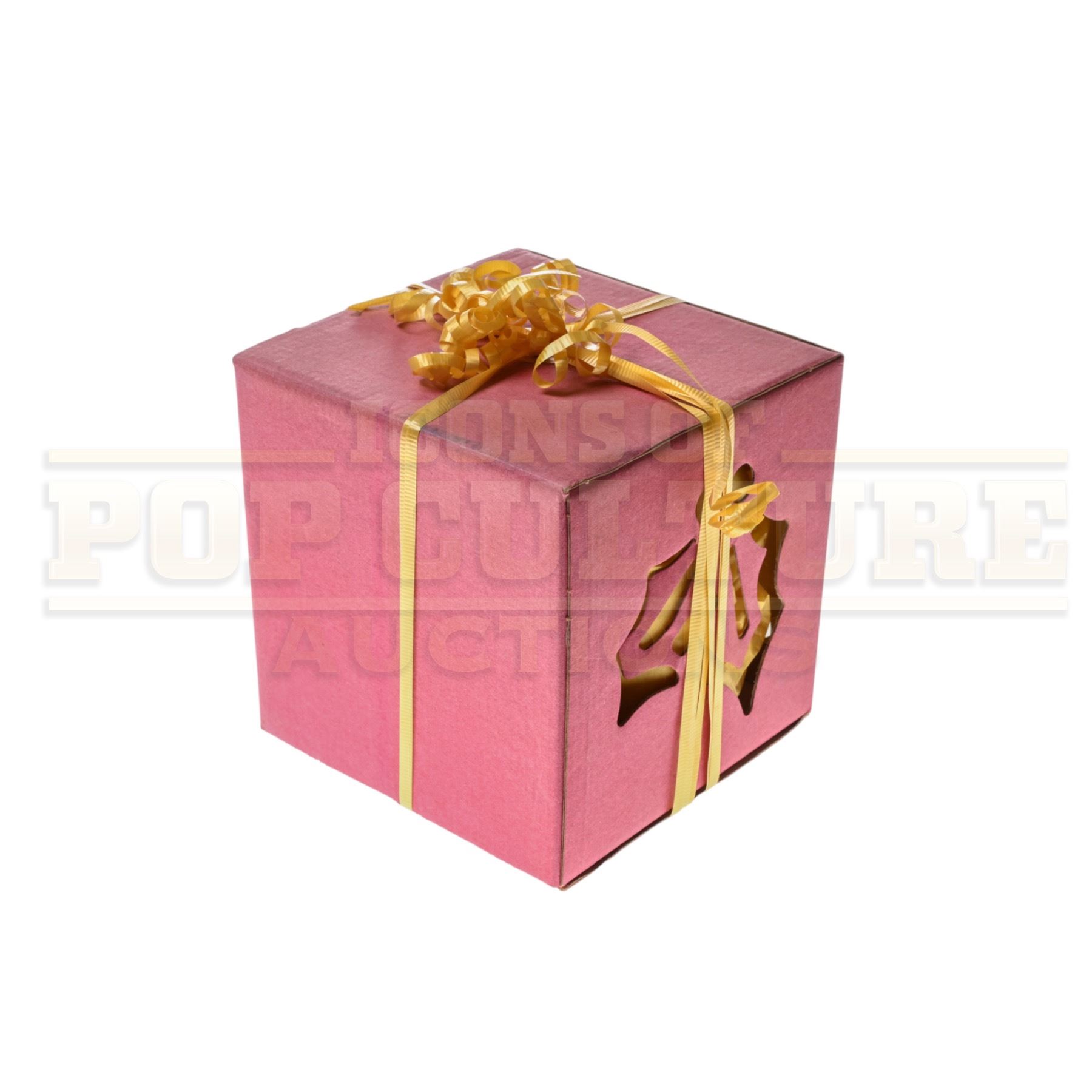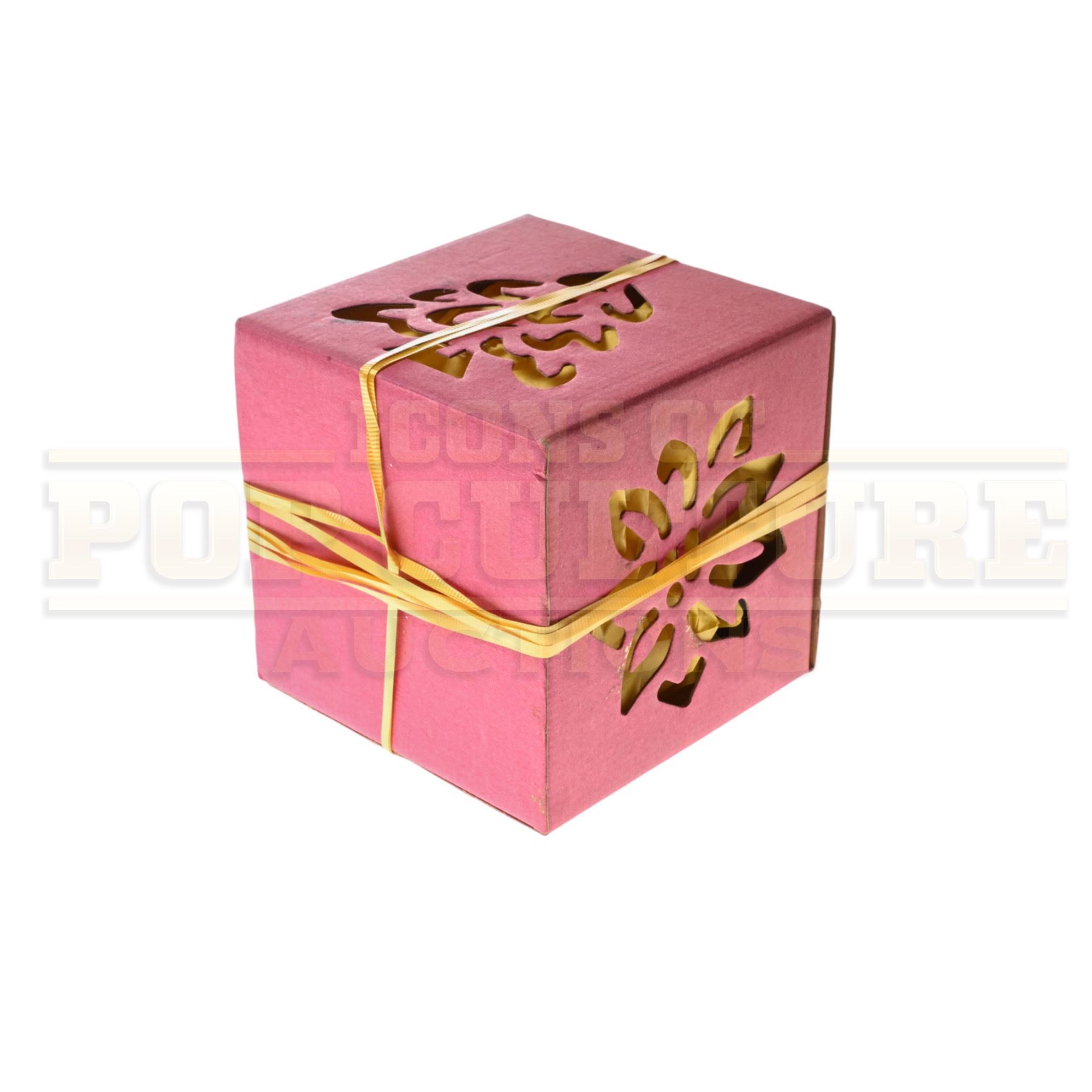 Measuring 6” x 6” x 6”, the prop is crafted from pink cardboard with cut-out snowflake-style designs on its sides, revealing a metallic gold backing that gleams under light. It’s finished with gold curling ribbon wrapped around the box and tied into a bow on top, perfectly embodying the handcrafted, Seussian aesthetic that defined Whoville’s visual world.