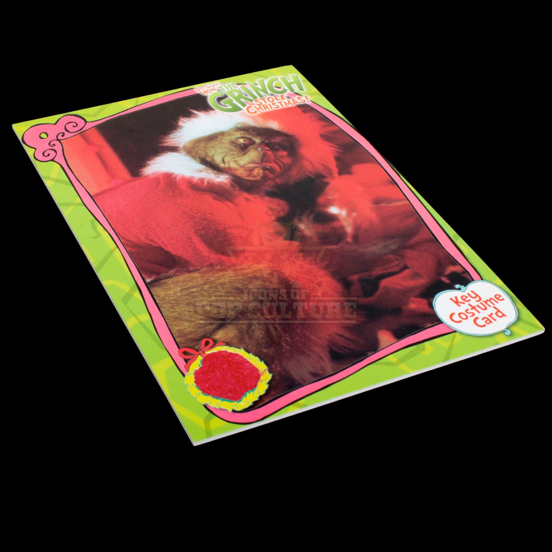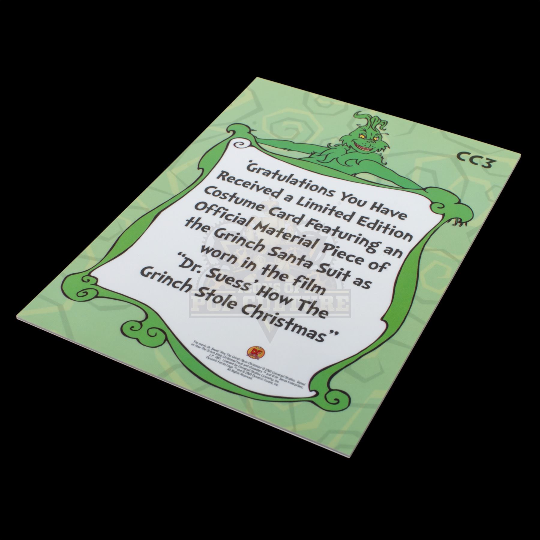 This special trading card features a swatch of the actual Grinch Santa Suit as worn in the film. The trading card measures 7” x 5” with the costume swatch mounted to the front with the image of Jim Carrey wearing the Santa Suit in the film. This special card was randomly inserted into card packs as a unique gift.