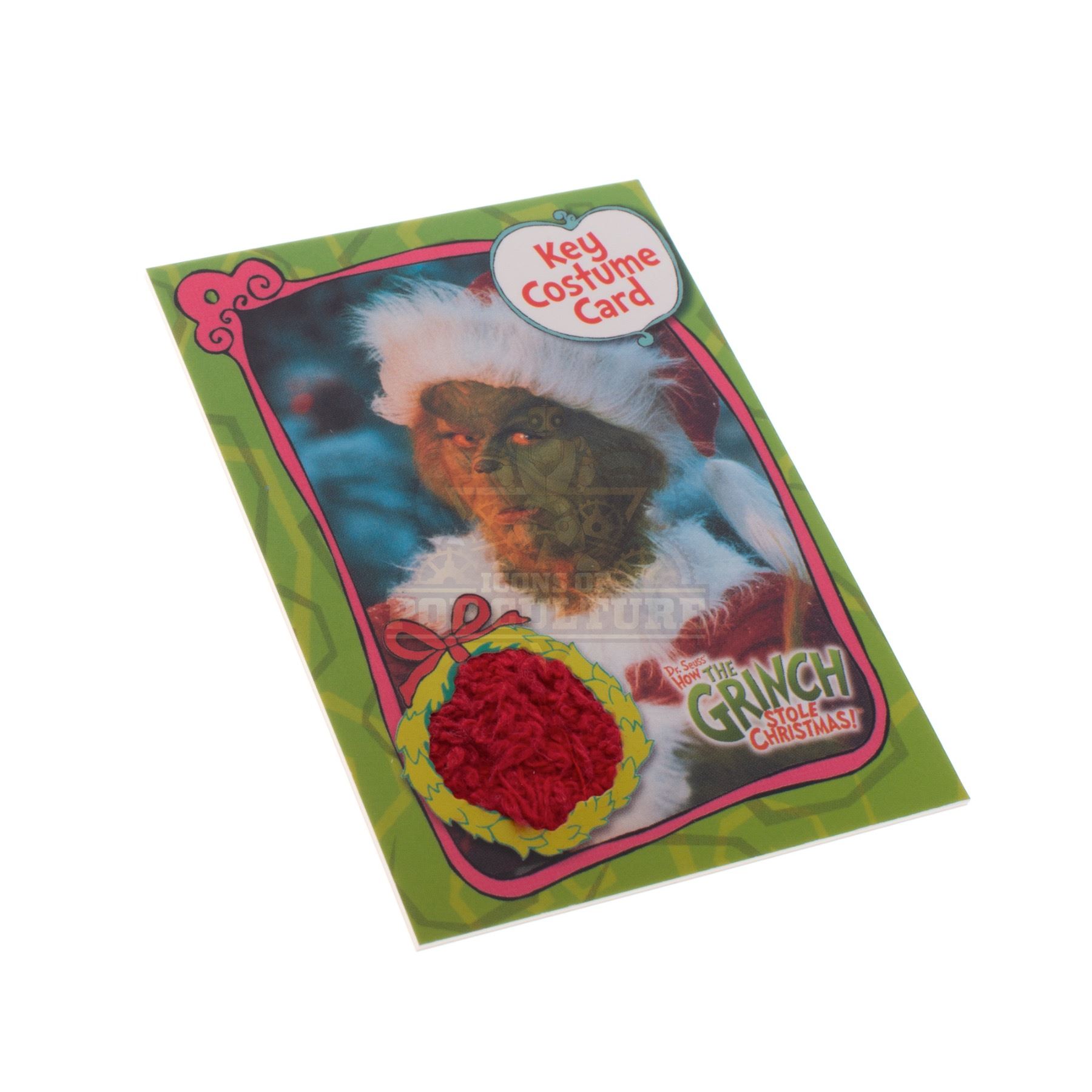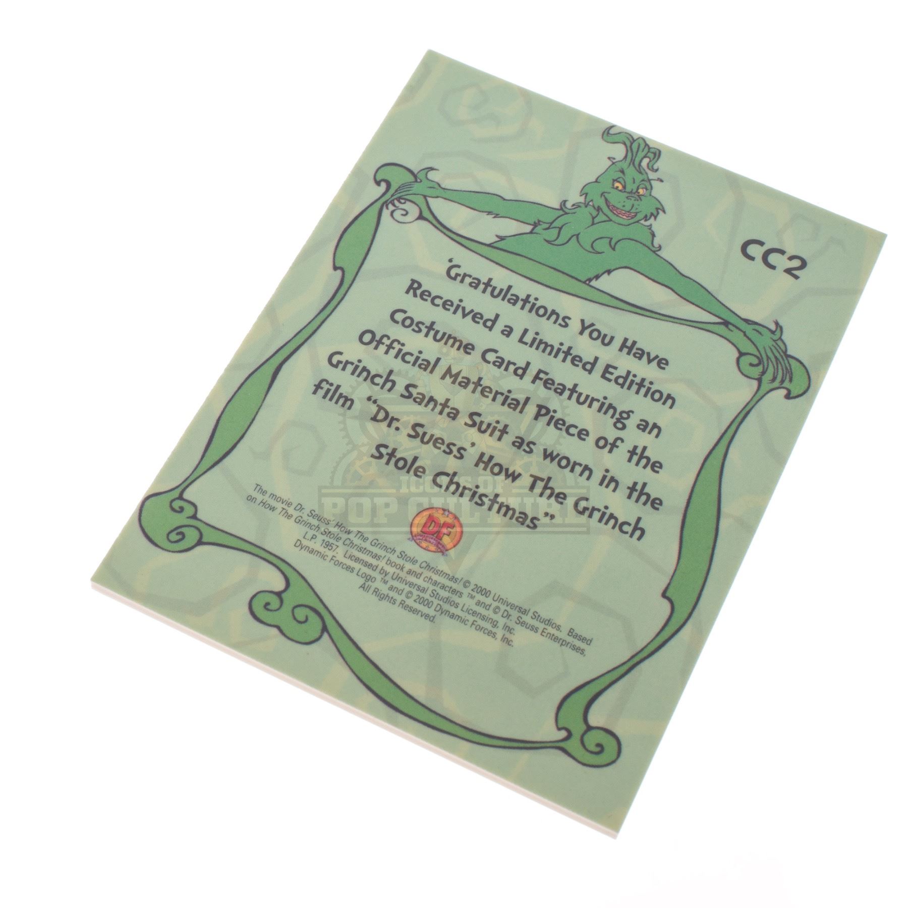 This special trading card features a swatch of the actual Grinch Santa Suit as worn in the film. The trading card measures 3.5” x 2.5” with the costume swatch mounted to the front with the image of Jim Carrey wearing the Santa Suit in the film. This special card was randomly inserted into card packs as a unique gift.