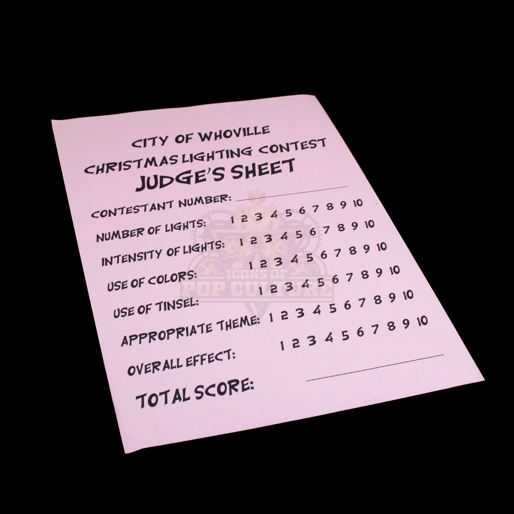 This prop Christmas Lighting Contest Judge’s Scoring Sheet was custom printed by the production for use by one of the Whoville Lighting Contest Judges. The 8.5” x 11” sheet of pink paper features the scoring categories and remains in unused condition.