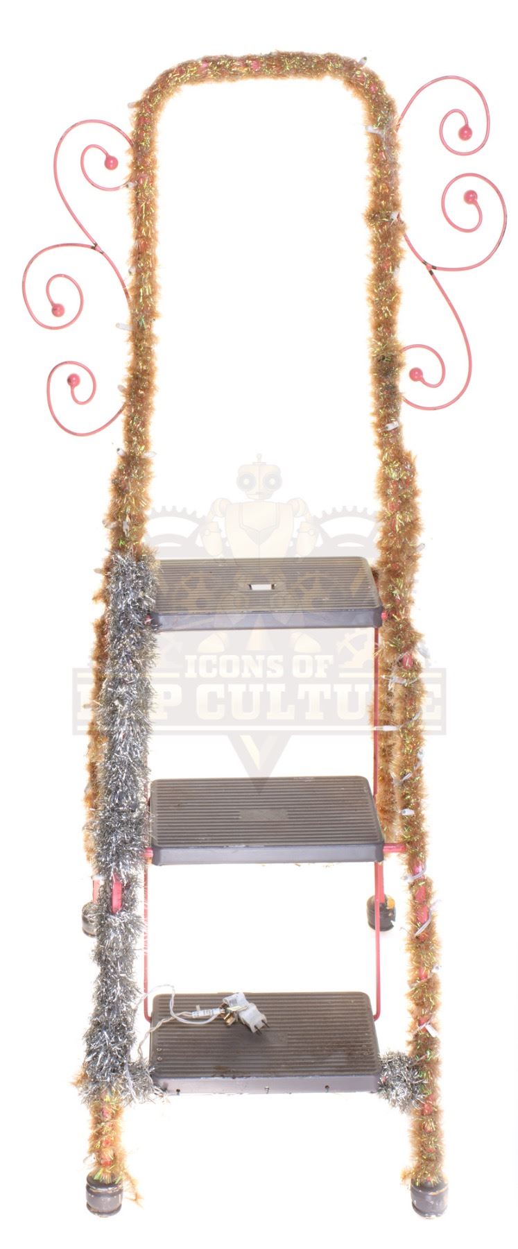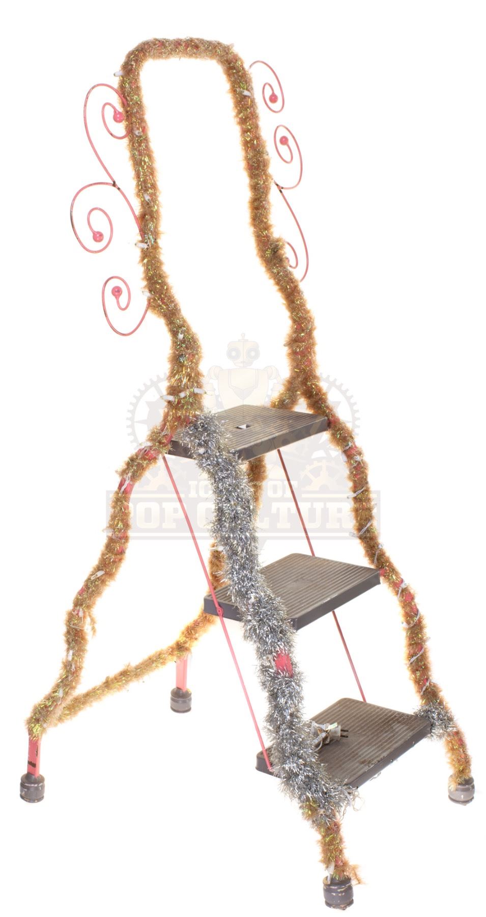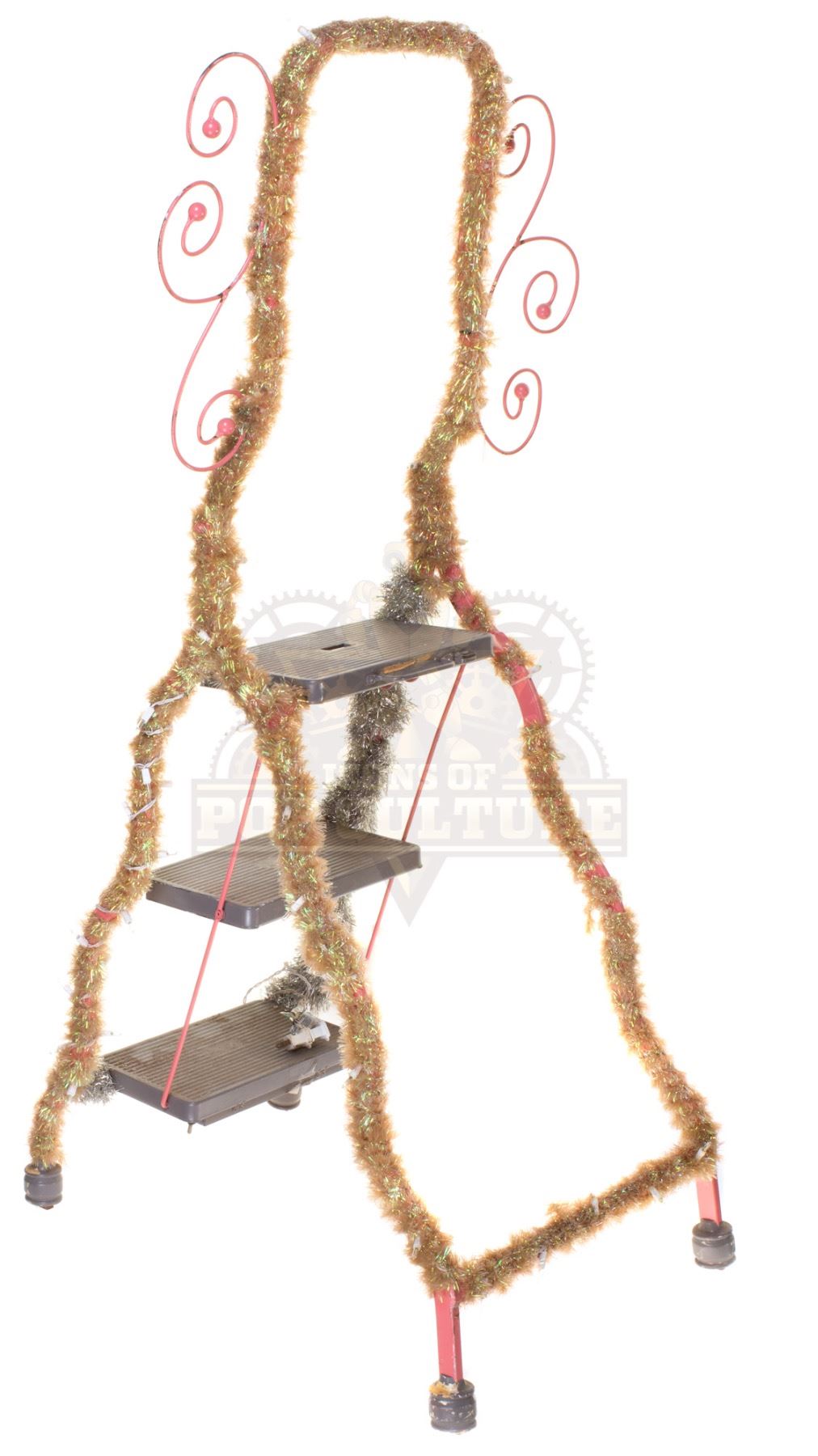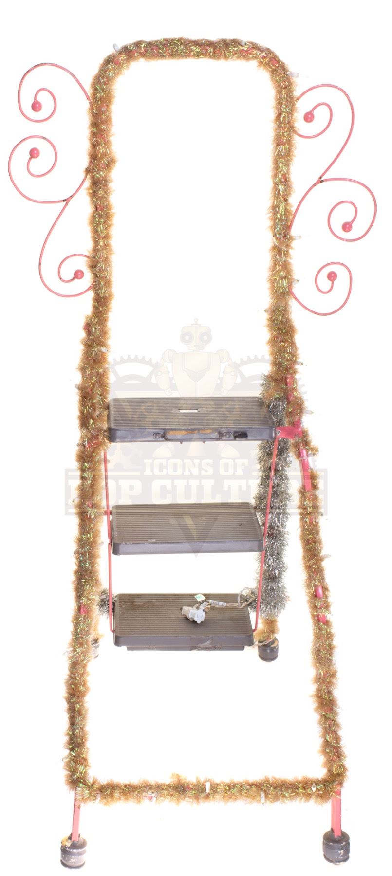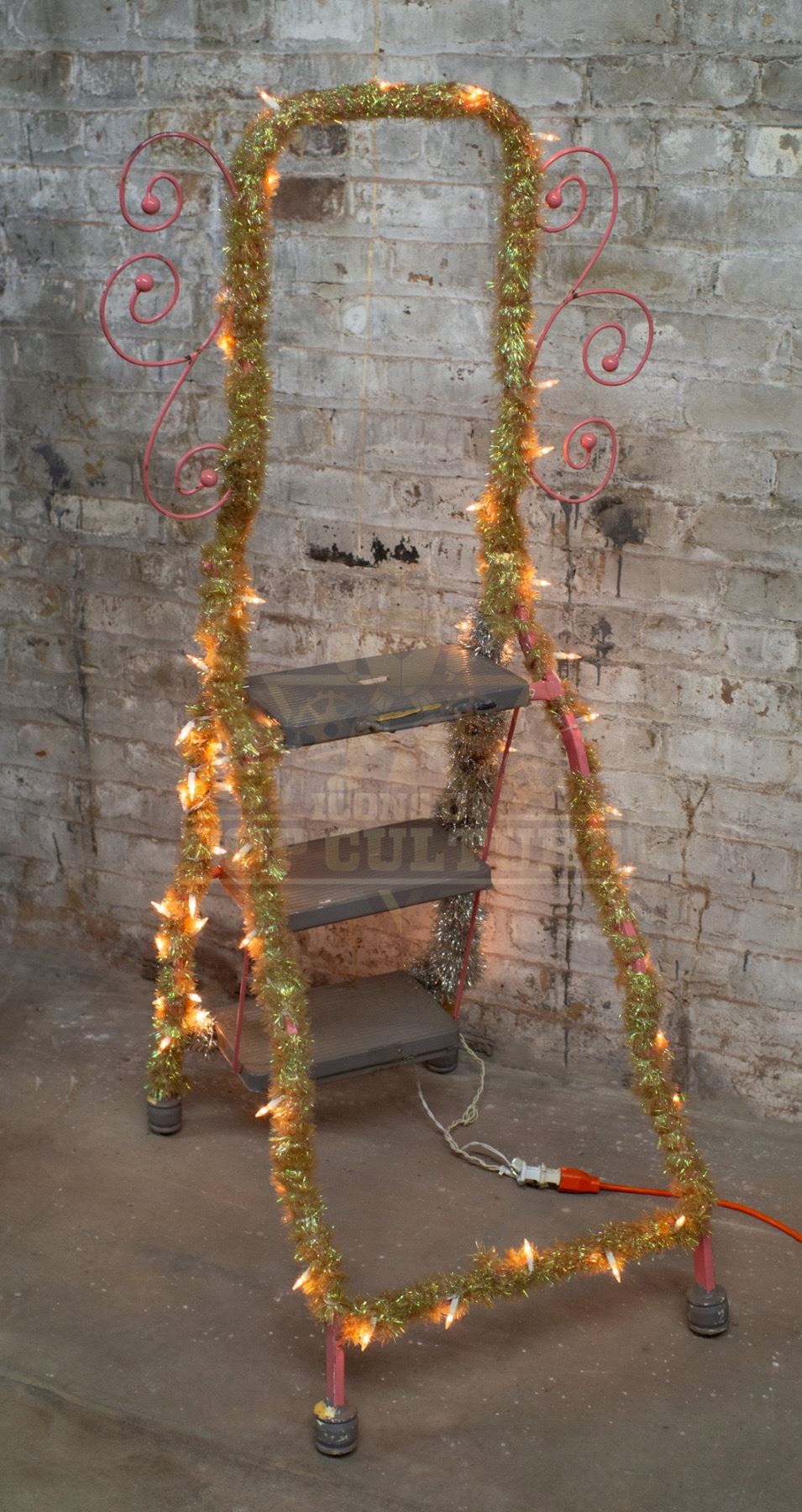 This prop ladder was acquired and customized by the production use by Christine Baranski as “Martha May Whovier” and as set dressing on Martha May Whovier’s front porch as she is decorating her house for Christmas. The ladder stands 56” tall and features curled metal detailing on the sides and is wrapped in holiday garland and Christmas lights. The lights are powered by a standard 110 outlet plug.
