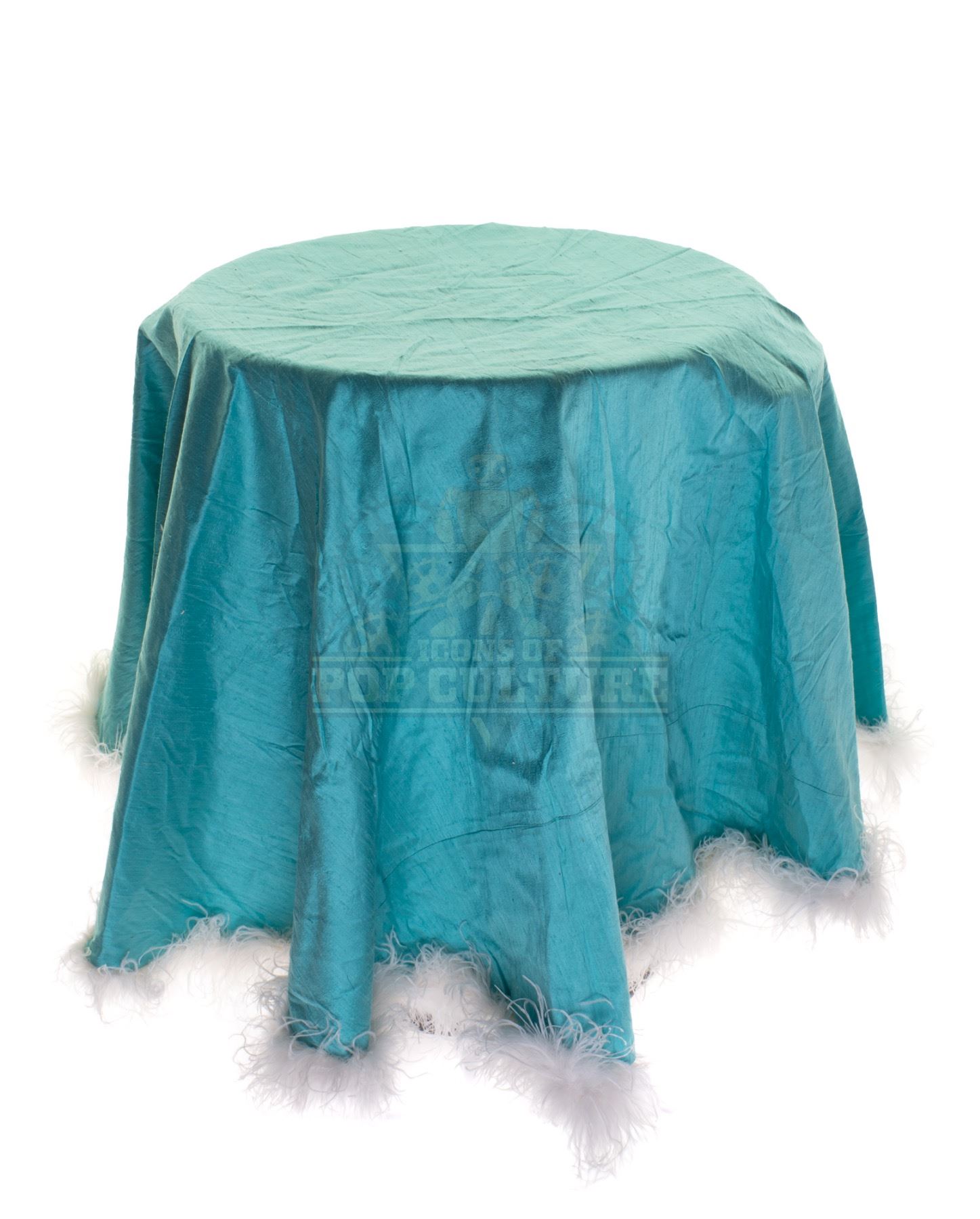 This end table skirt was custom-made by the production for use as set dressing in Martha May Whovier’s Whoville home. The teal skirt features white fur trim and measures 68” in diameter.