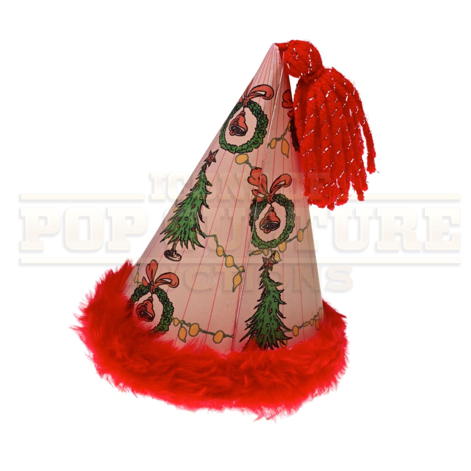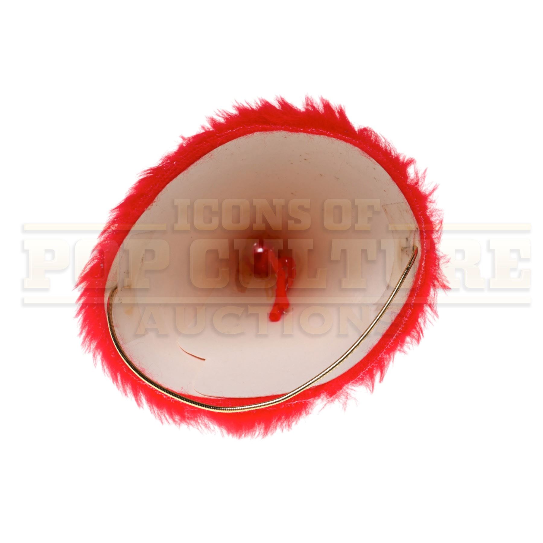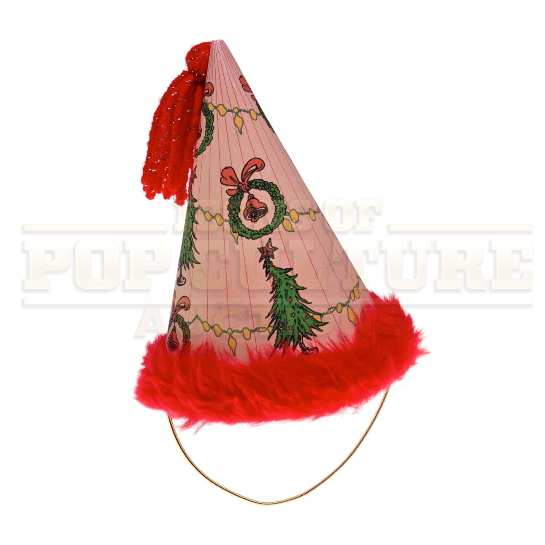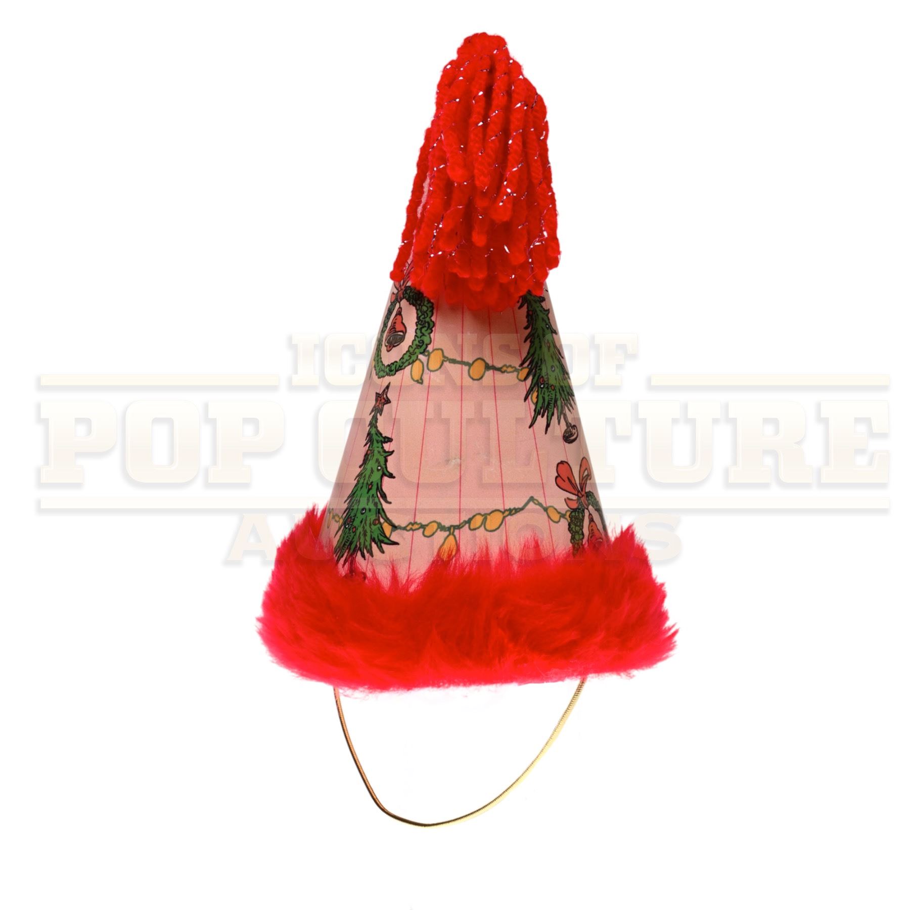 The base is trimmed in bright red faux fur, while the top features a bold red yarn tassel shimmering with subtle metallic thread. An attached gold elastic band completes the piece, allowing it to be worn on set by the Grinch’s loyal sidekick. Measuring approximately 6.25" tall and 4.5" in diameter.