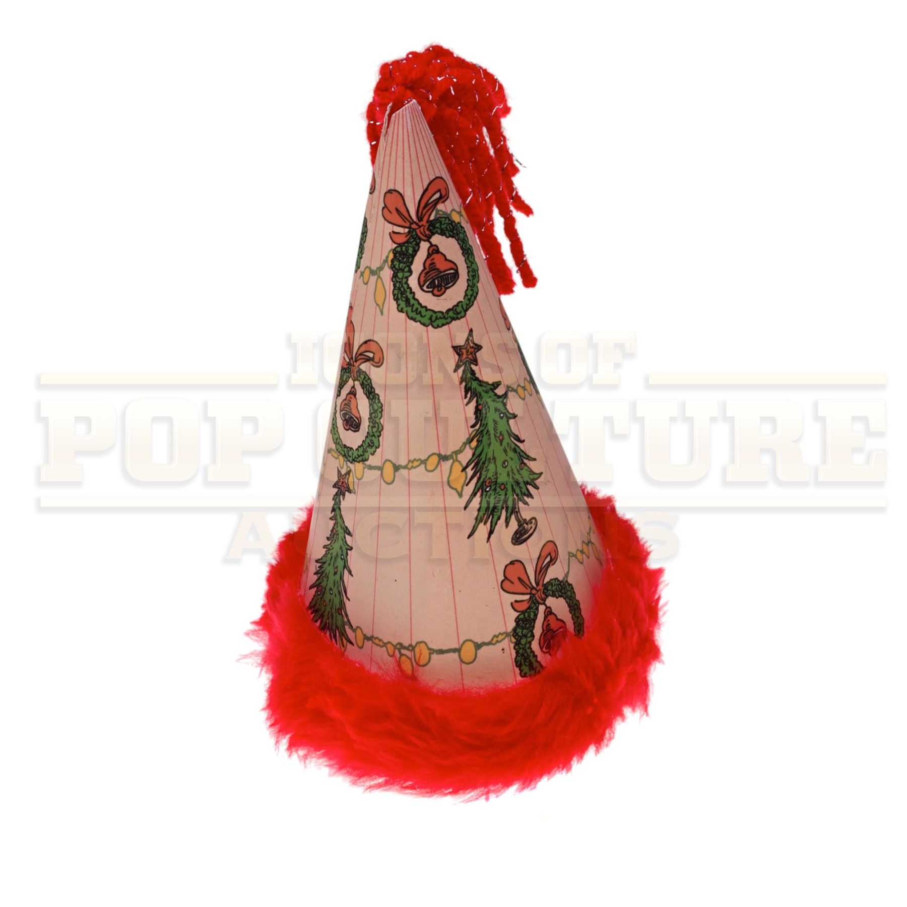 Straight from the heart of Whoville, this original party hat was custom-crafted for use by Max the dog in Ron Howard’s How the Grinch Stole Christmas (2000). Designed in perfect Seussian fashion, the cone-shaped hat is made of printed card stock with Christmas trees, wreaths, ornaments, and festive string lights, capturing the playful charm of the film’s iconic holiday world.