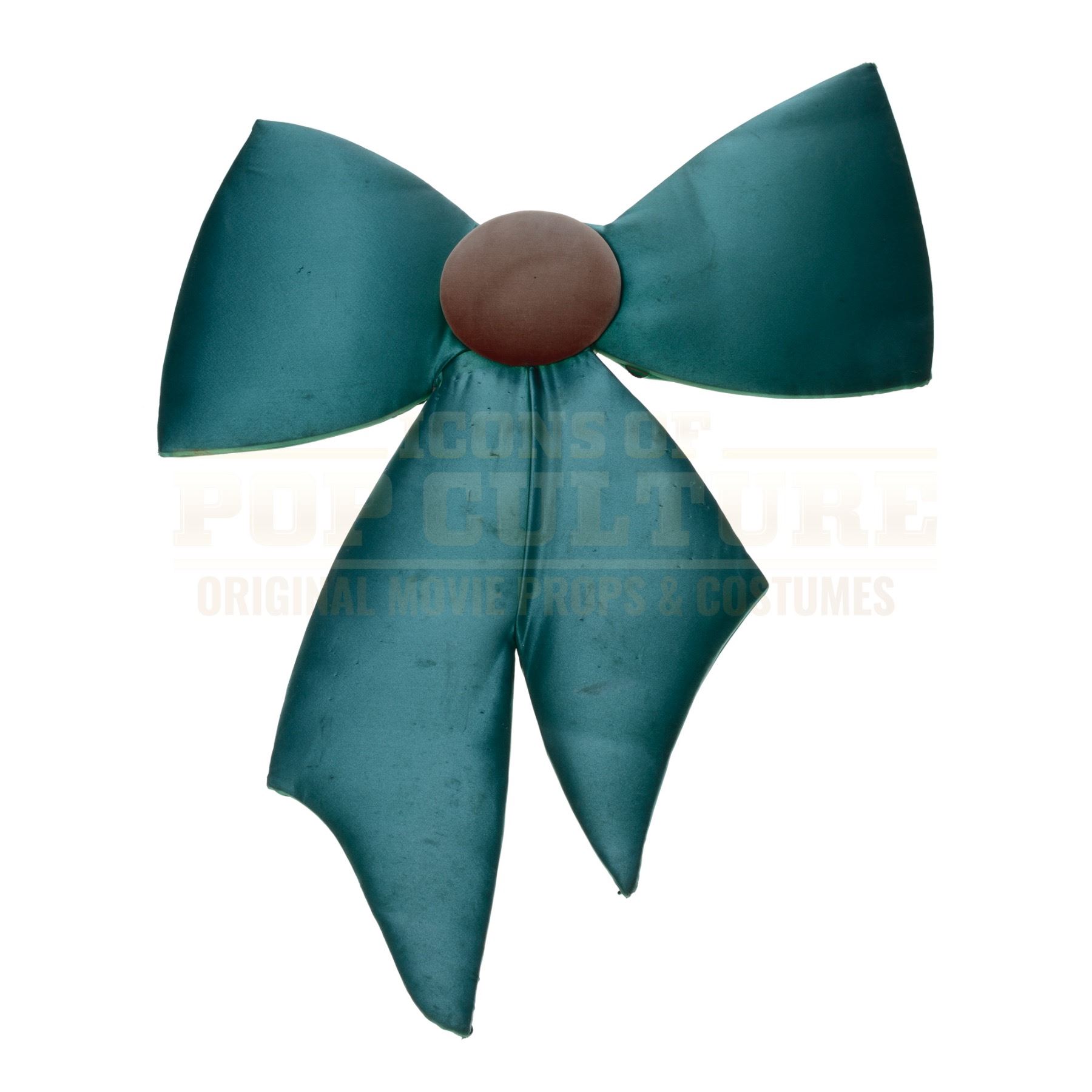 This prop Christmas bow was custom-made by the production for use in the Mayors Dining Room as a finishing touch to the curtains. The large green bow is made of soft material over a wood base and measures an impressive 28” tall x 22” wide. Wear from use and storage is present.