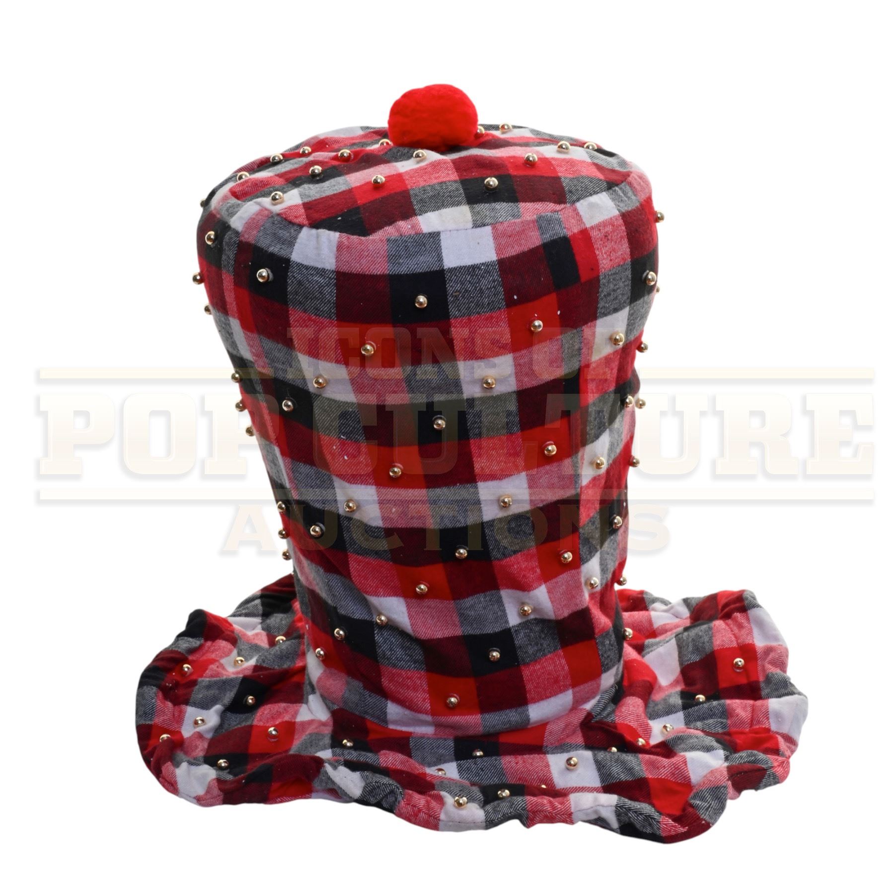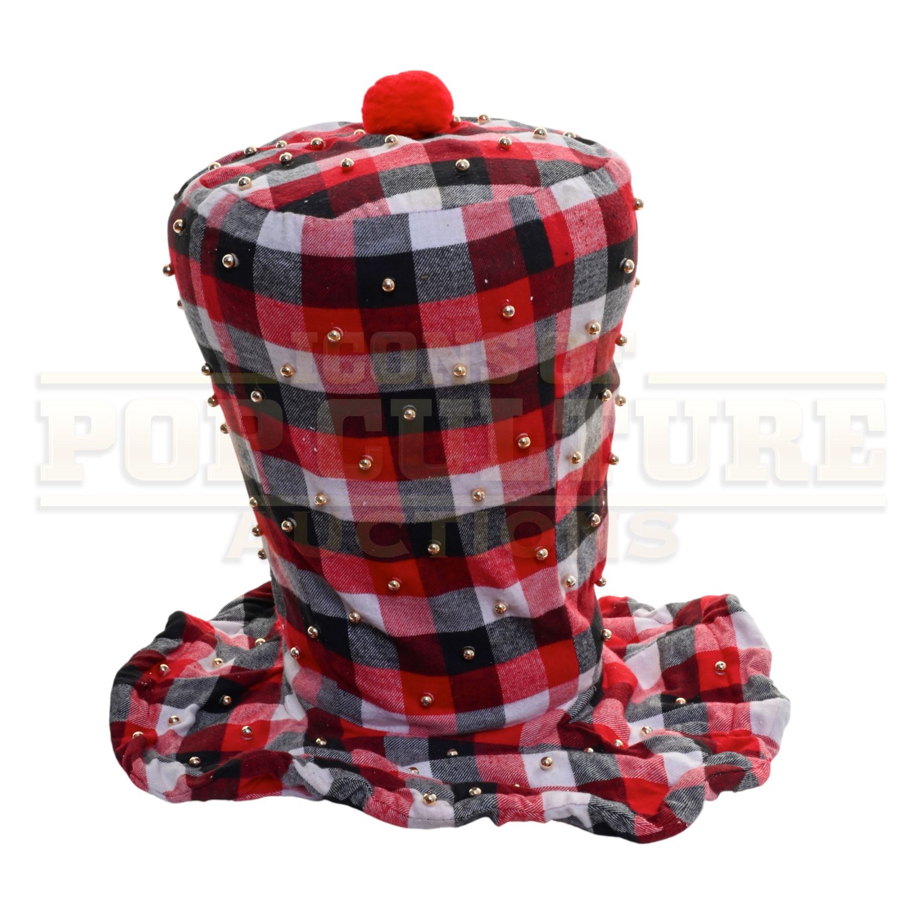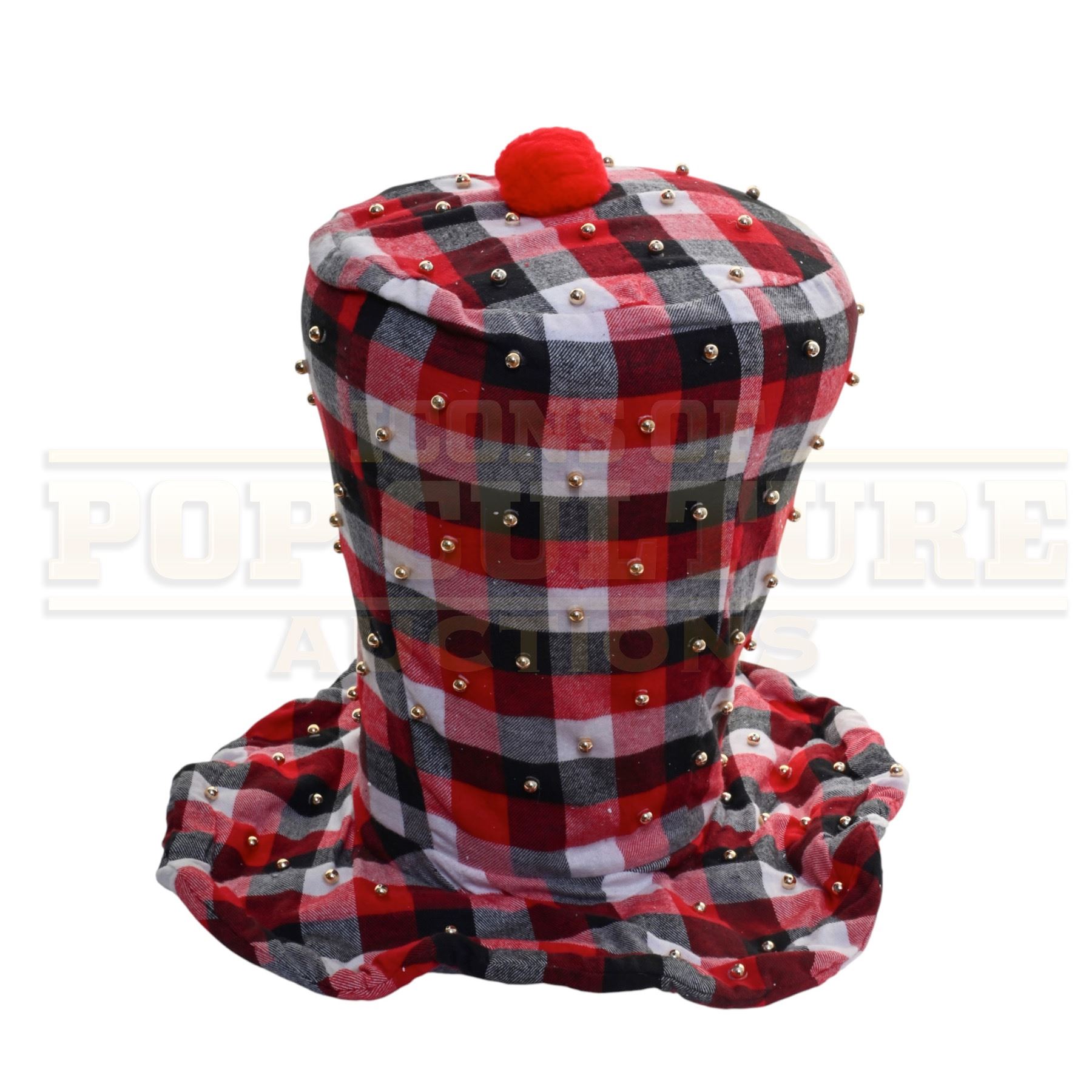 Crafted with red, black, and gray plaid fabric and embellished with dozens of gleaming gold studs, the hat features an exaggerated flared brim and a classic Who-style round red pom-pom atop its crown. Built over a sturdy internal frame with a fabric-lined opening on the underside, the piece displays beautifully and retains all the playful, festive charm seen throughout Whoville’s bustling marketplace.