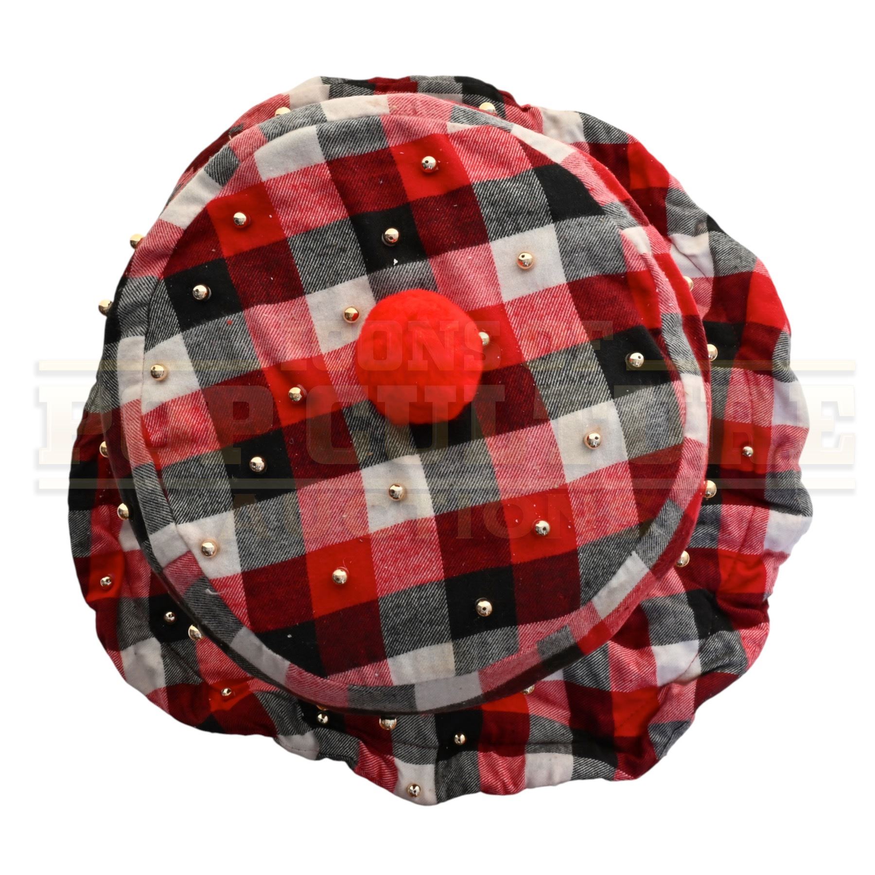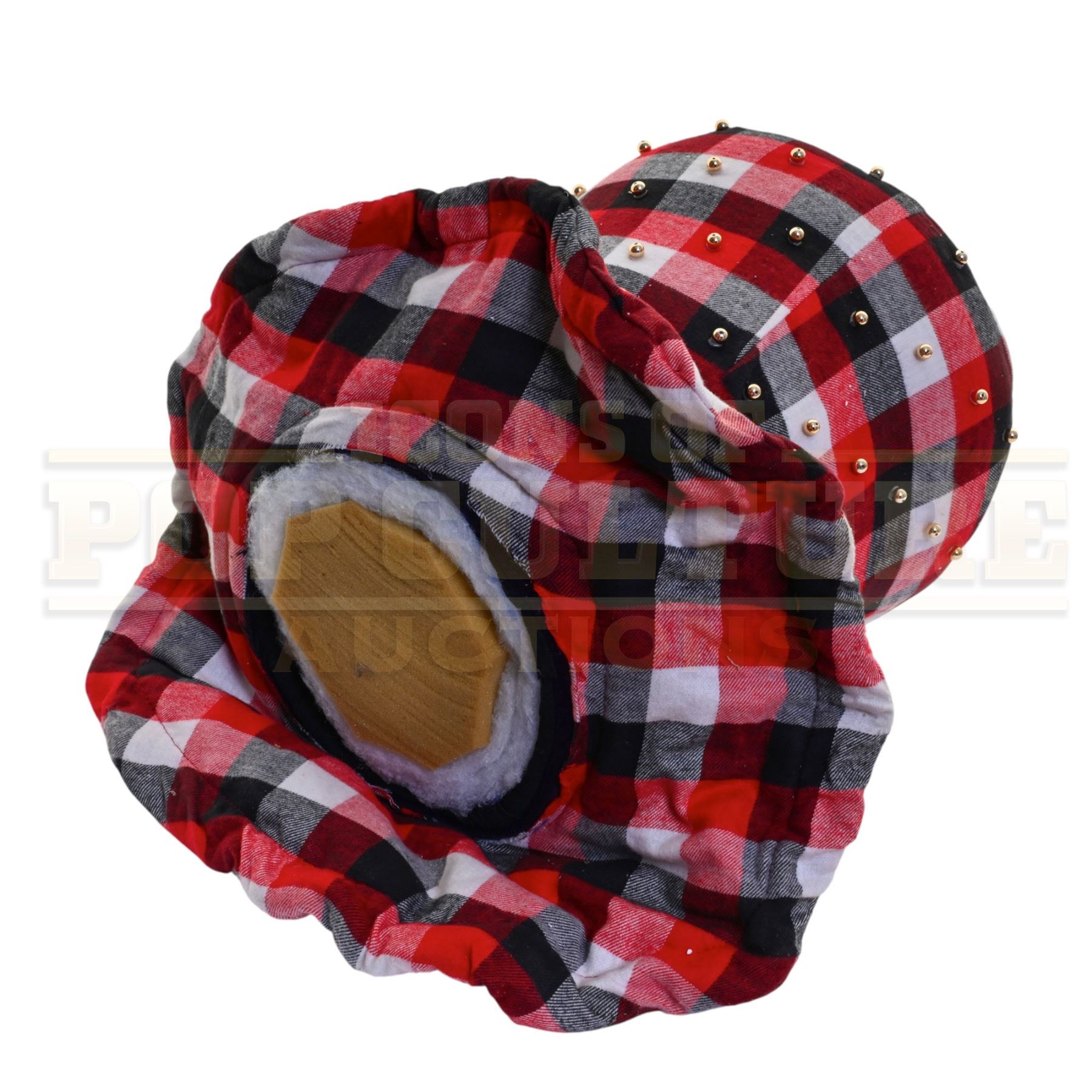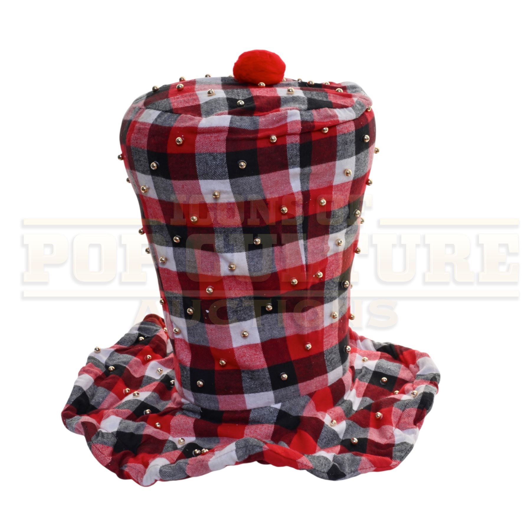 Crafted with red, black, and gray plaid fabric and embellished with dozens of gleaming gold studs, the hat features an exaggerated flared brim and a classic Who-style round red pom-pom atop its crown. Built over a sturdy internal frame with a fabric-lined opening on the underside, the piece displays beautifully and retains all the playful, festive charm seen throughout Whoville’s bustling marketplace.