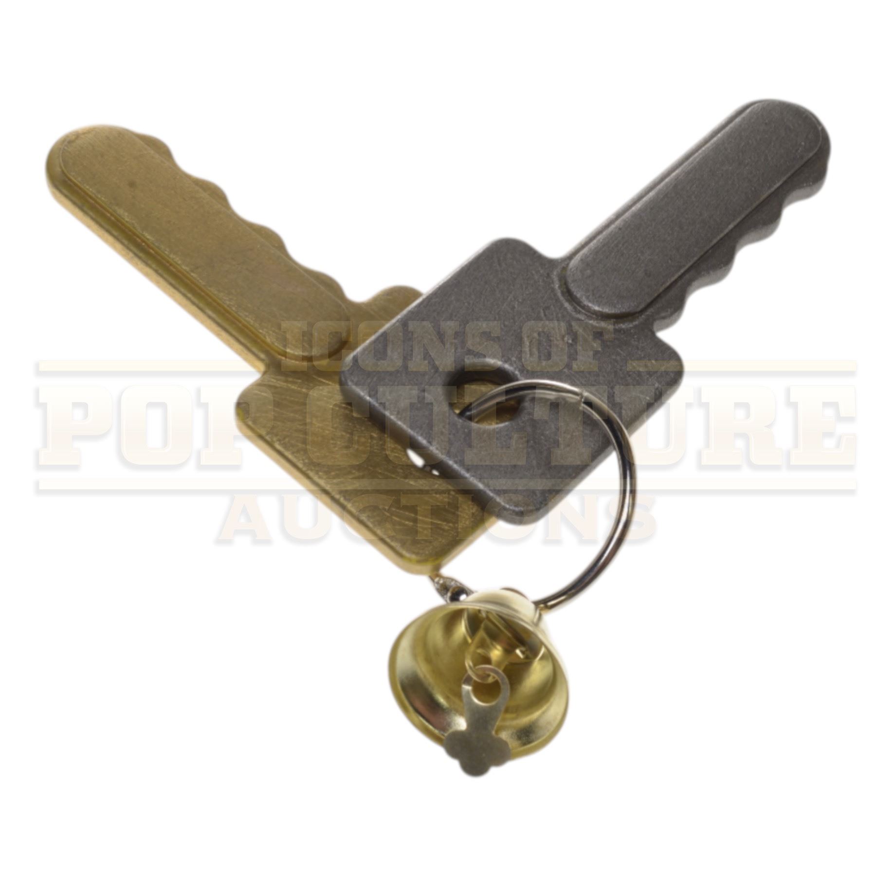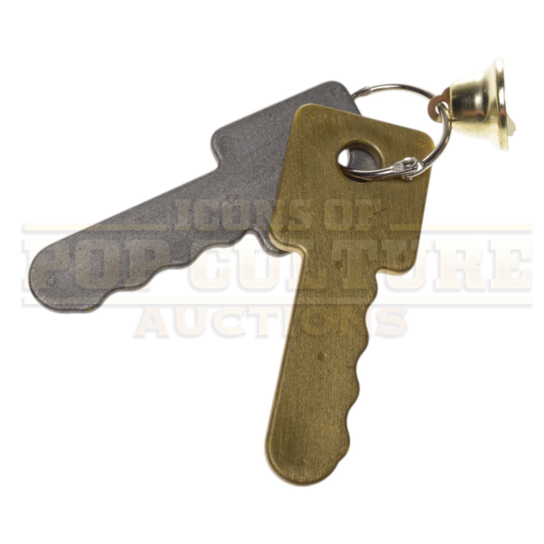 This whimsical set of oversized plastic keys was used on screen in Ron Howard’s 2000 holiday classic "How the Grinch Stole Christmas." Measuring approximately 4" x 1.5" each, the gold and silver-toned prop keys are attached to a metal keyring adorned with a small jingle bell, capturing the charming, Seussian aesthetic of Whoville.