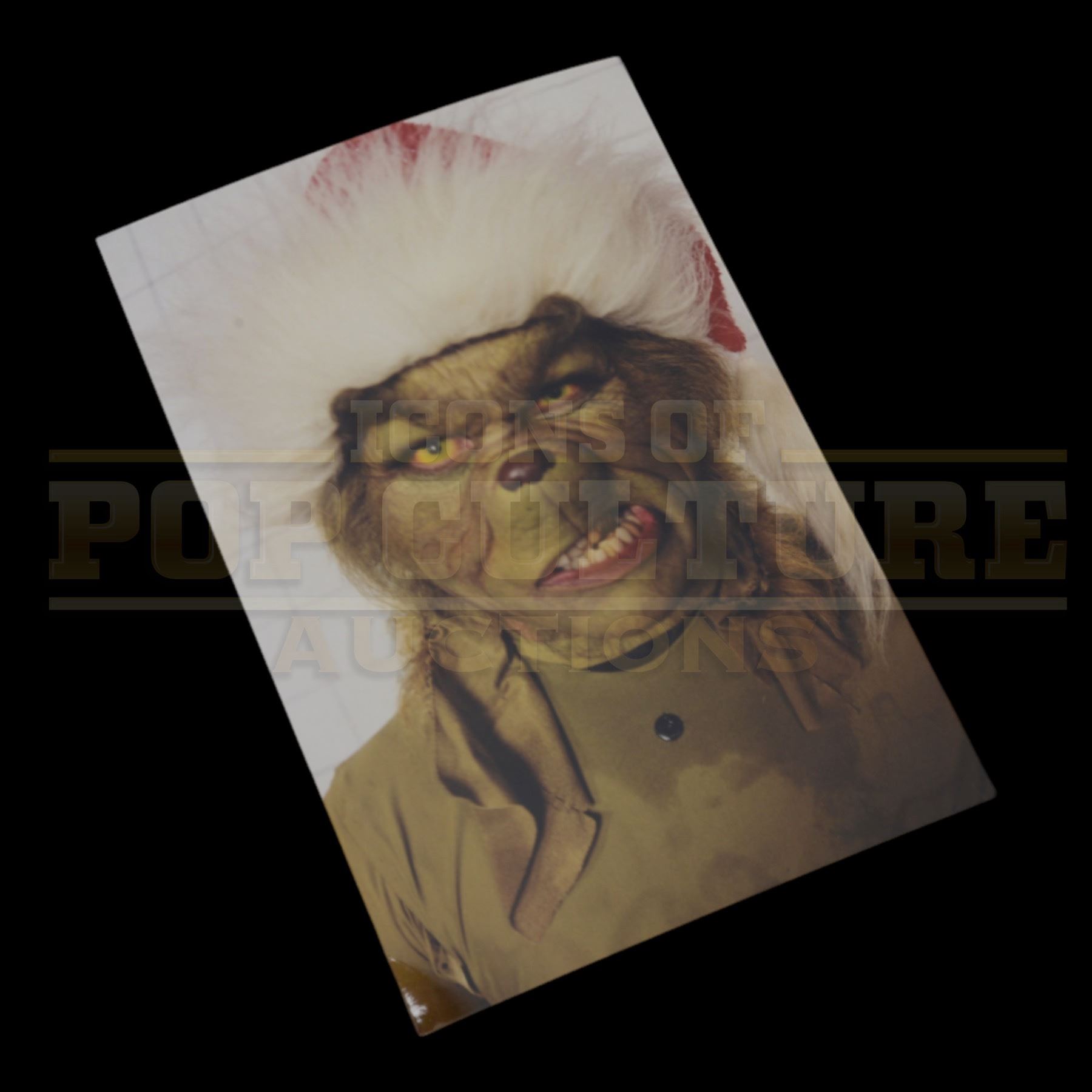 This is an original 4" x 6" production-used make-up and costume reference photograph of Jim Carrey in full Grinch transformation, taken during the production of Ron Howard’s "How the Grinch Stole Christmas" (2000). Capturing Carrey mid-sneer and fully suited in the iconic green fur, Santa hat, and prosthetic detail, this photo was used by the make-up and wardrobe departments to ensure continuity throughout the demanding shoot.