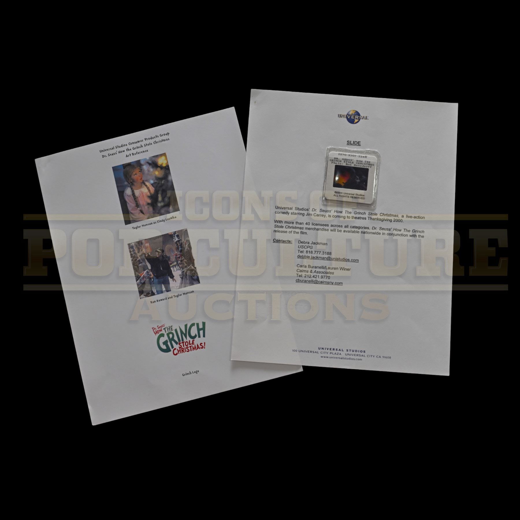 Also included are Universal Pictures press releases outlining merchandising partnerships, “Grinch by the Numbers” production trivia, and marketing contacts, as well as one original 35mm color slide transparency used for media reproduction. Together, these materials capture the full scope of Universal’s marketing campaign for one of the most ambitious and successful holiday films ever produced.