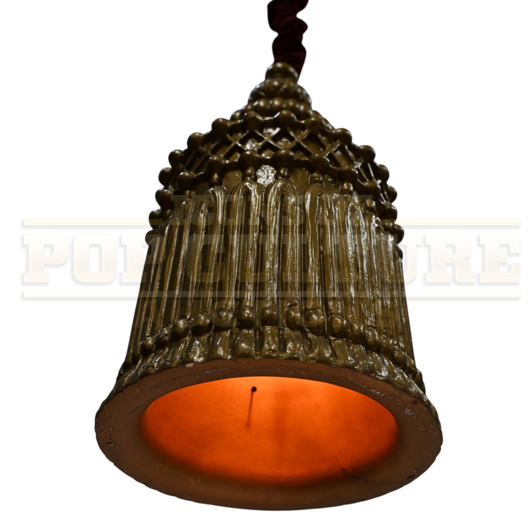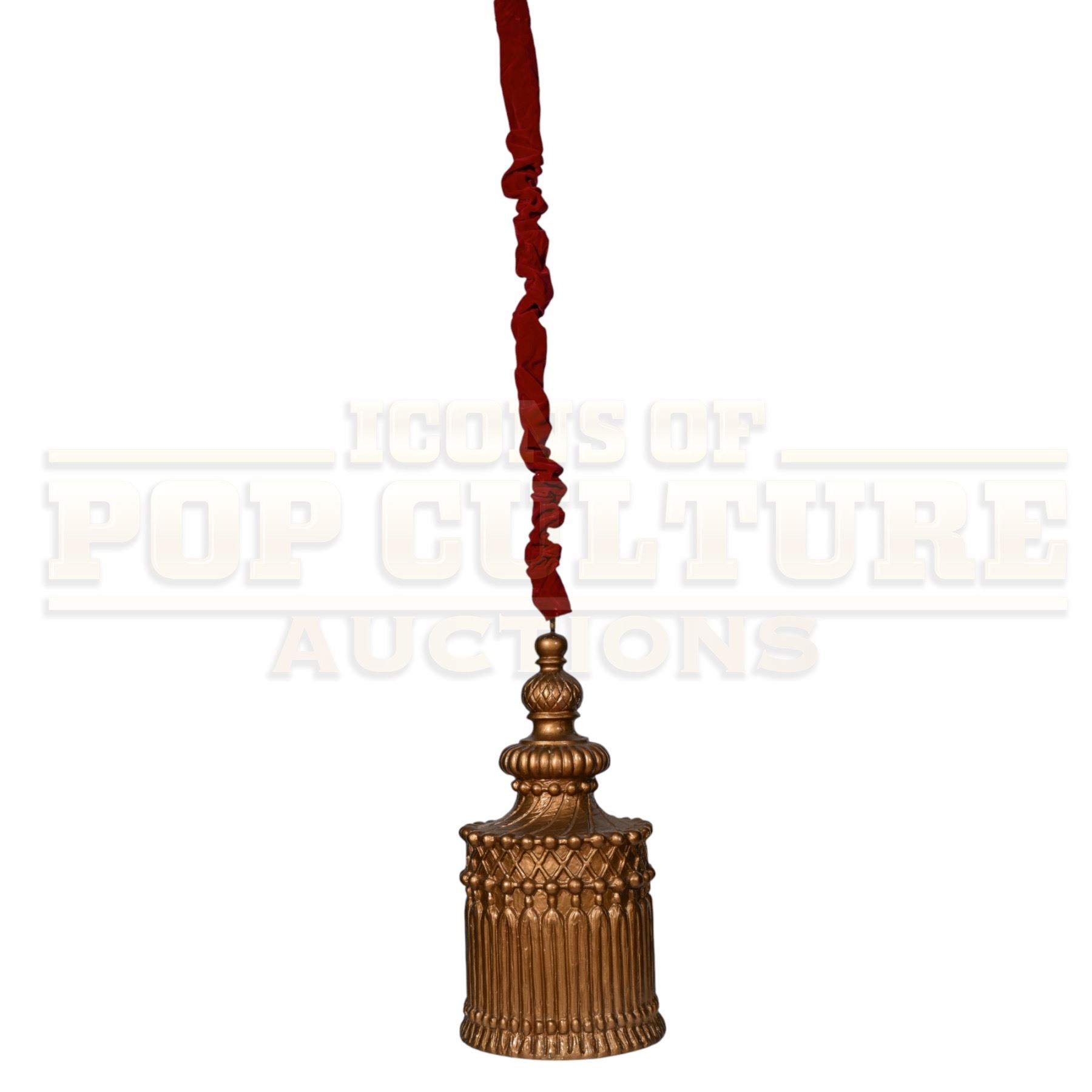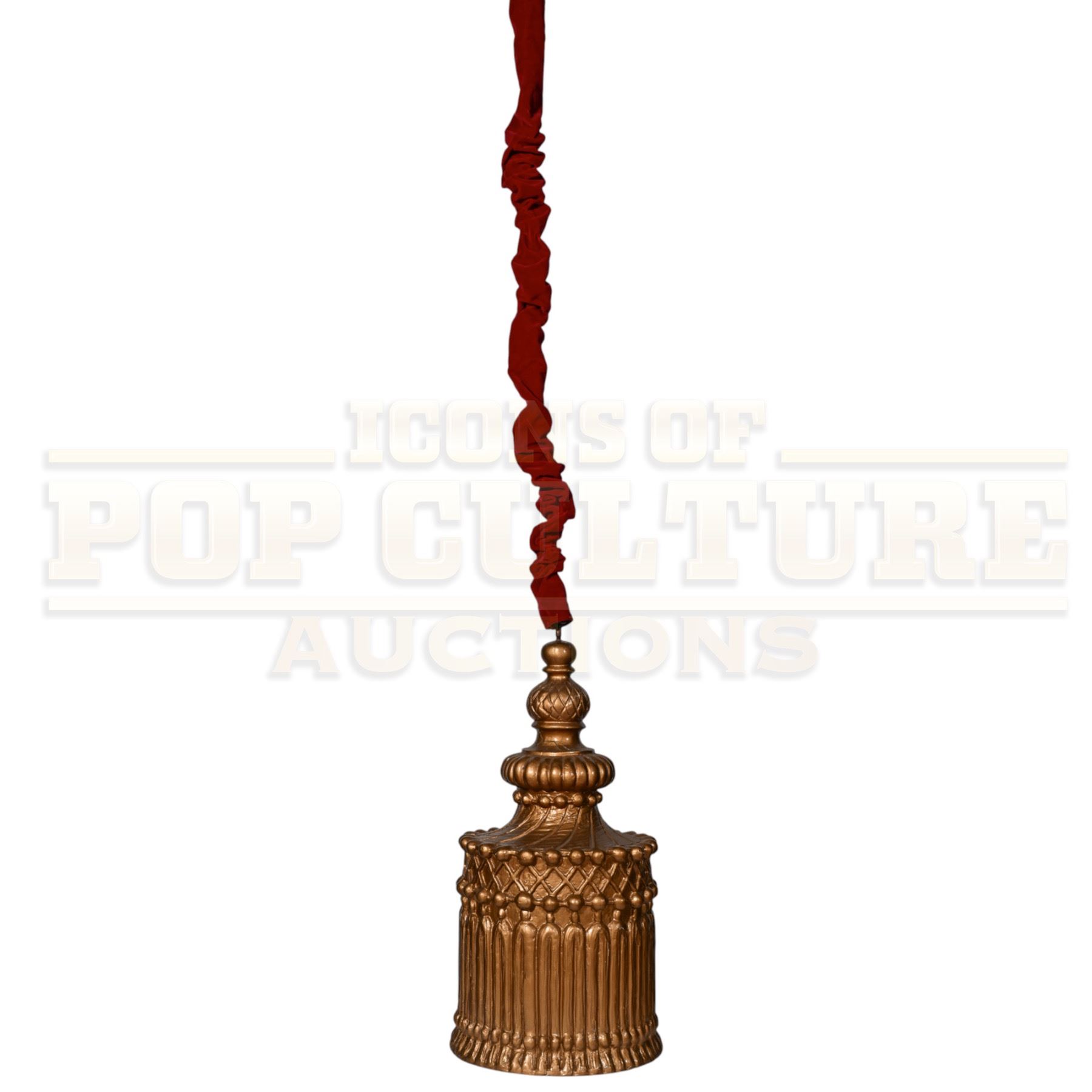 A length of red gathered cloth covers the hanging cord, another signature Whoville flourish, adding soft texture and vibrant color to the sculpted golden structure. The chandelier is one of the wonderfully odd, Seussian fixtures that brought Farfingles to life during filming, making it an exceptional display piece for collectors who want a true statement item from the movie’s handcrafted production world.