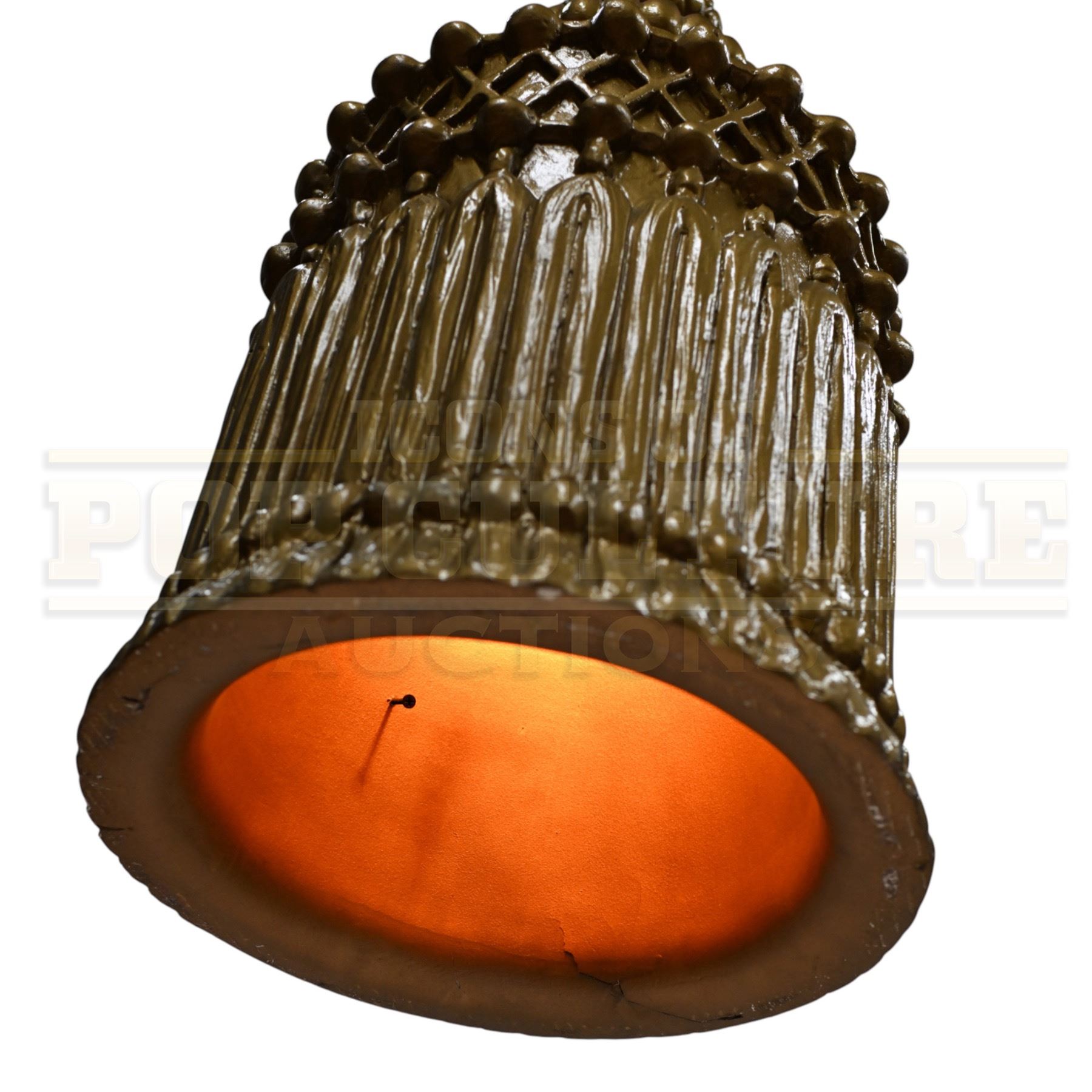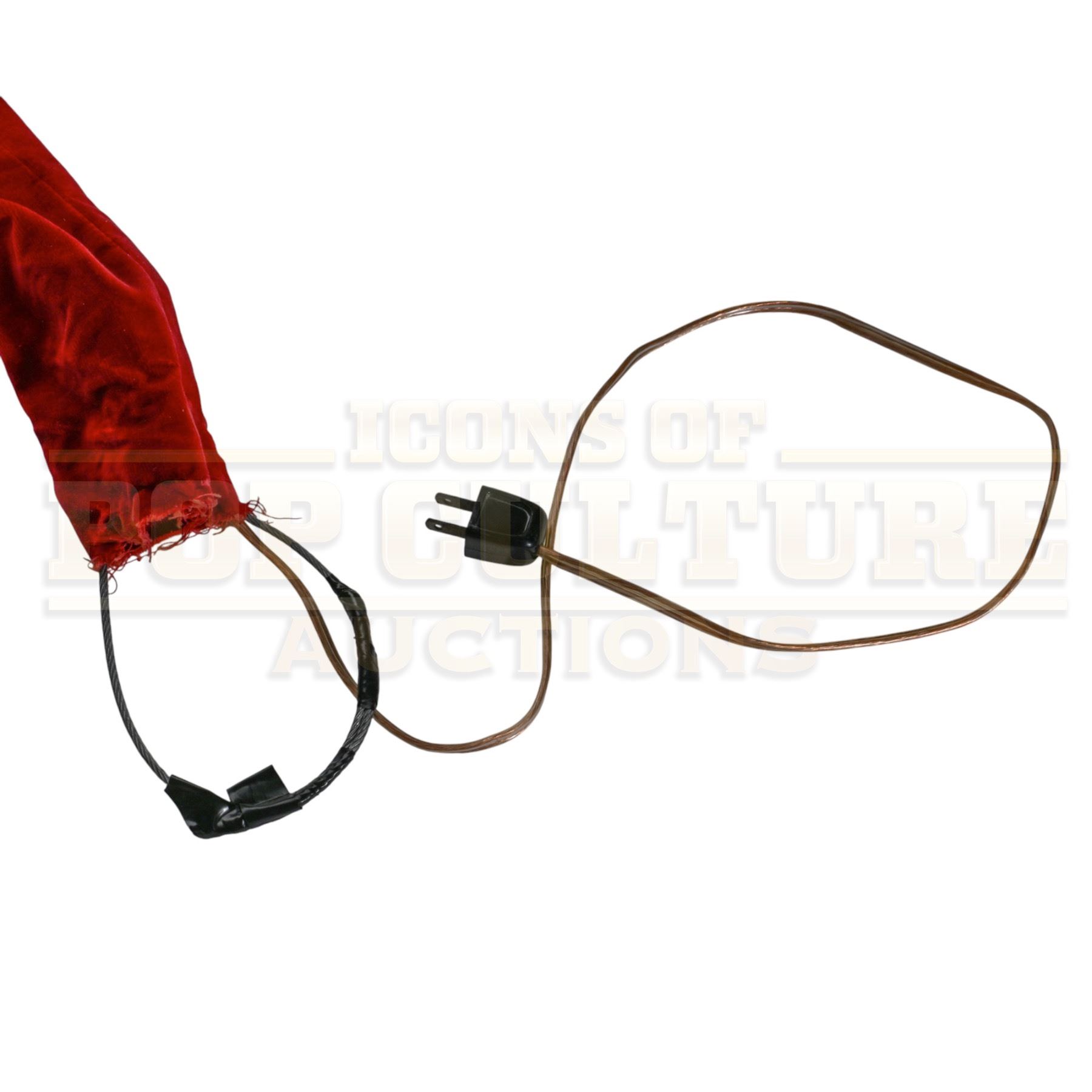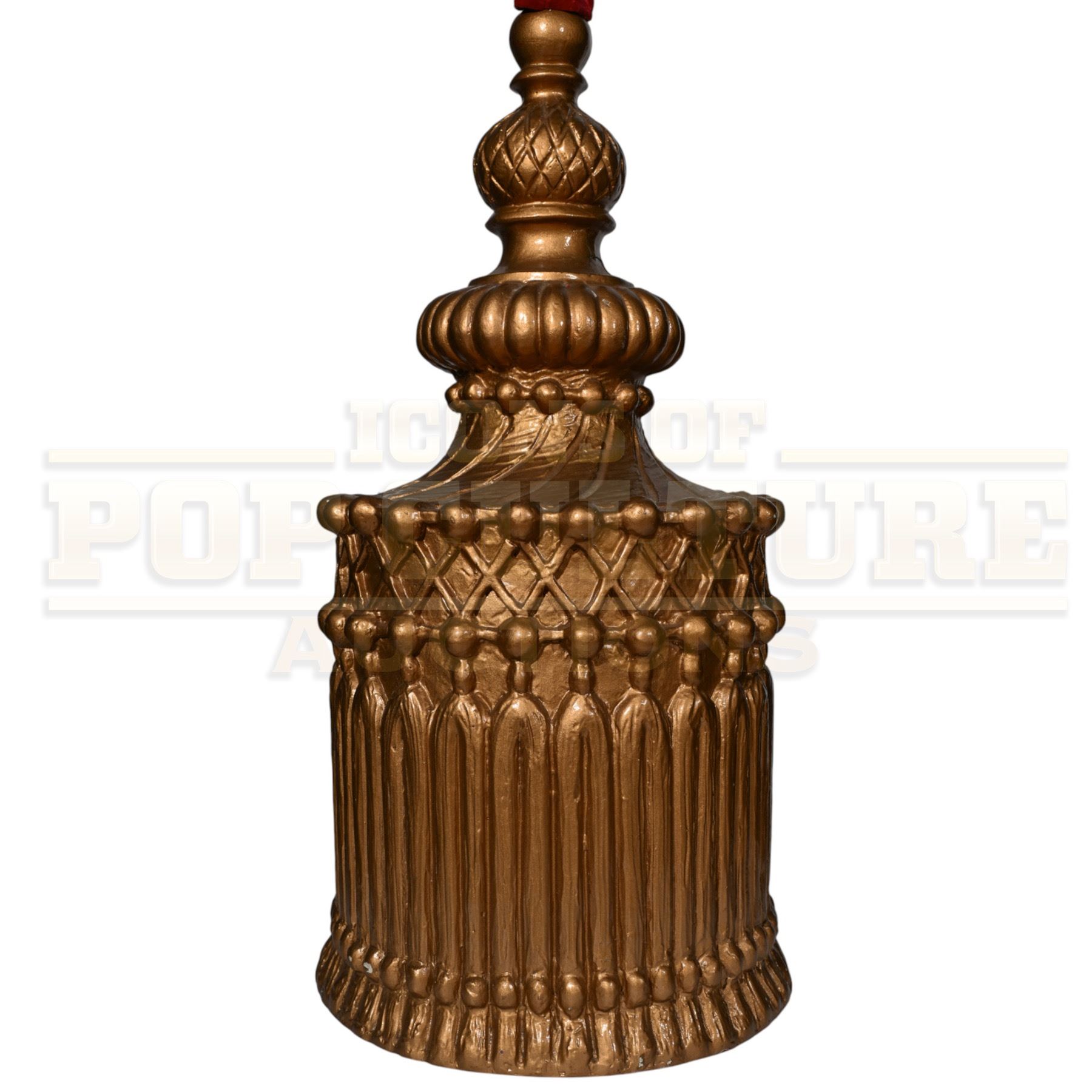 A length of red gathered cloth covers the hanging cord, another signature Whoville flourish, adding soft texture and vibrant color to the sculpted golden structure. The chandelier is one of the wonderfully odd, Seussian fixtures that brought Farfingles to life during filming, making it an exceptional display piece for collectors who want a true statement item from the movie’s handcrafted production world.