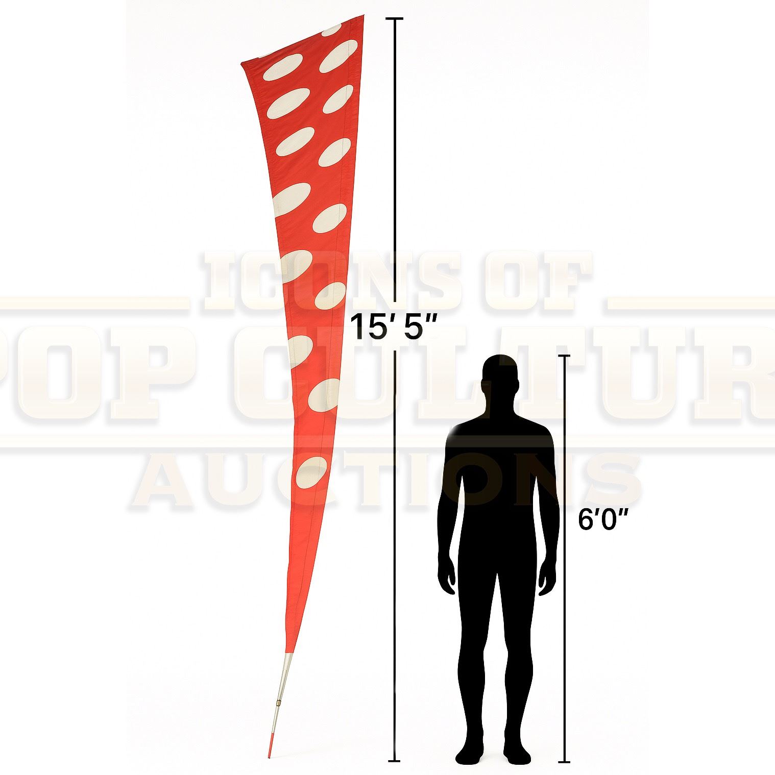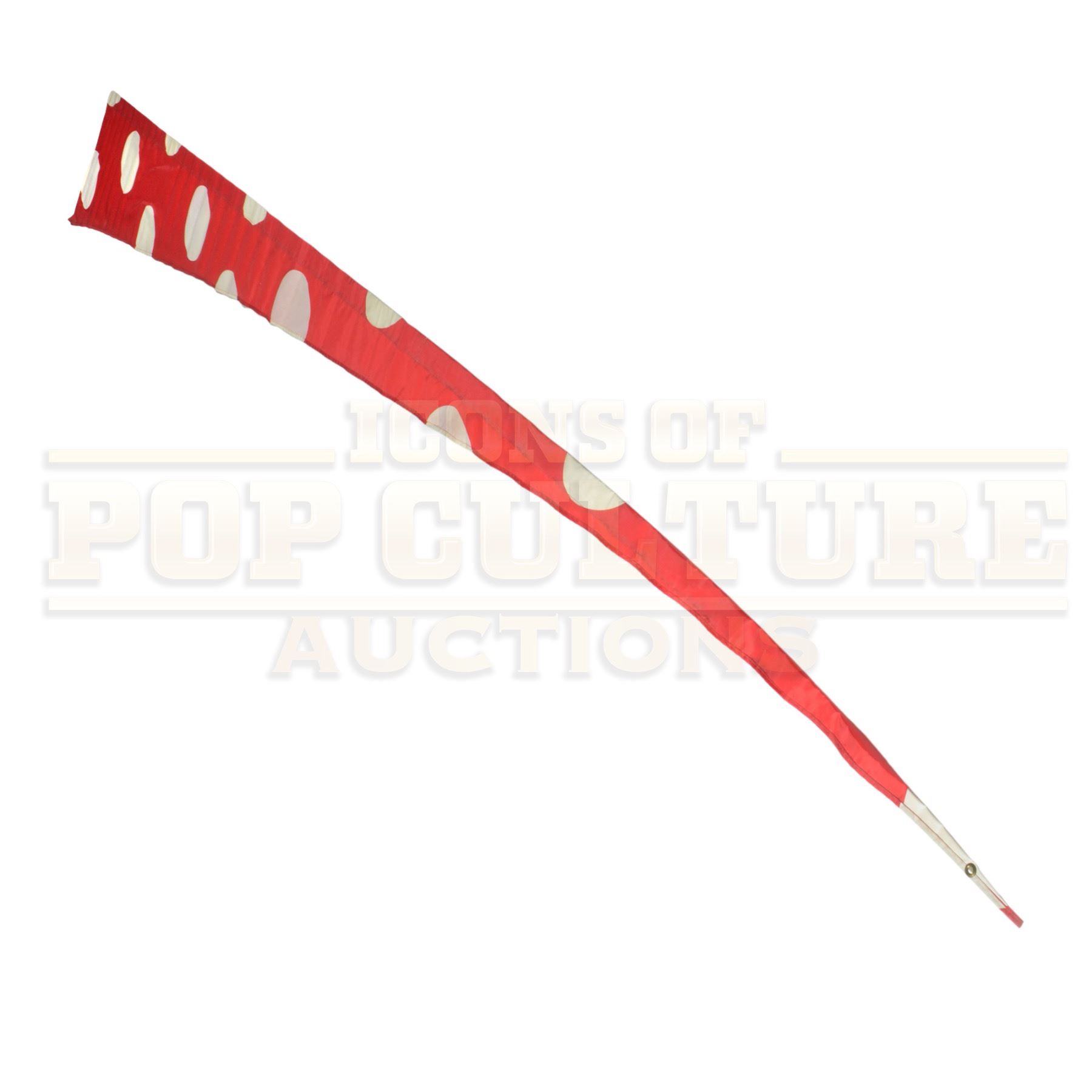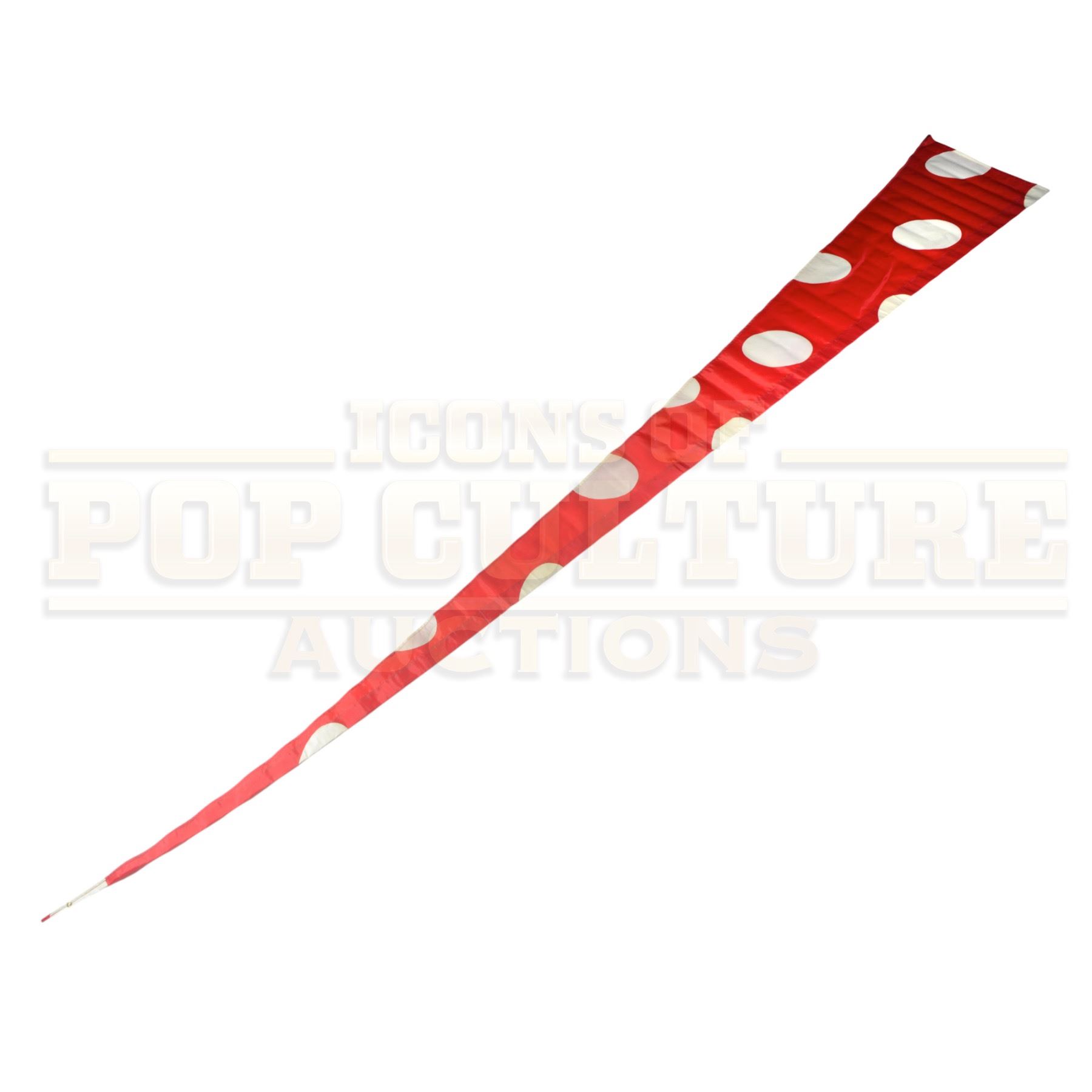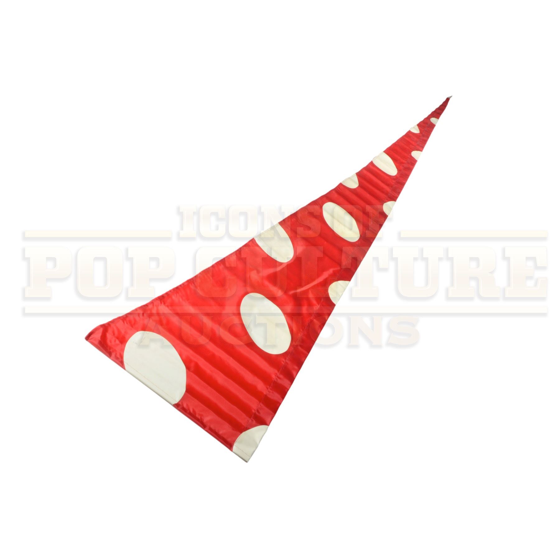 This spectacular oversized flag was custom-made by the production of How the Grinch Stole Christmas (2000) and used as festive set dressing throughout the vibrant, topsy-turvy world designed for the film. Towering at an incredible 15 feet 5 inches long, the flag’s exaggerated triangular shape and bold red-and-white polka-dot pattern are instantly recognizable as signature Whoville style, bright, cheerful, and delightfully over-the-top.