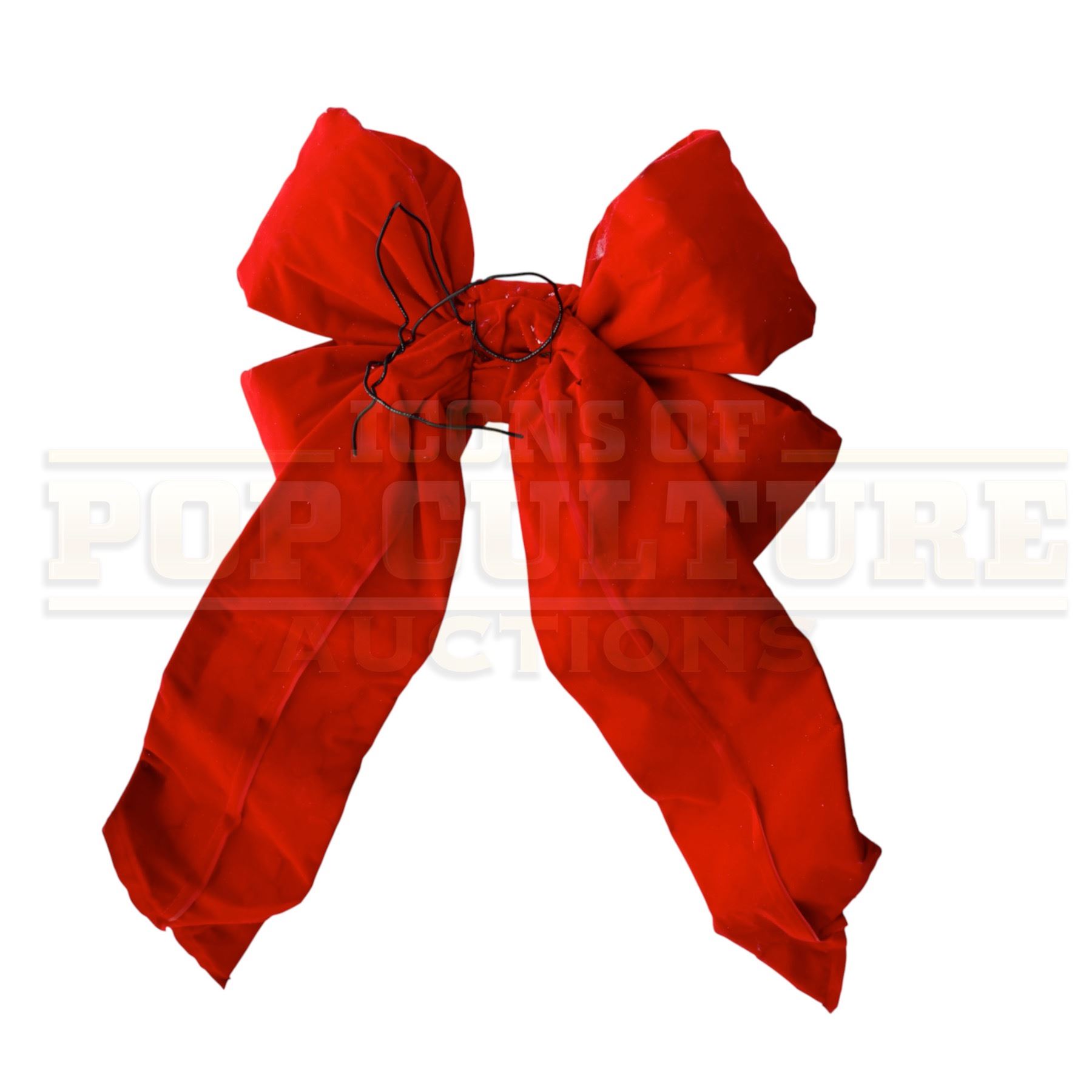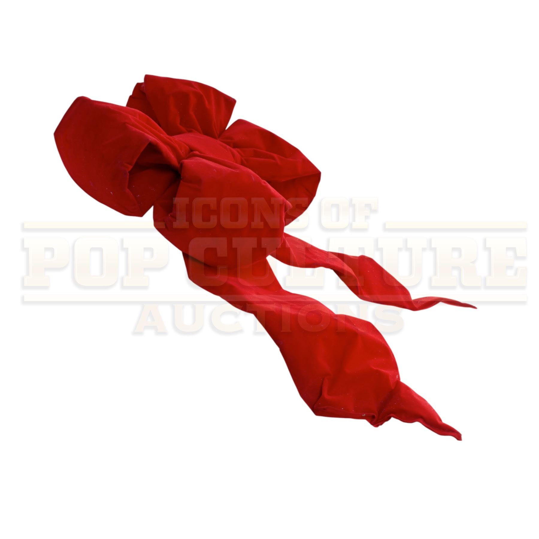 Bursting with whimsical holiday charm, this oversized red bow was custom-made by the production of Ron Howard’s How the Grinch Stole Christmas for use as festive set dressing throughout the vibrant town of Whoville. Crafted in true Seussian style, the bow’s exaggerated proportions and bold color instantly evoke the film’s playful aesthetic. Constructed from bright red fabric over a wire-supported form, the piece displays the signature curled tails and puffy loops seen adorning buildings, props, and décor in the bustling Whoville streets.