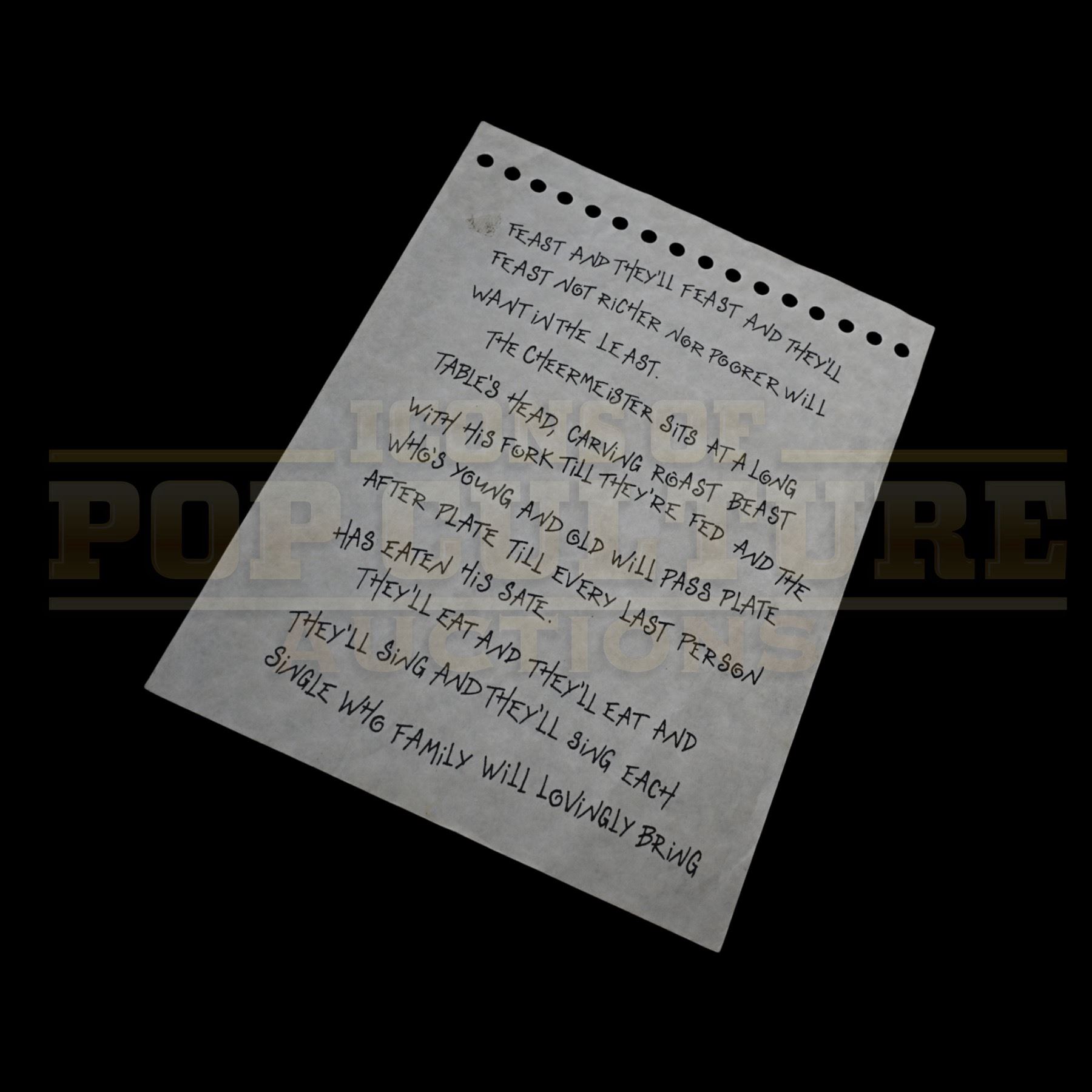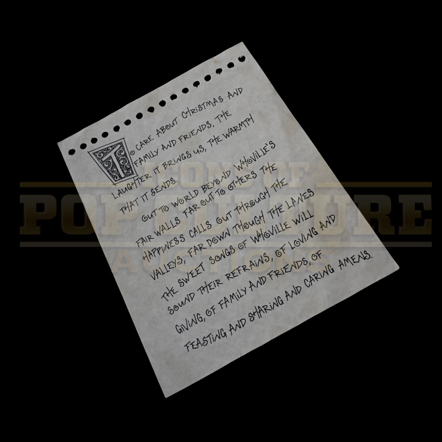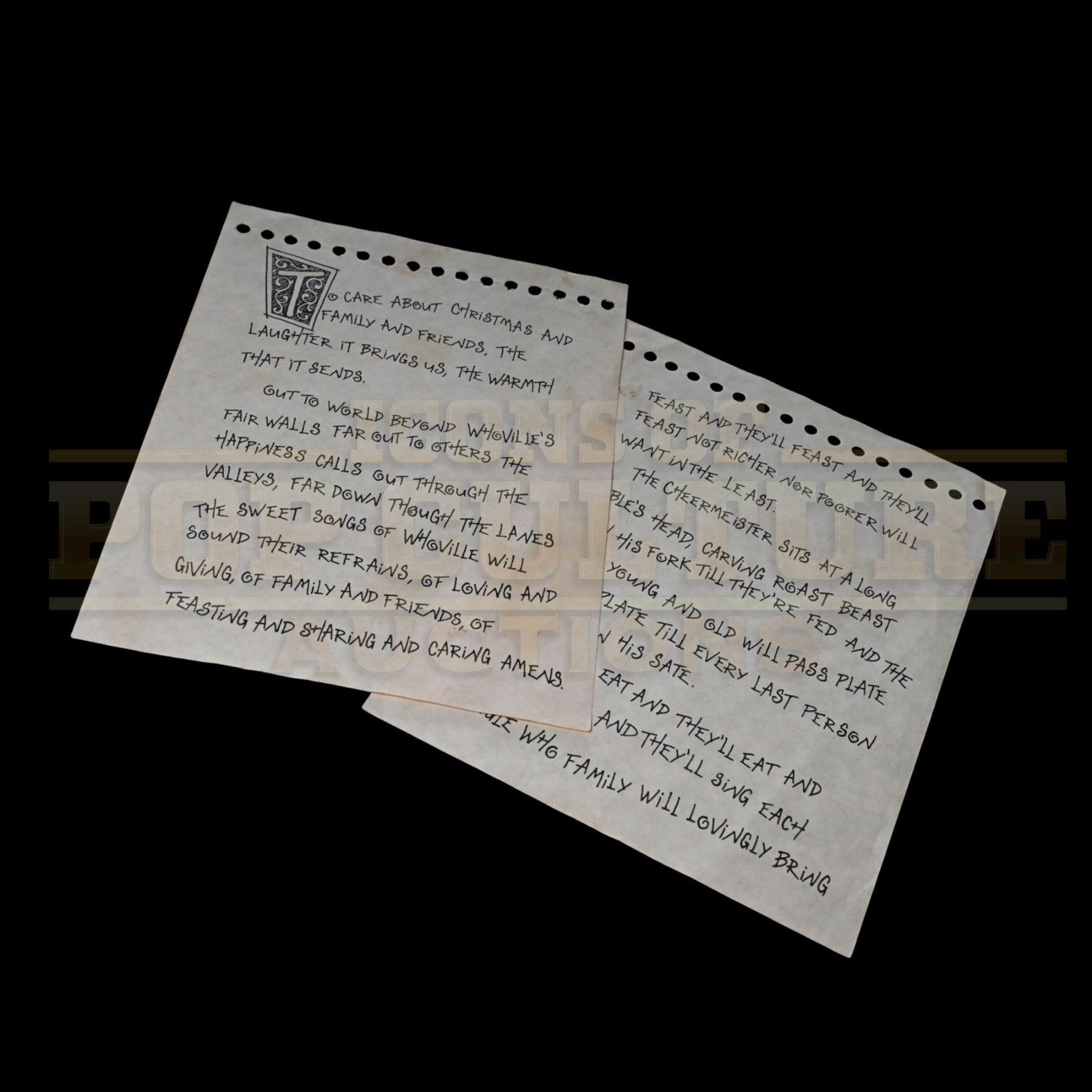 Each page is printed on specially aged paper with a line of punched holes across the top. The text contains iconic Whoville narration, including references to roast beast, feasting, singing, and the spirit of Christmas that echoes throughout the story. While these particular pages were created as production back-ups, they remain faithful to the film’s on-screen aesthetics and serve as wonderful artifacts from one of the most visually distinctive holiday films ever made.