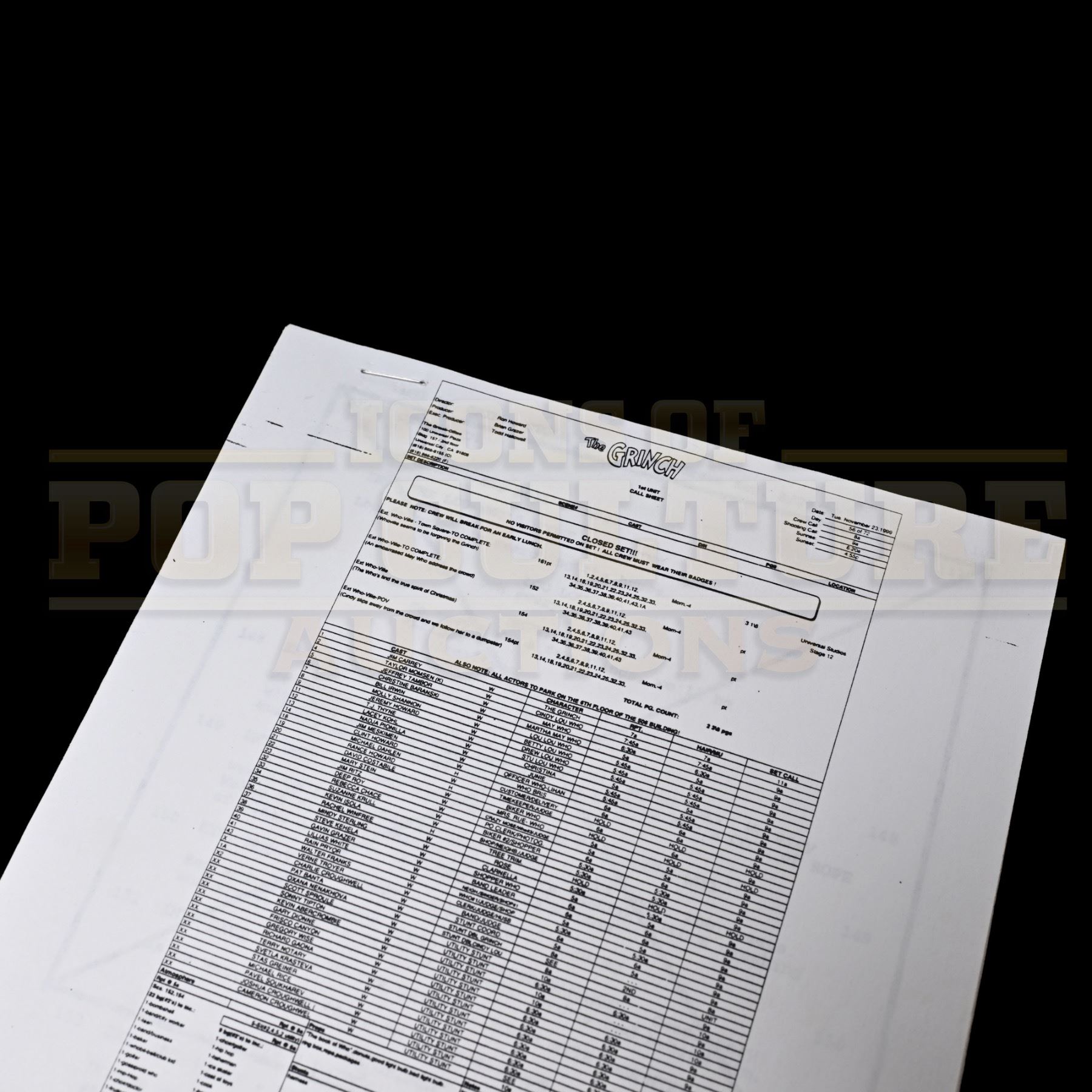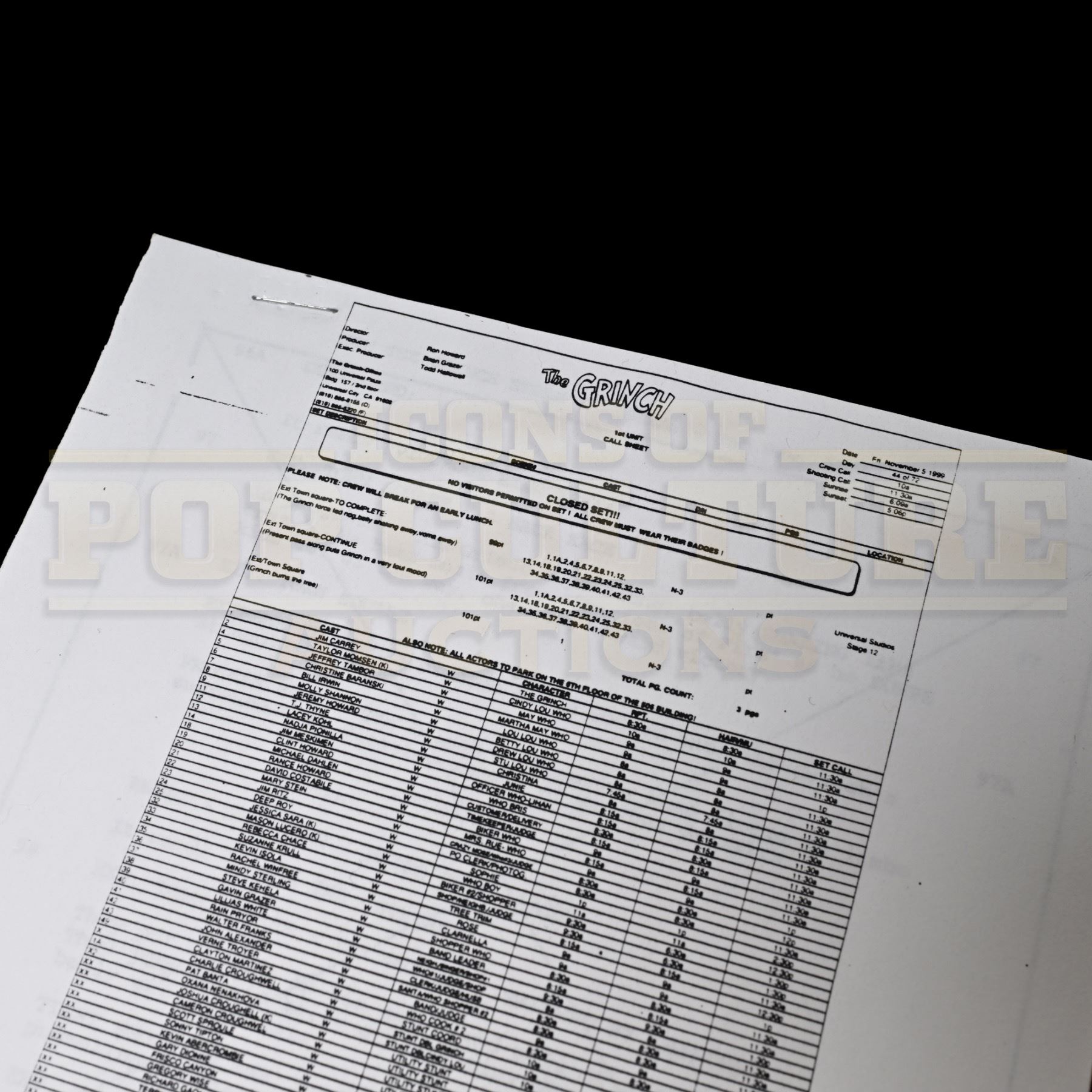 The pages bear the distinctive The Grinch production header. These sides represent the intense attention to detail and collaboration required to bring Whoville and the Grinch’s lair to life, an elaborate production that won the Academy Award for Best Makeup.