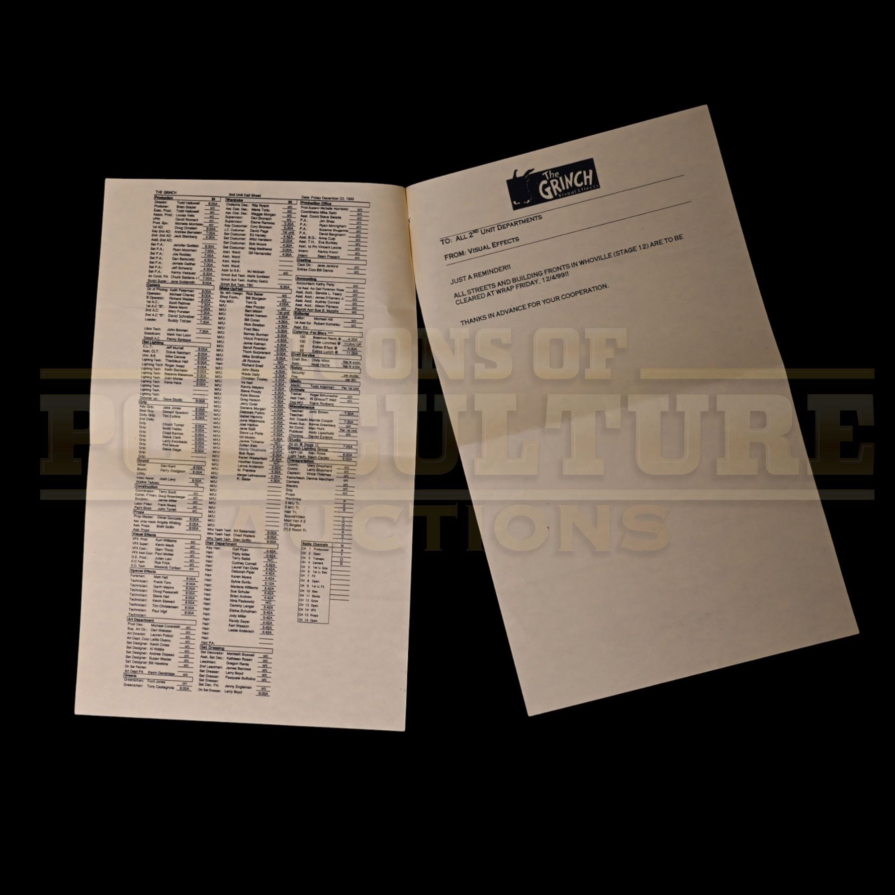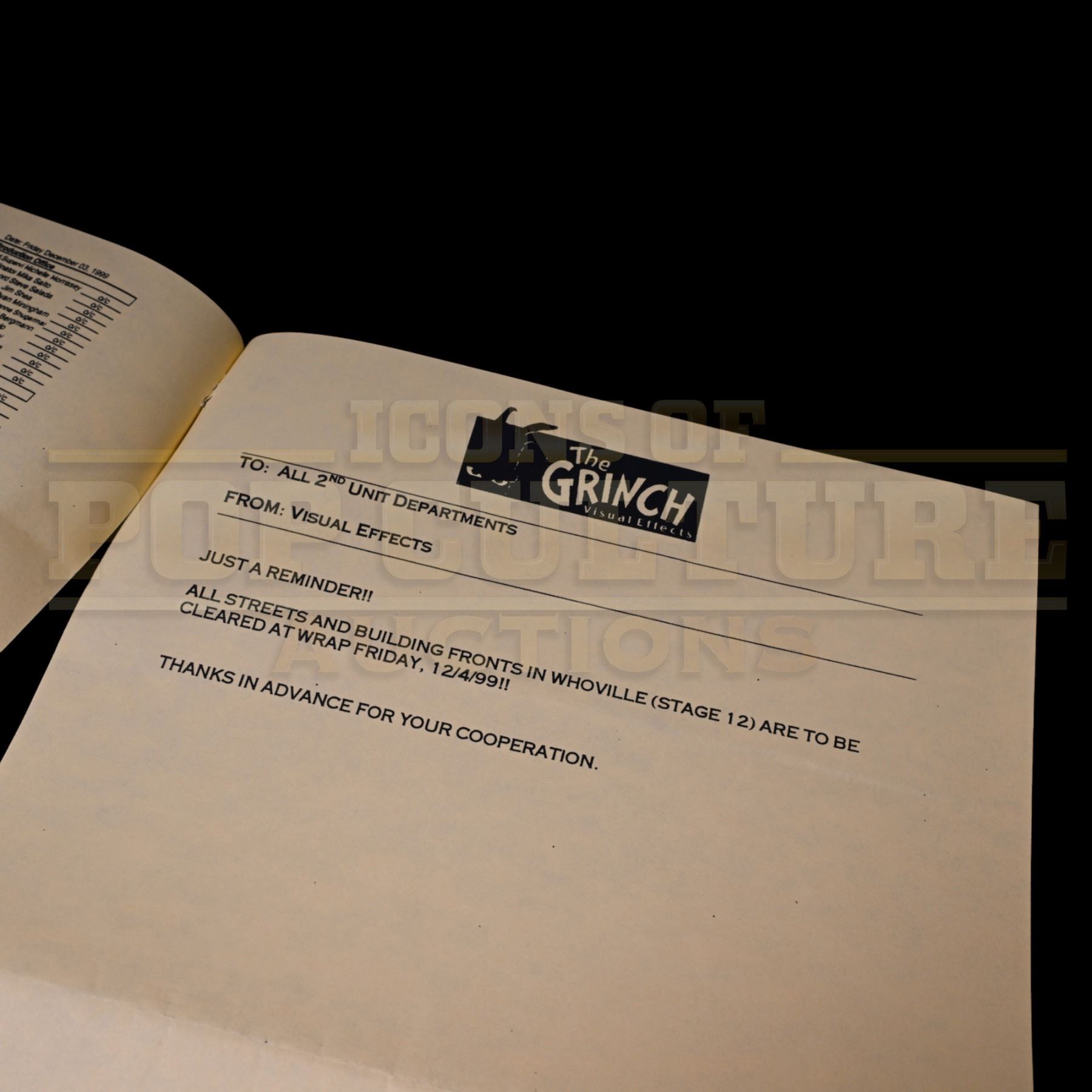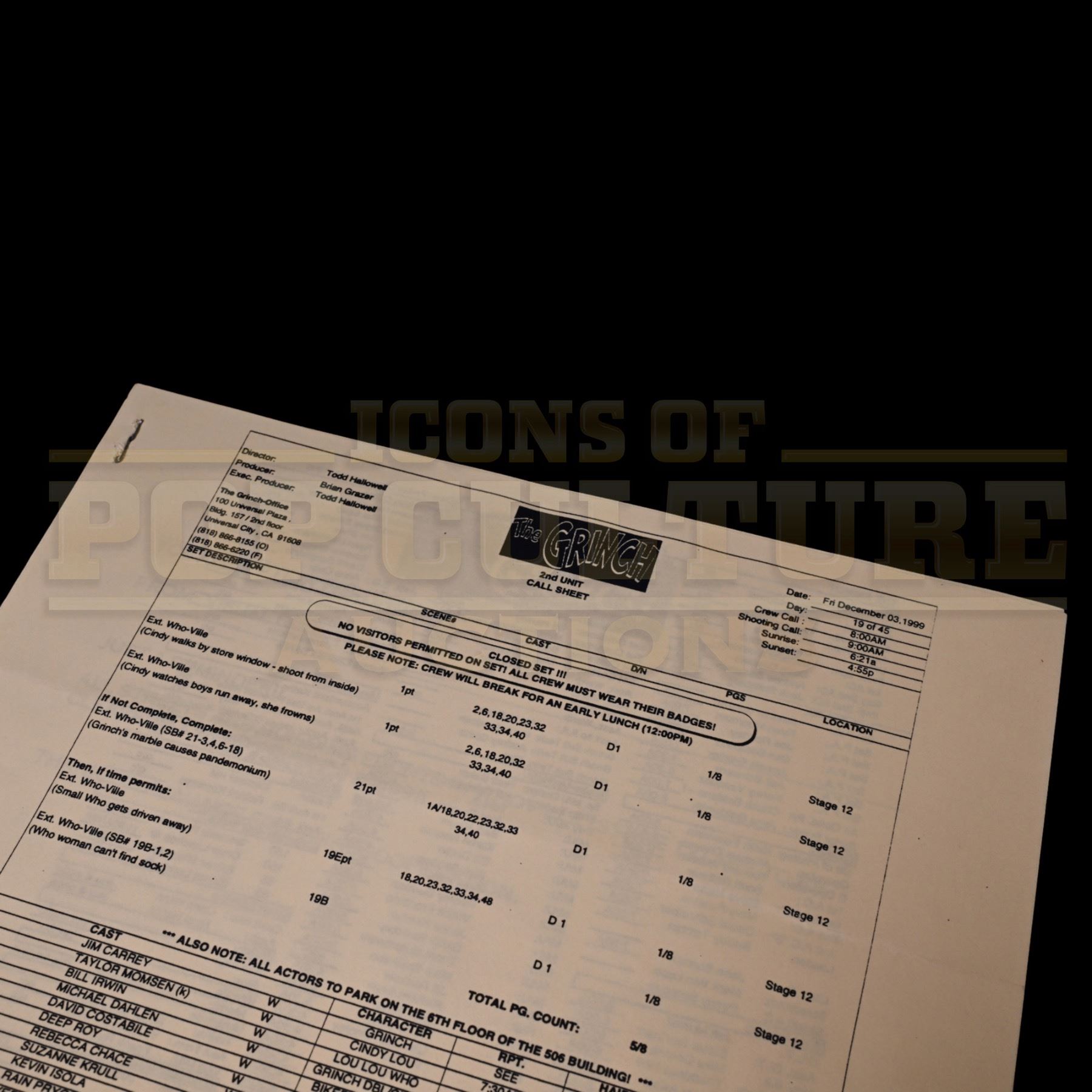 A genuine piece of holiday movie history, this original 14" x 8.5" production-used 2nd Unit Call Sheet, dated December 3, 1999 comes directly from the making of Ron Howard’s How the Grinch Stole Christmas. Issued during filming, this call sheet outlines the day’s shooting schedule, cast requirements, locations, department notes, and production logistics, providing a behind-the-scenes snapshot of the bustling Whoville set in full creative motion.