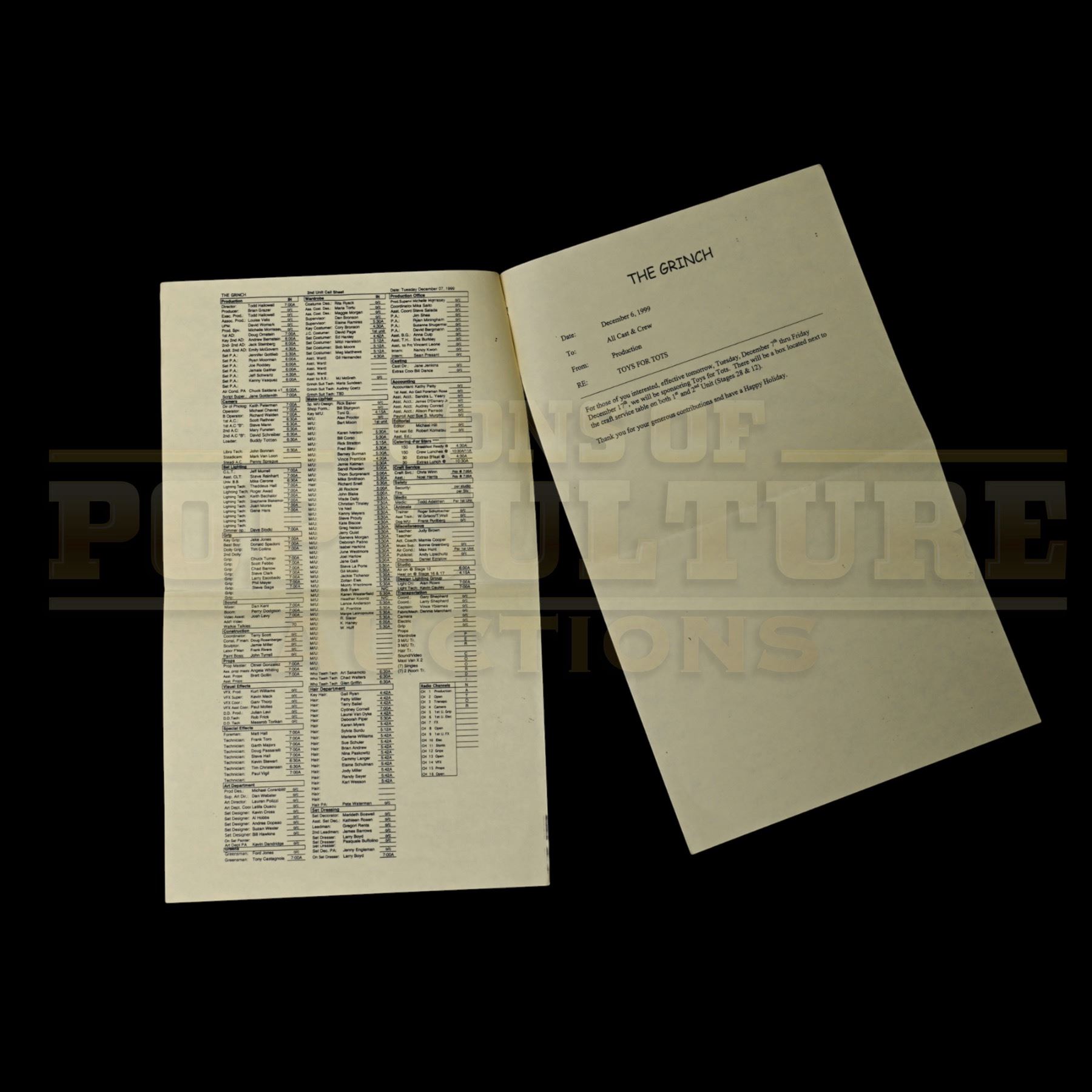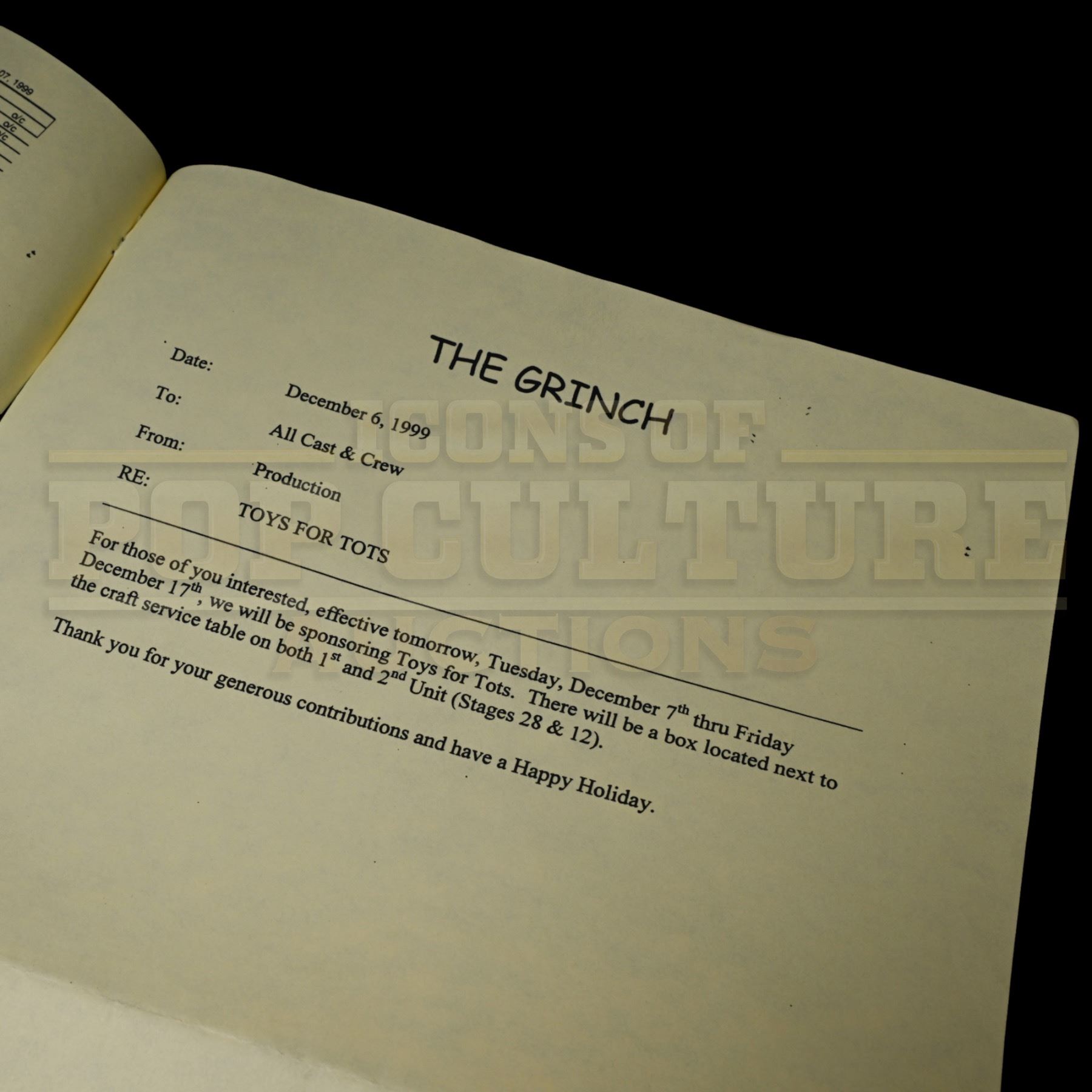 Attached is the official production memo, issued on The Grinch letterhead, addressed “To All Cast & Crew.” The letter, dated December 6, 1999, invites crew members to participate in a Toys for Tots donation drive, perfectly capturing the heartwarming and festive atmosphere that defined the film’s production.
