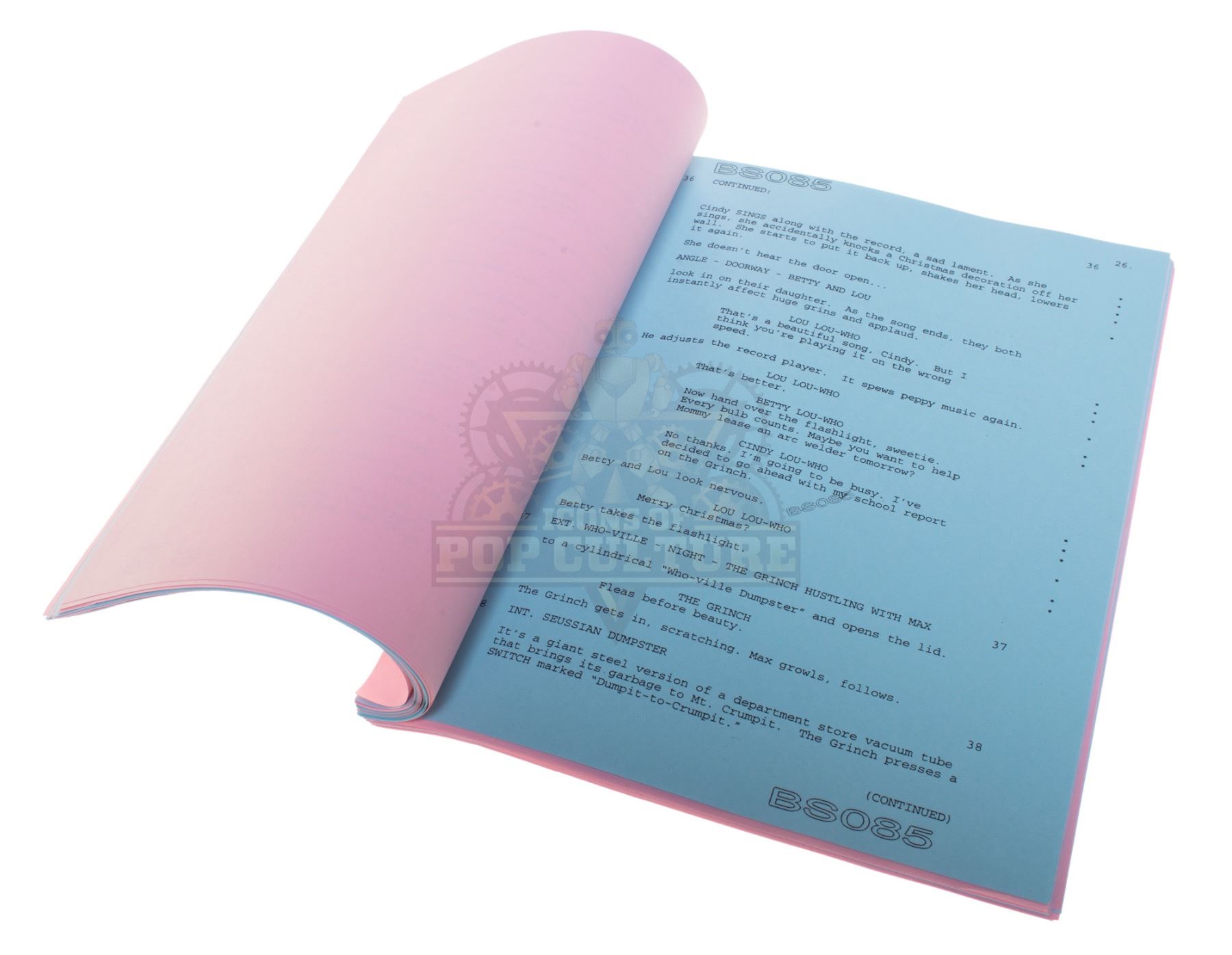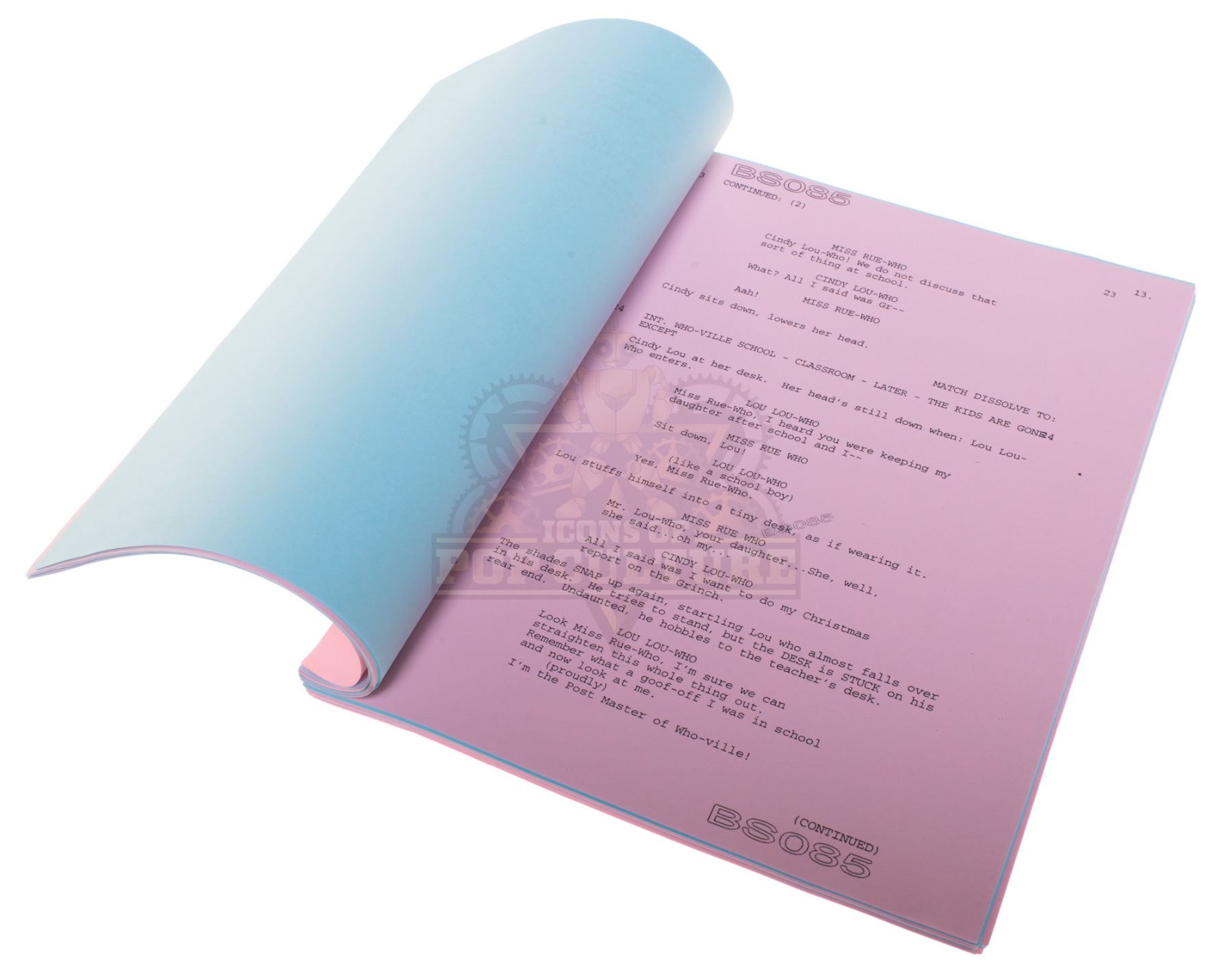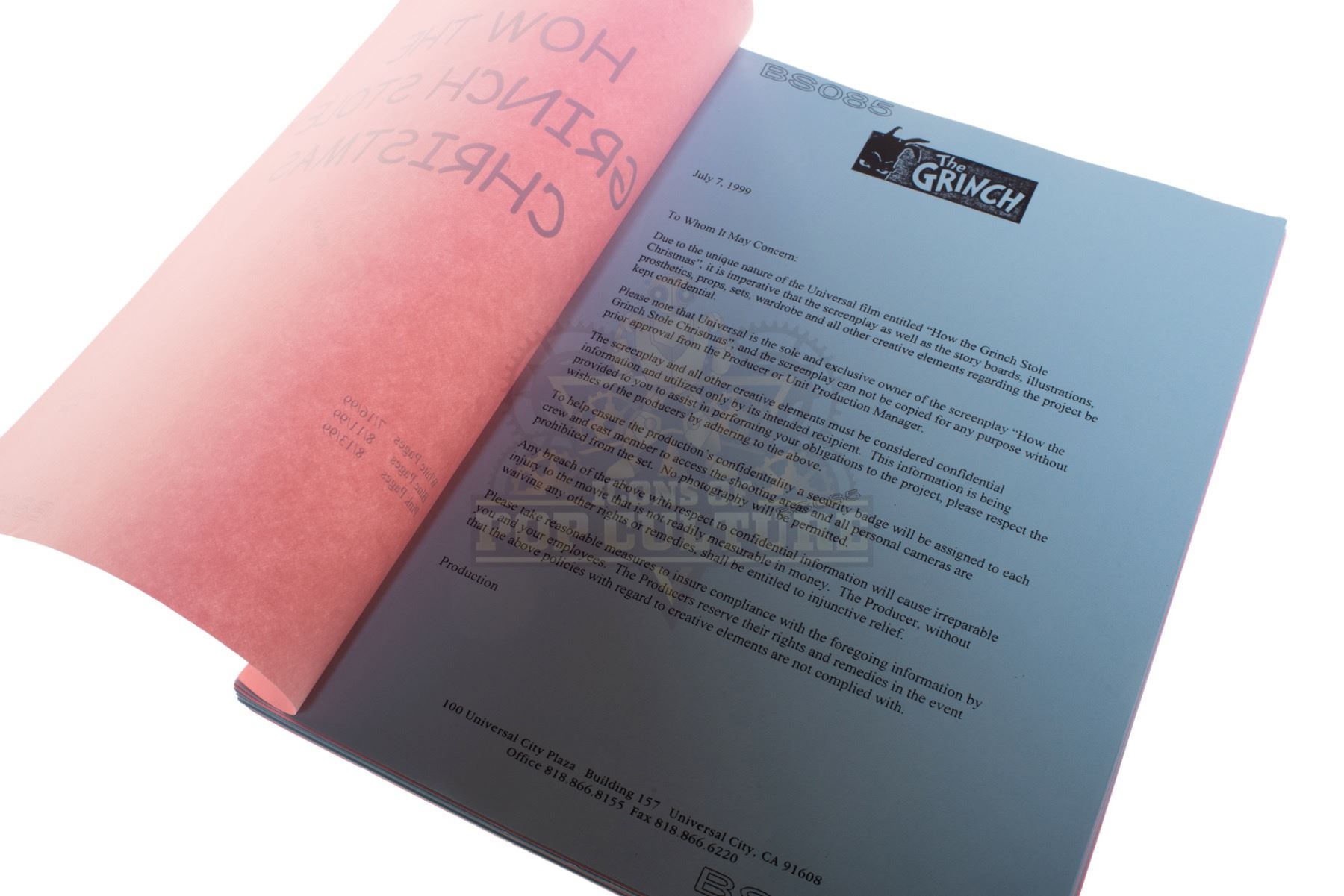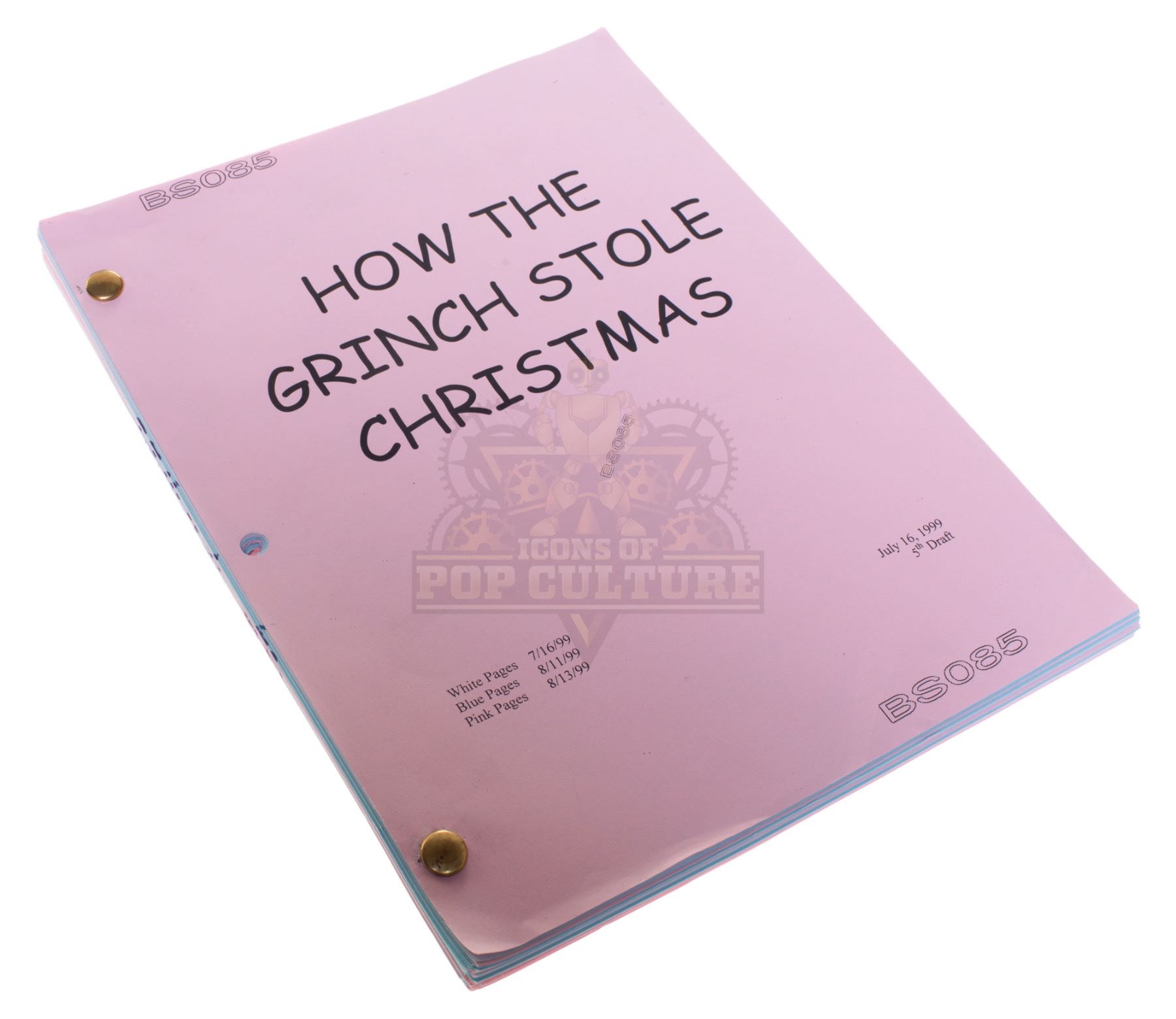 A 71-plus-page production used script. The script is titled “How The Grinch Stole Christmas” and is dated July 16, 1999. The script consists of pink and blue pages and is marked “BS085”